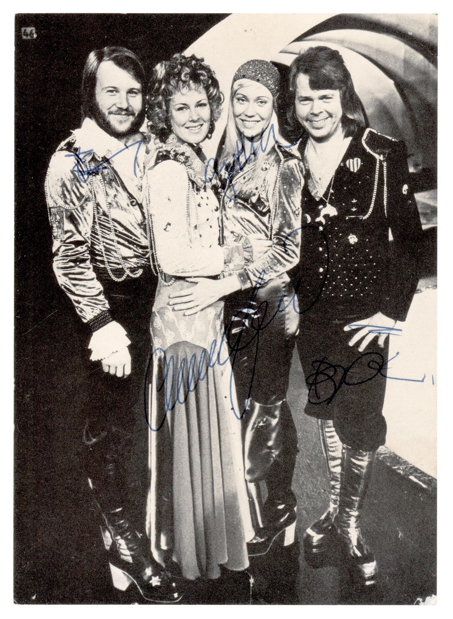 Early cardstock 4.25 x 5.75 Polar Music promo card of ABBA, signed in blue ballpoint by Agnetha Fältskog, Björn Ulvaeus, Benny Andersson, and Anni-Frid Lyngstad. Reverse features text promoting ABBA's first two albums, Ring Ring and Waterloo. In fine condition, with moderate signature contrast, and tiny pin holes to the corners.