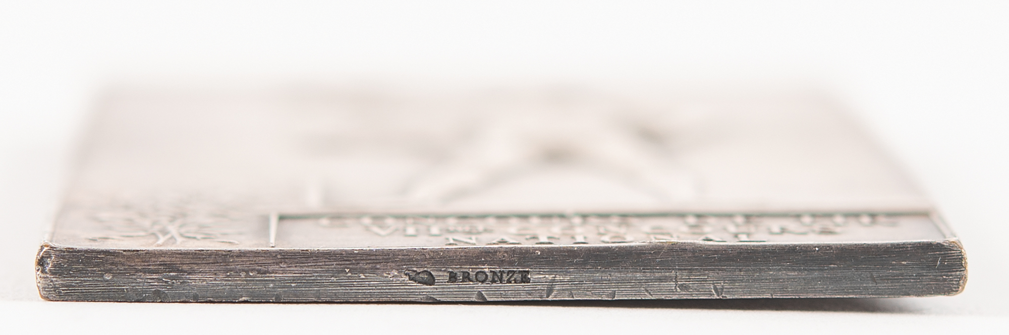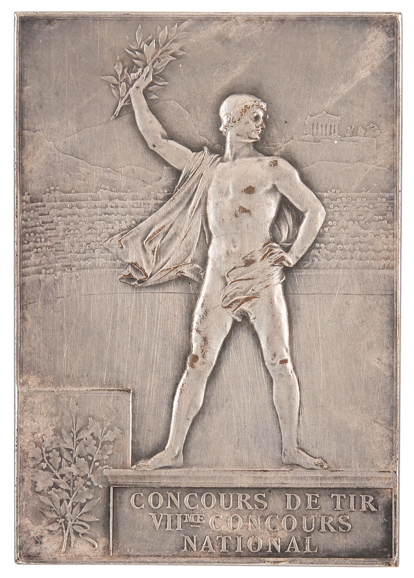 Attractive winner's medal issued for the Paris 1900 Olympics. Silvered bronze, 38 mm x 57 mm, 57 gm, by Frederic Vernon, Paris. The front, inscribed "Republique Francaise, Exposition Universelle, Paris 1900," features a winged goddess scattering laurels over the grounds of the Exposition; the reverse identifies the event as shooting, “Concours de Tir VIIme Concours National” [The 7th national shooting competition], and depicts a victorious athlete upon a podium. Stamped "Bronze" on the edge.