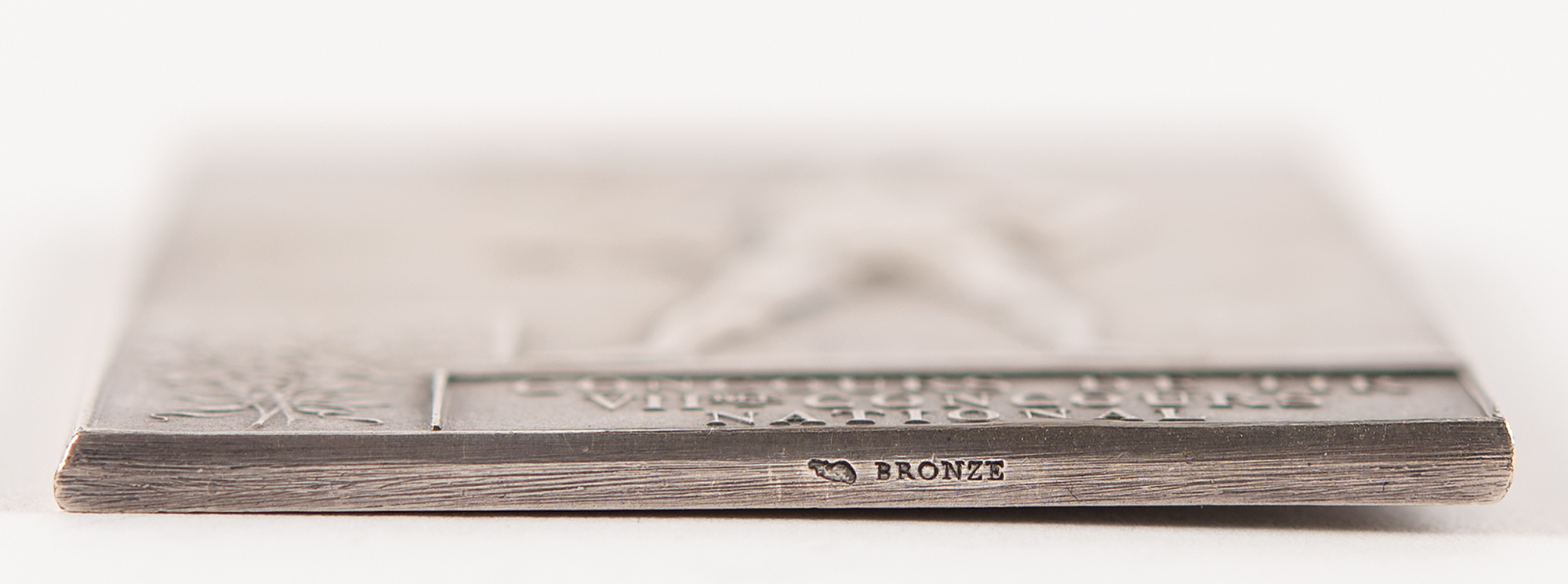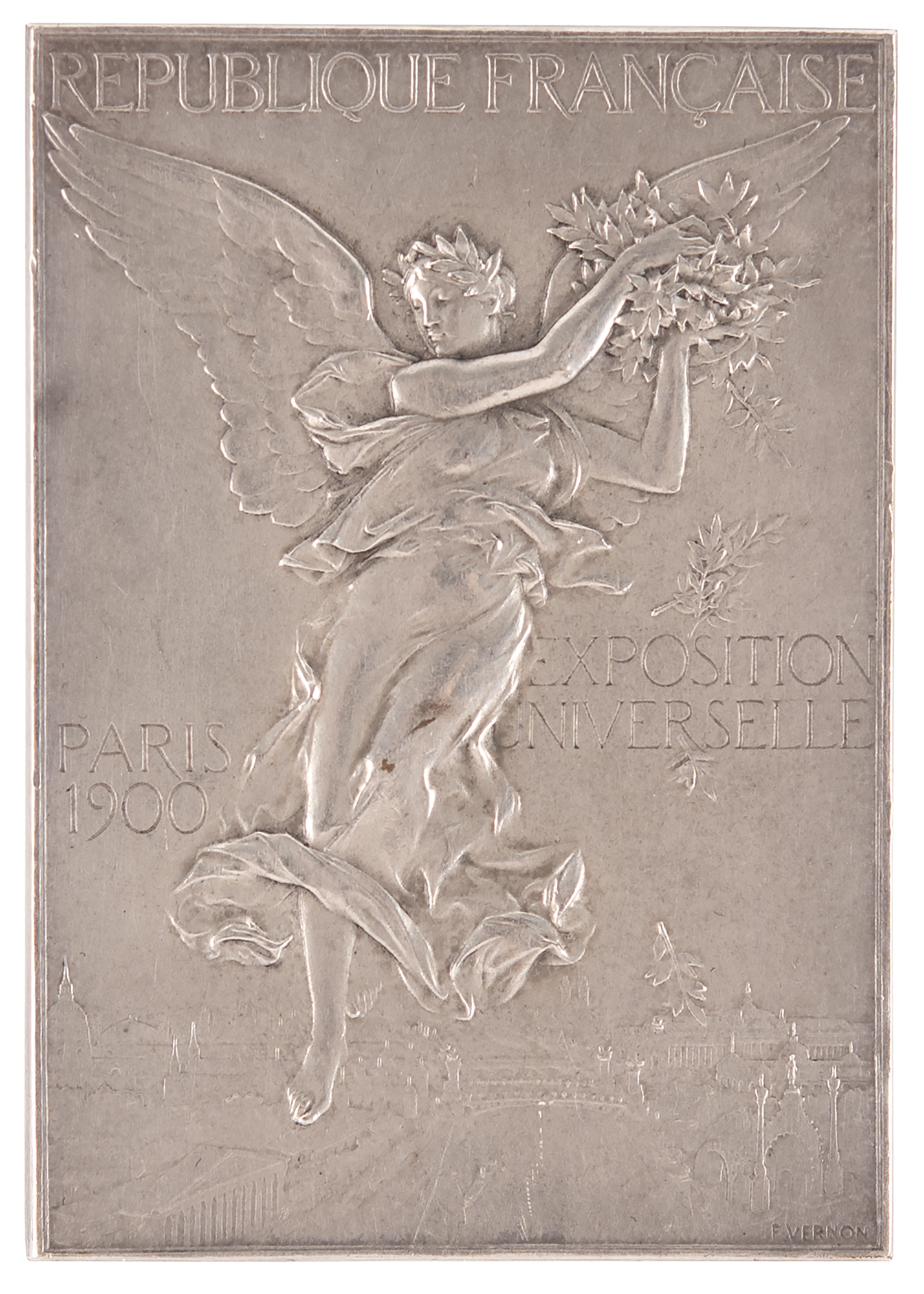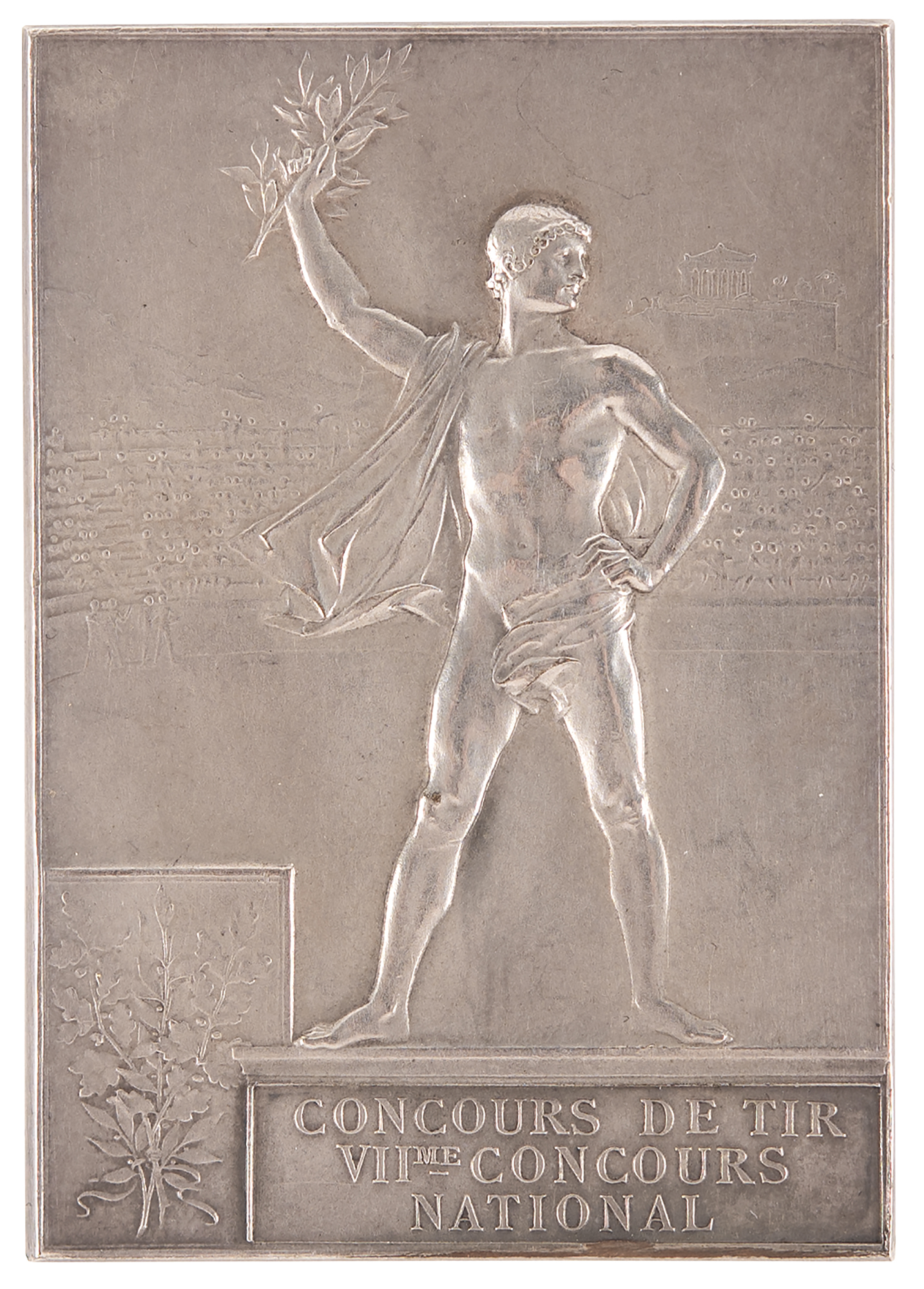 Scarce winner's medal issued for the Paris 1900 Olympics. Silvered bronze, 38 mm x 57 mm, 57 gm, by Frederic Vernon, Paris. The front, inscribed "Republique Francaise, Exposition Universelle, Paris 1900," features a winged goddess scattering laurels over the grounds of the Exposition; the reverse identifies the event as shooting, “Concours de Tir VIIme Concours National” [The 7th national shooting competition], and depicts a victorious athlete upon a podium. Stamped "Bronze" on the edge.