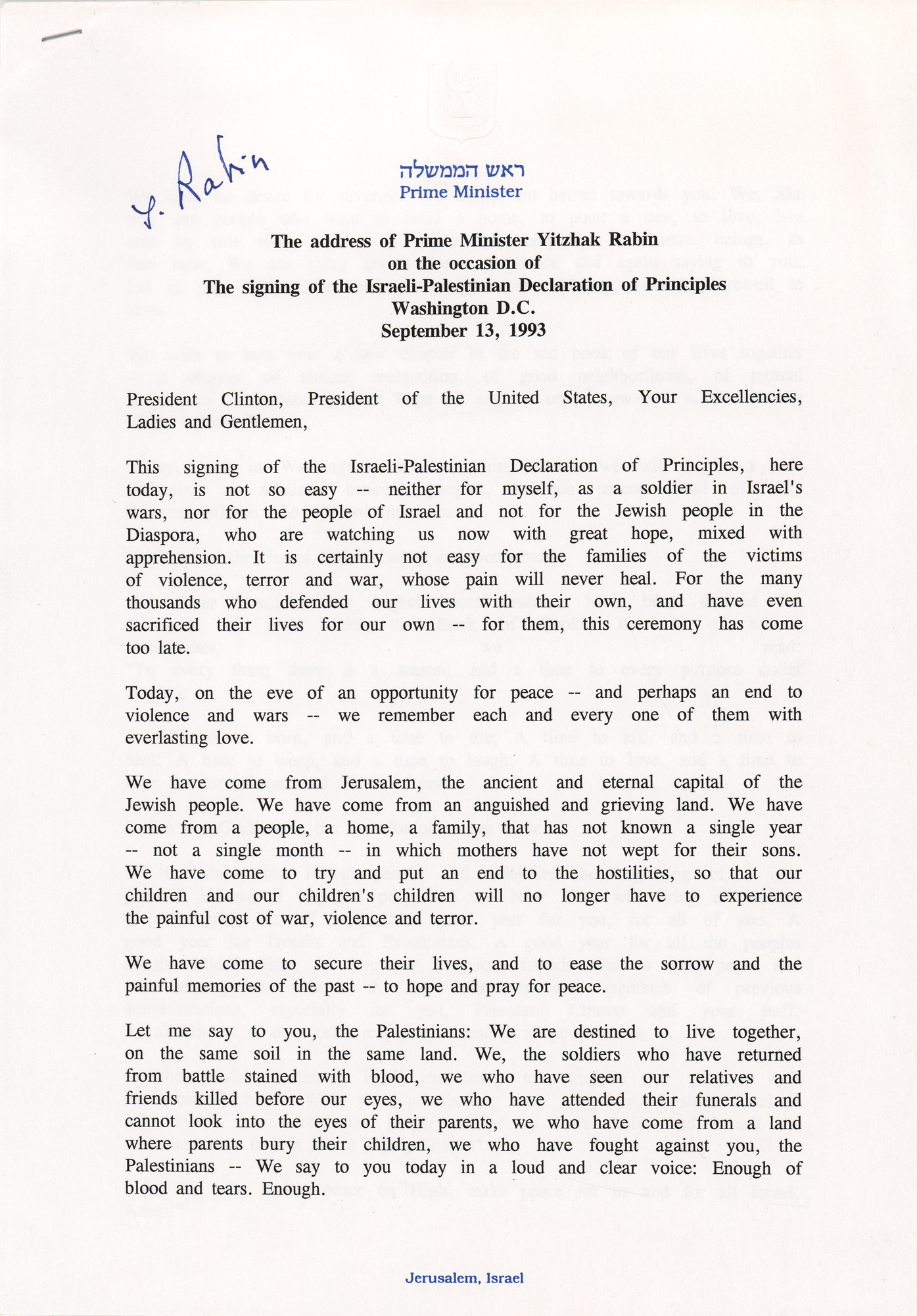 Let me say to you, the Palestinians: We are destined to live together, on the same soil in the same land. We, the soldiers who have returned from battle stained with blood, we who have seen our relatives and friends killed before our eyes, we who have attended their funerals and cannot look into the eyes of their parents, we who have come from a land where parents bury their children, we who have fought against you, the Palestinians—We say to you today in a loud and clear voice: Enough of blood and tears. Enough.