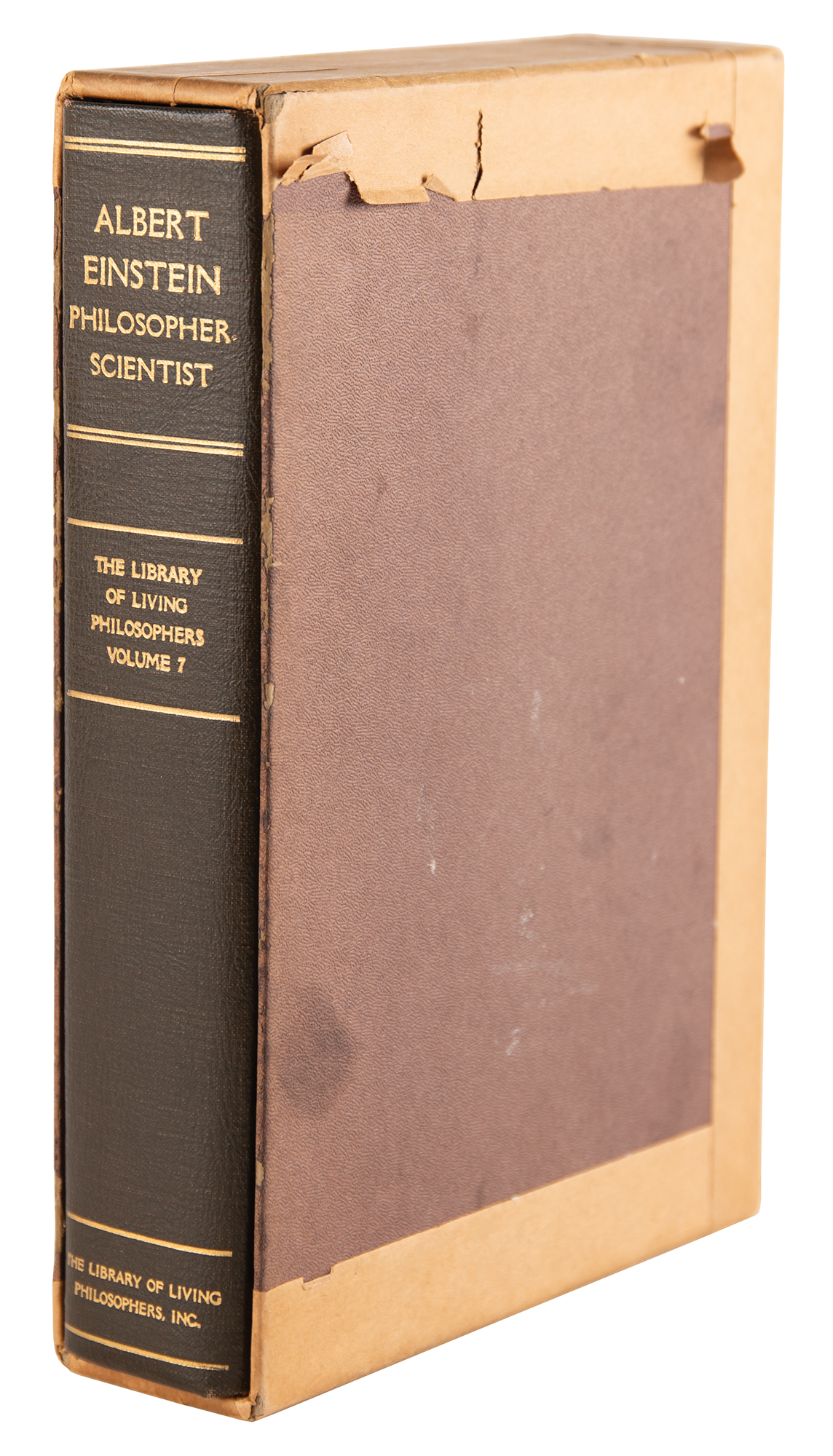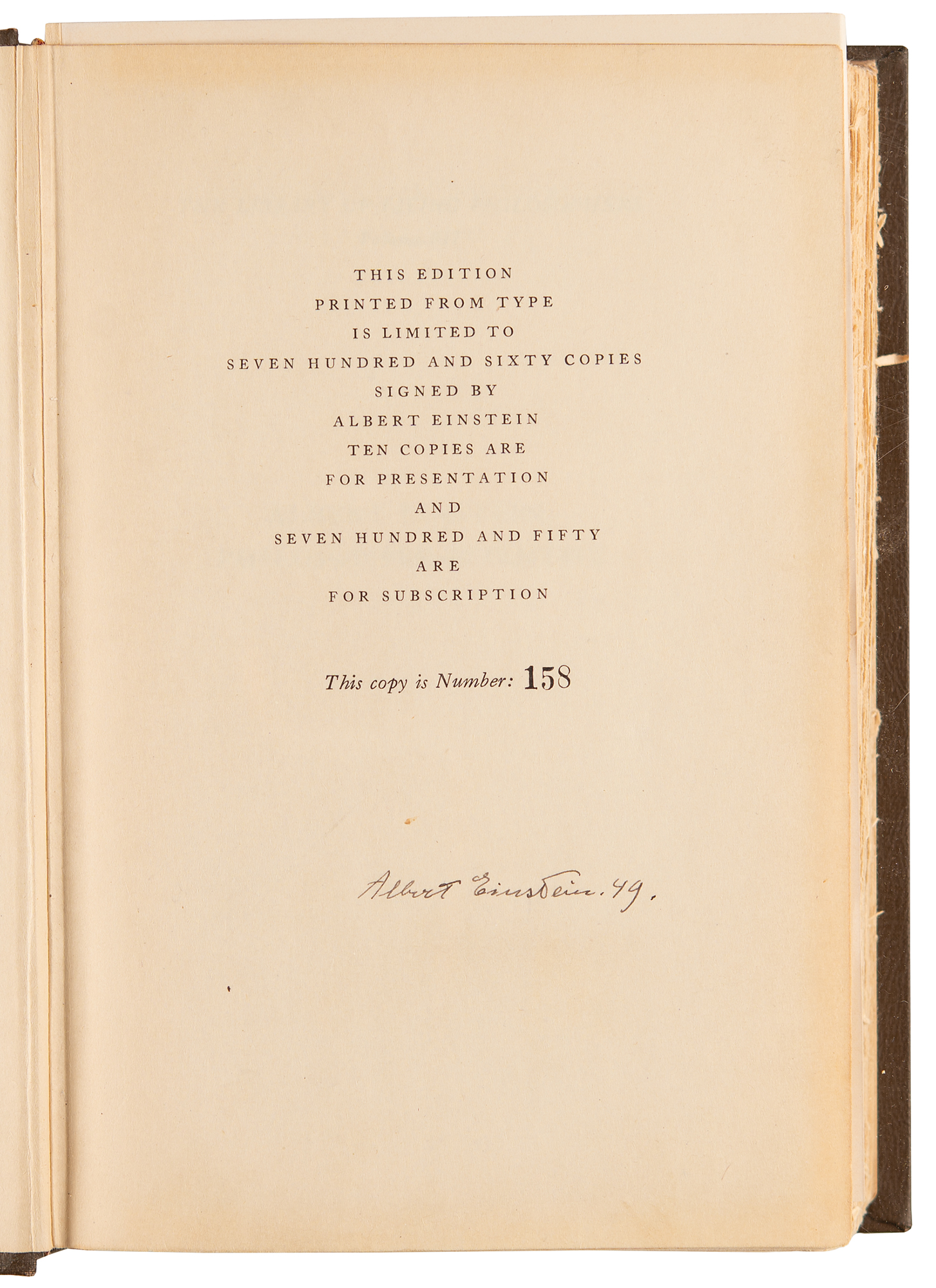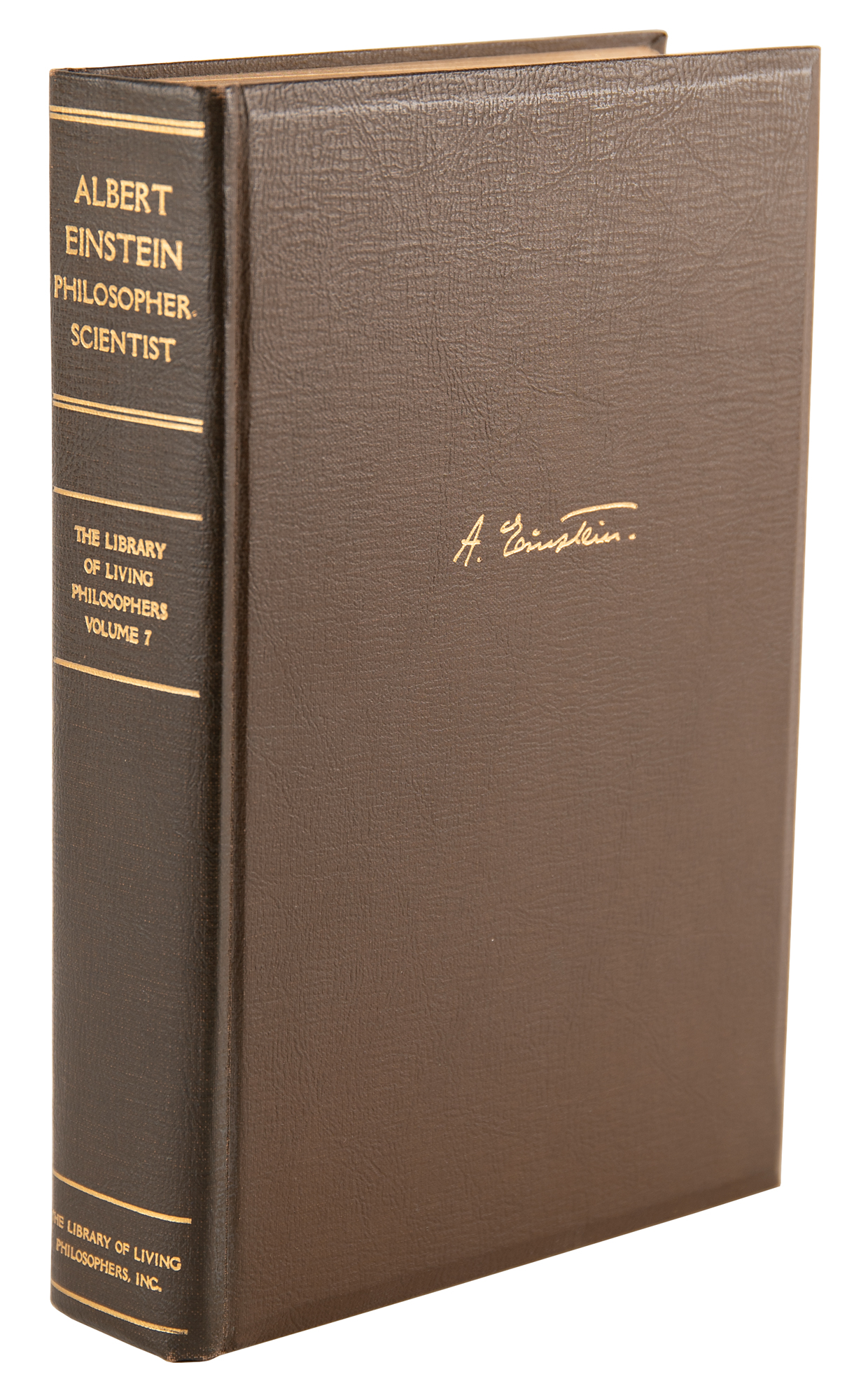 Rare signed book: Albert Einstein: Philosopher-Scientist, Volume VII of the Influential Library of Living Philosophers book series, edited by Paul Arthur Schlipp. Limited first edition, numbered 158 of 750 subscription copies. Evanston, Illinois: Northwestern University, 1949. Chocolate-brown leatherette hardcover with slipcase, 6.75 x 9.75, 781 pages. Signed neatly on the colophon in black ink, “Albert Einstein, 49.” Autographic condition: fine. Book condition:VG/None in a G- slipcase, with the frontispiece portrait of Einstein by Yousef Karsh (with facsimile signature) detached but present; the slipcase is reinforced with tape on the edges and exhibits some staining.