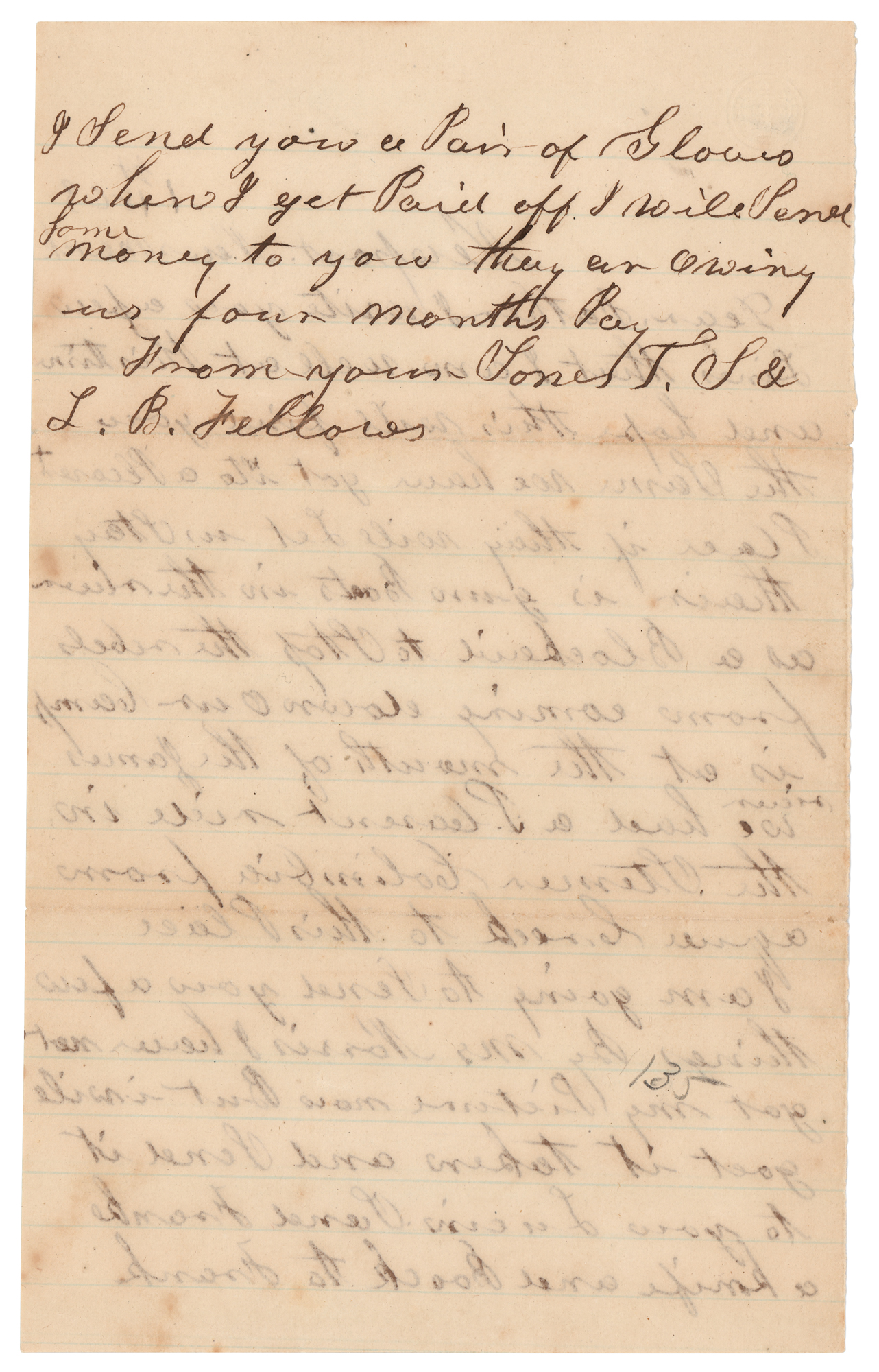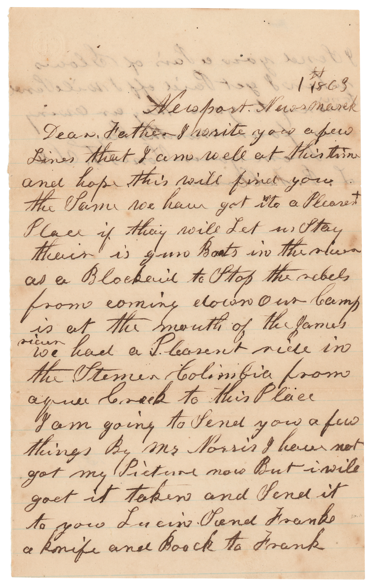 Shared ALS from Union soldiers and brothers T. J. and L. B. Fellows during the Civil War, one page, both sides, 4.75 x 7.75, dated March 1, 1863, addressed from Newport News, Virginia. The handwritten letter reads, in part: “Dear Father, I write you a few lines that I am well at this time and hope this will find you the same. We have got into a pleasant place if they will let us stay. There is gun boats in the river as a blockade to stop the rebels from coming down. Our camp is at the mouth of the James River. We had a pleasant ride in the Steamer Columbia.” In fine condition.