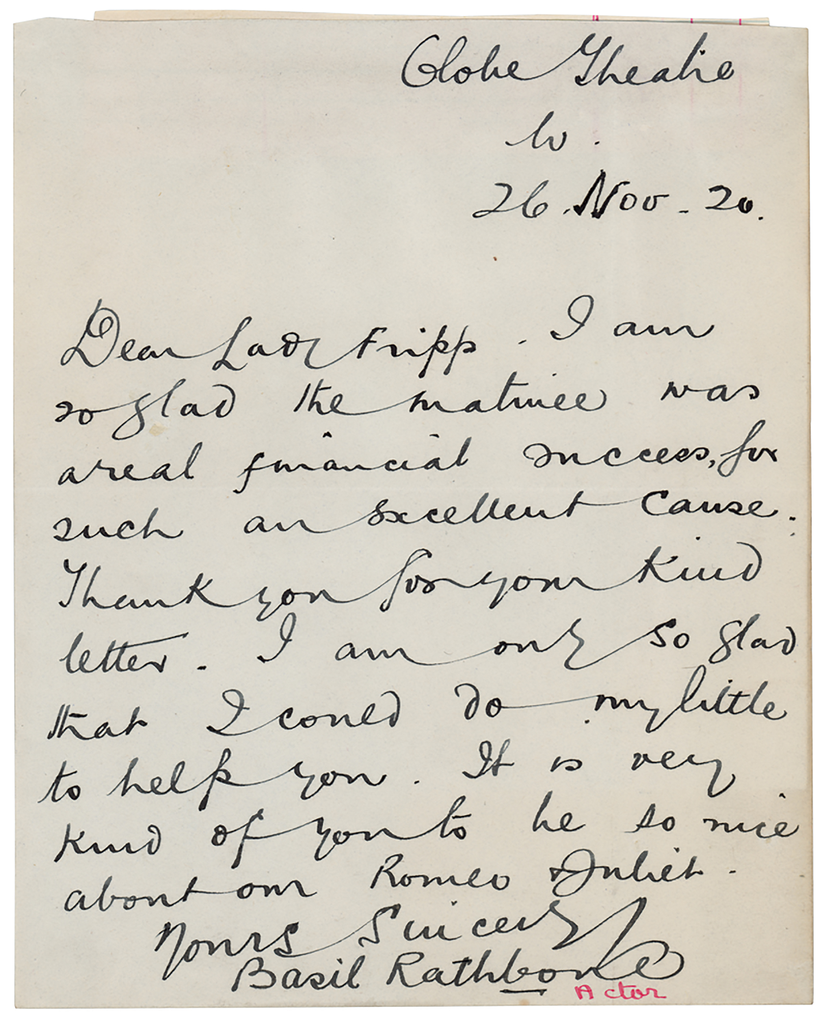 ALS, one page, 5.25 x 6.5, November 26, 1920. Handwritten letter to "Lady Fripp" from the "Globe Theatre," in part: "I am so glad the matinee was a real financial success, for such an excellent cause. Thank you for your kind letter…It is very kind for you to be so nice about our Romeo & Juliet." In fine condition.