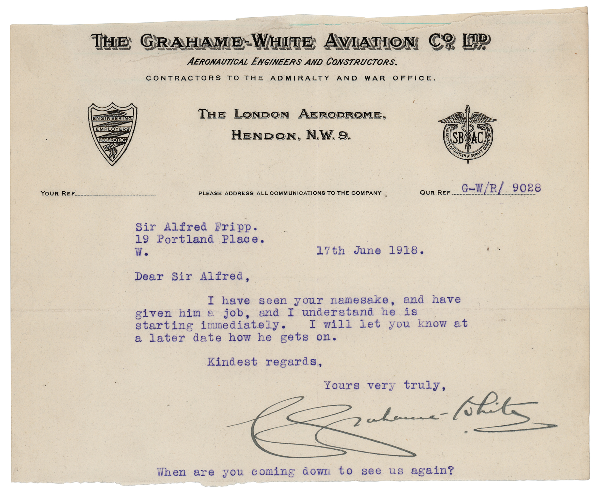 Pioneering British aviator (1879–1959) who was the first to make a night flight, and is remembered for his activities related to the commercialization of aviation, and the promotion of the military application of air power before the First World War with a campaign called 'Wake Up Britain.' TLS signed “C. Grahame-White,” one page, 8 x 6.5, The Grahame-White Aviation Co. Ltd. letterhead, June 17, 1918. Letter to Sir Alfred Fripp, in part: "I have seen your namesake, and have given him a job, and I understand he is starting immediately. I will let you know at a later date how he gets on." In fine condition, with trimmed edges.