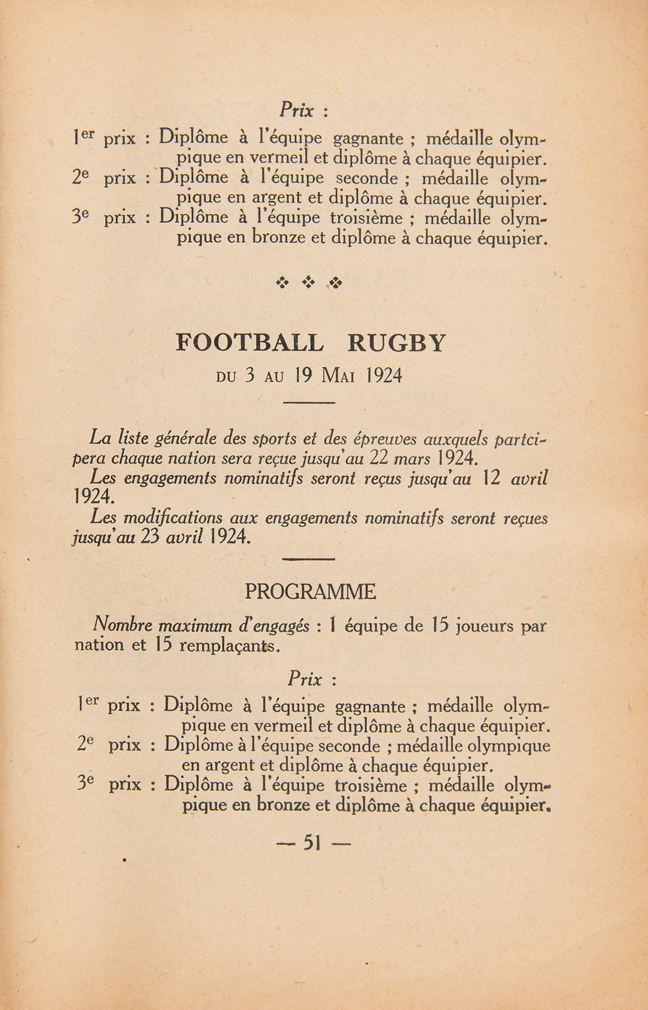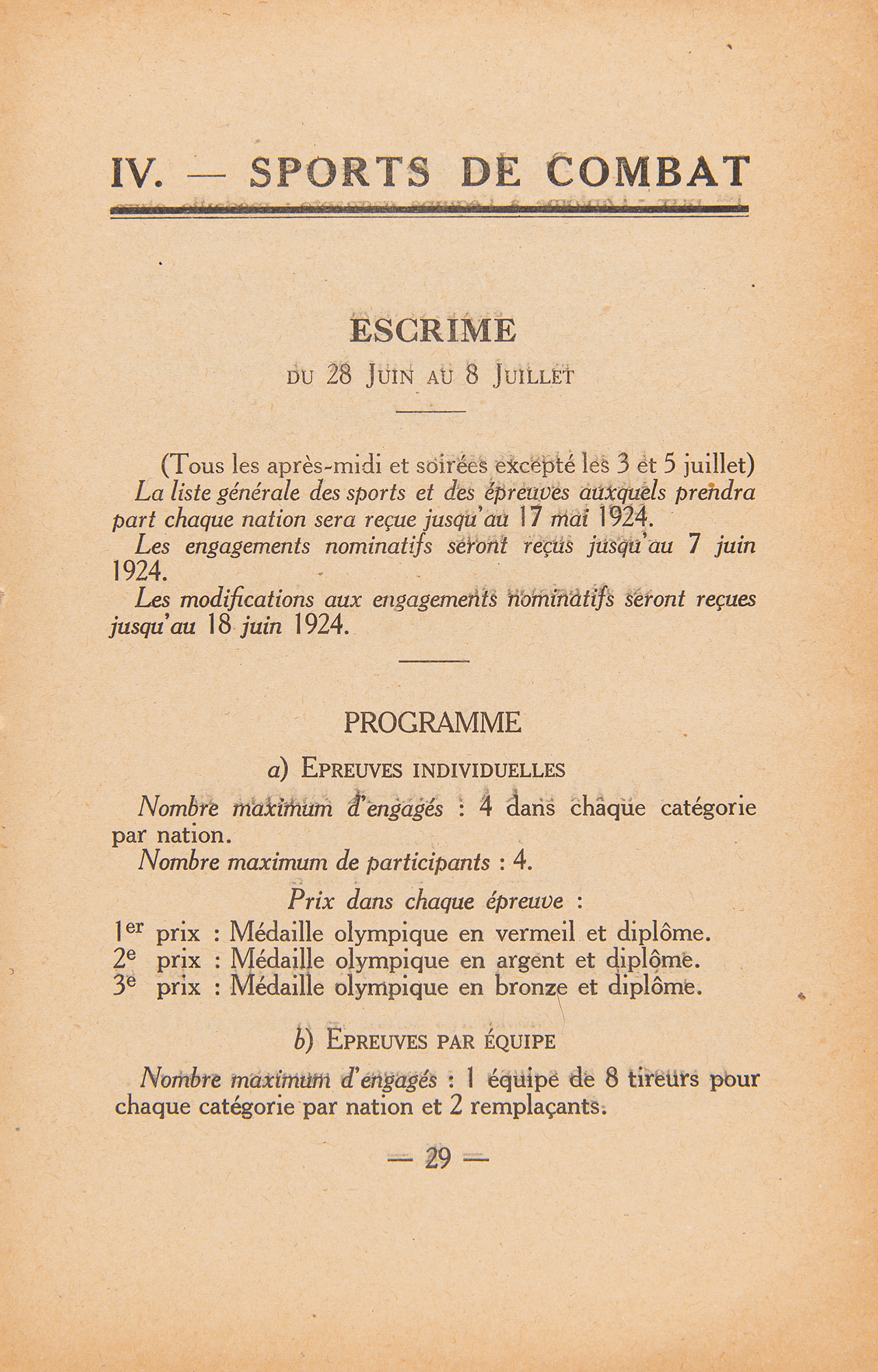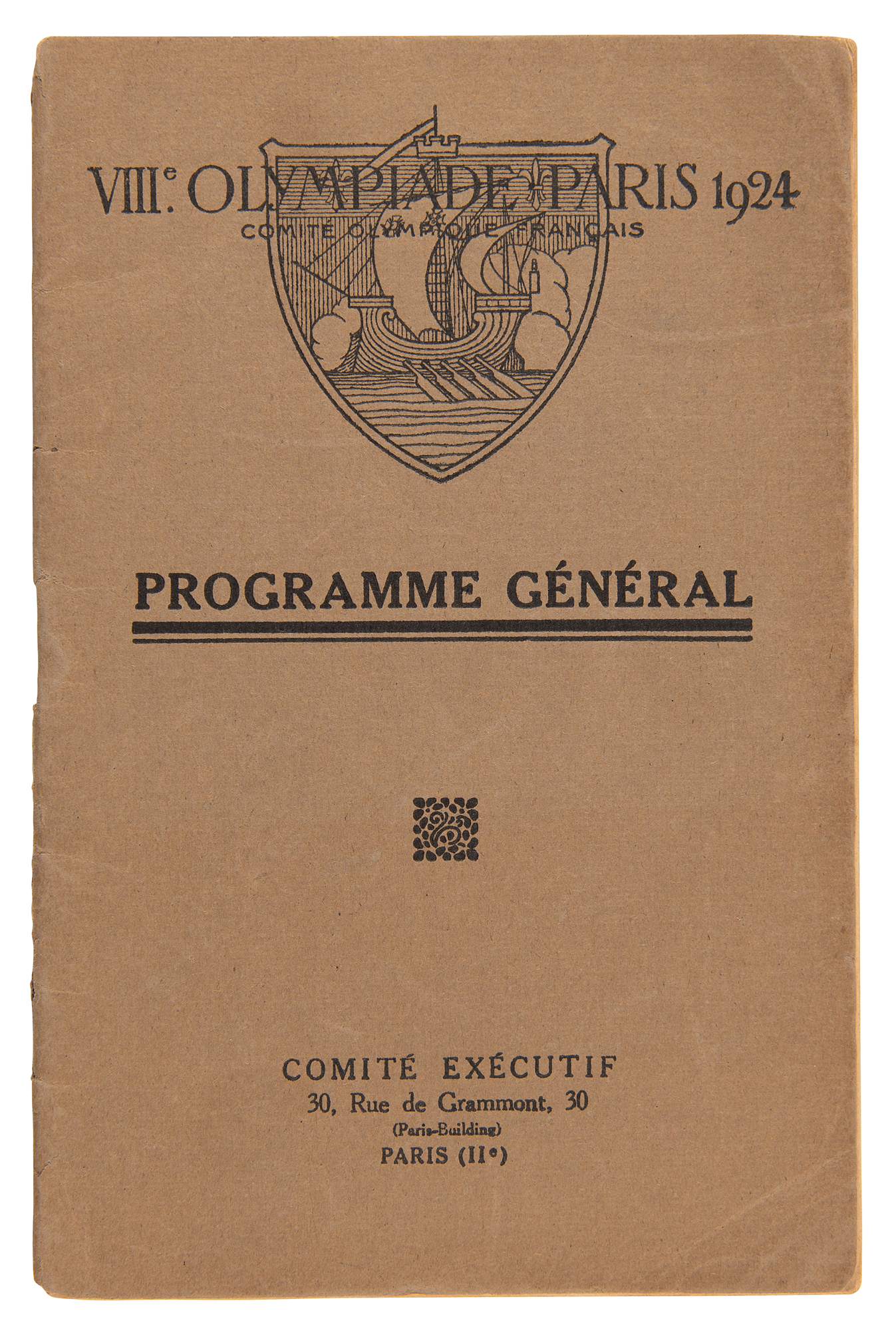 Scarce original French-language general program for the Paris 1924 Summer Olympics, 52 pages, 4.5 x 7, published by the Olympic Executive Committee. The program contains a list of general rules, the names of the International Olympic Committee (including President Pierre de Coubertin), and 10 sections for Athletics, Cycling, Gymnastics, Combat Sports, Nautical Sports, Equestrian, Pentathlon, Games, and Demonstration Sports and Games. In fine condition, with partial separation to the spine. An exceptional 100-year-old keepsake from the historic Parisian Games.
