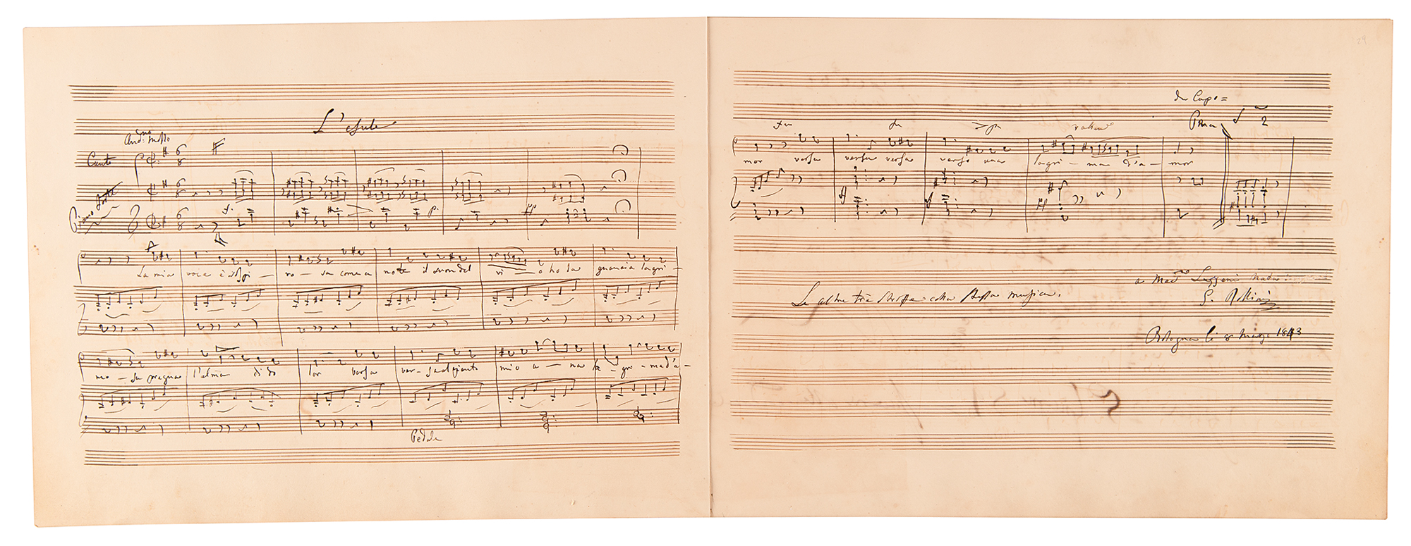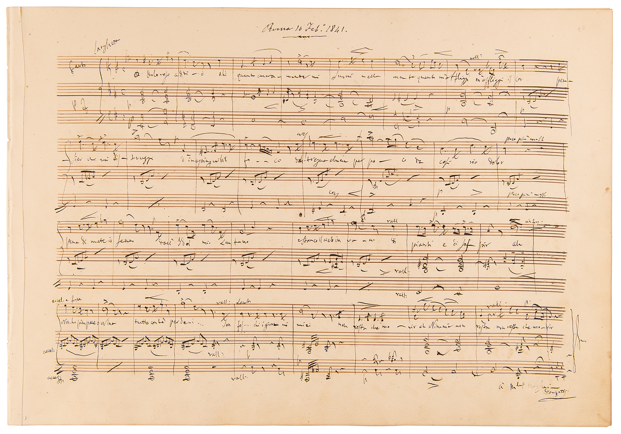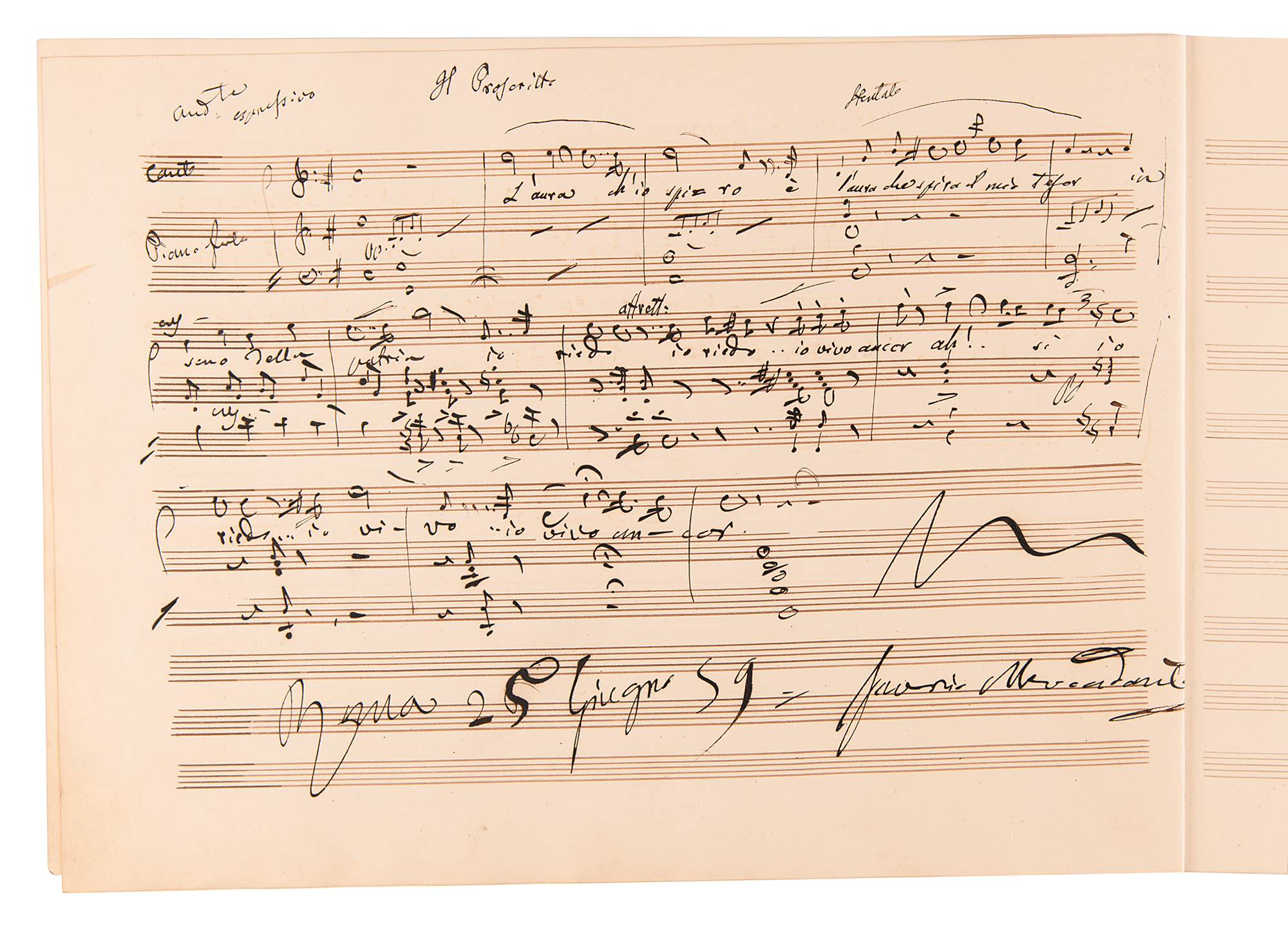Booklet of three ample AMQSs from esteemed Italian composers Gaetano Donizetti, Gioachino Rossini, and Saverio Mercadante, penned in ink on the front and back of two off-white 16 x 11 sheets of music paper, with each composer adding lyrics to their impressive arrangements. The front sheet is comprised of Donizetti’s lengthy handwritten musical quotation that contains approximately 100 bars of music for an unidentified piece, signed and inscribed in the lower right, “Donizetti,” who adds the date above, “Roma, 10 Feb. 1841,” the day before he premiered his opera Adelia at the Teatro Apollo in Rome. The Rossini AMQS constitutes the two interior pages and contains over 60 bars of music from the arietta ‘L’esule,’ signed and inscribed at the conclusion, “G. Rossini, Bologna 8 Marzo 1843”; and the Mercadante AMQS features a total of 36 bars of music from his 1842 opera “Il Proscritto,” signed prominently below, “Roma, 25 Giugno 59, Saverio Mercadante.” In overall fine condition, with the names of the two inscriptions scratched out. Musical quotations from any one of these three classical figures are cause for excitement; that all three are together in one shared space, with each man offering an extensive musical composition, signifies a special occurrence.