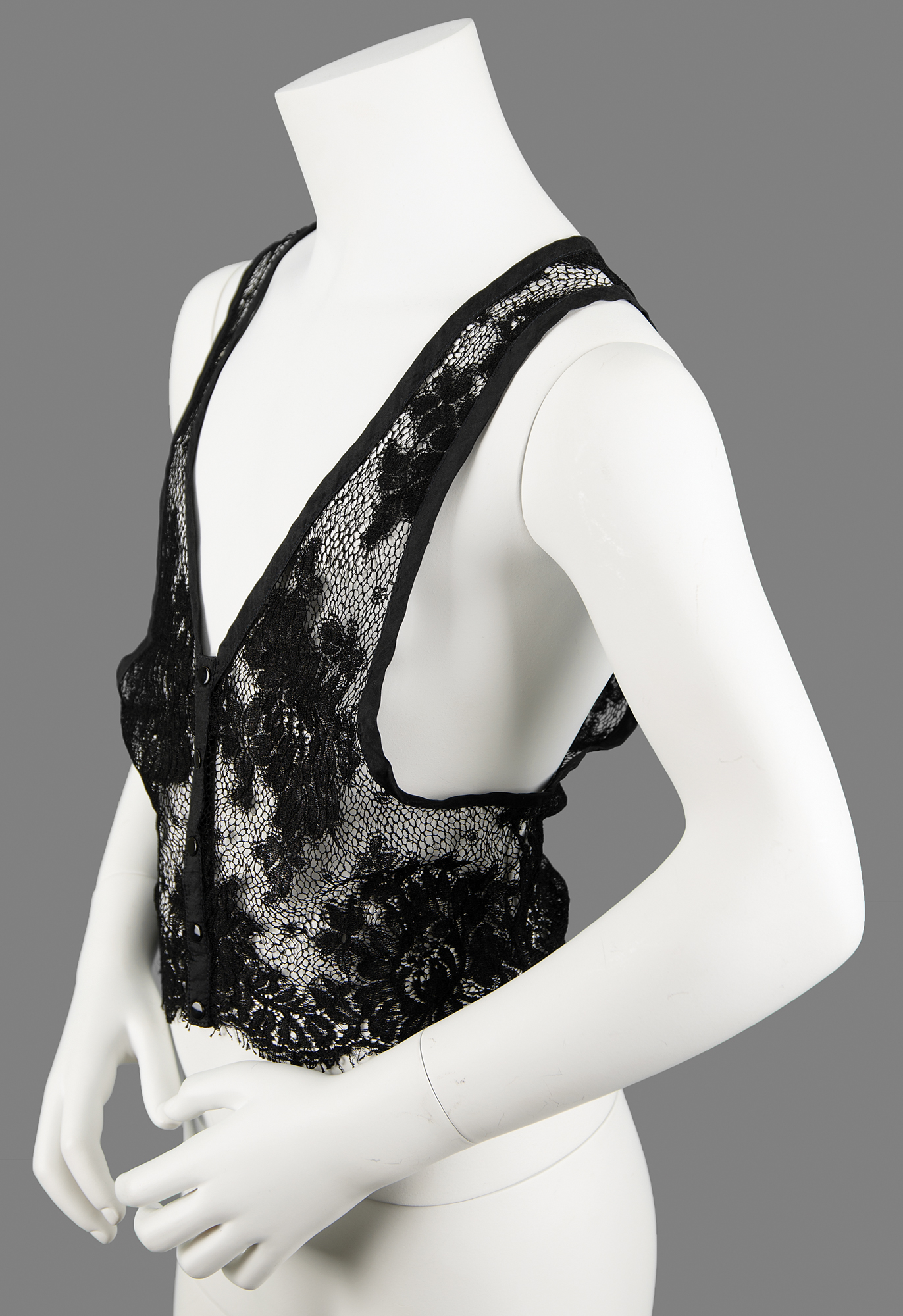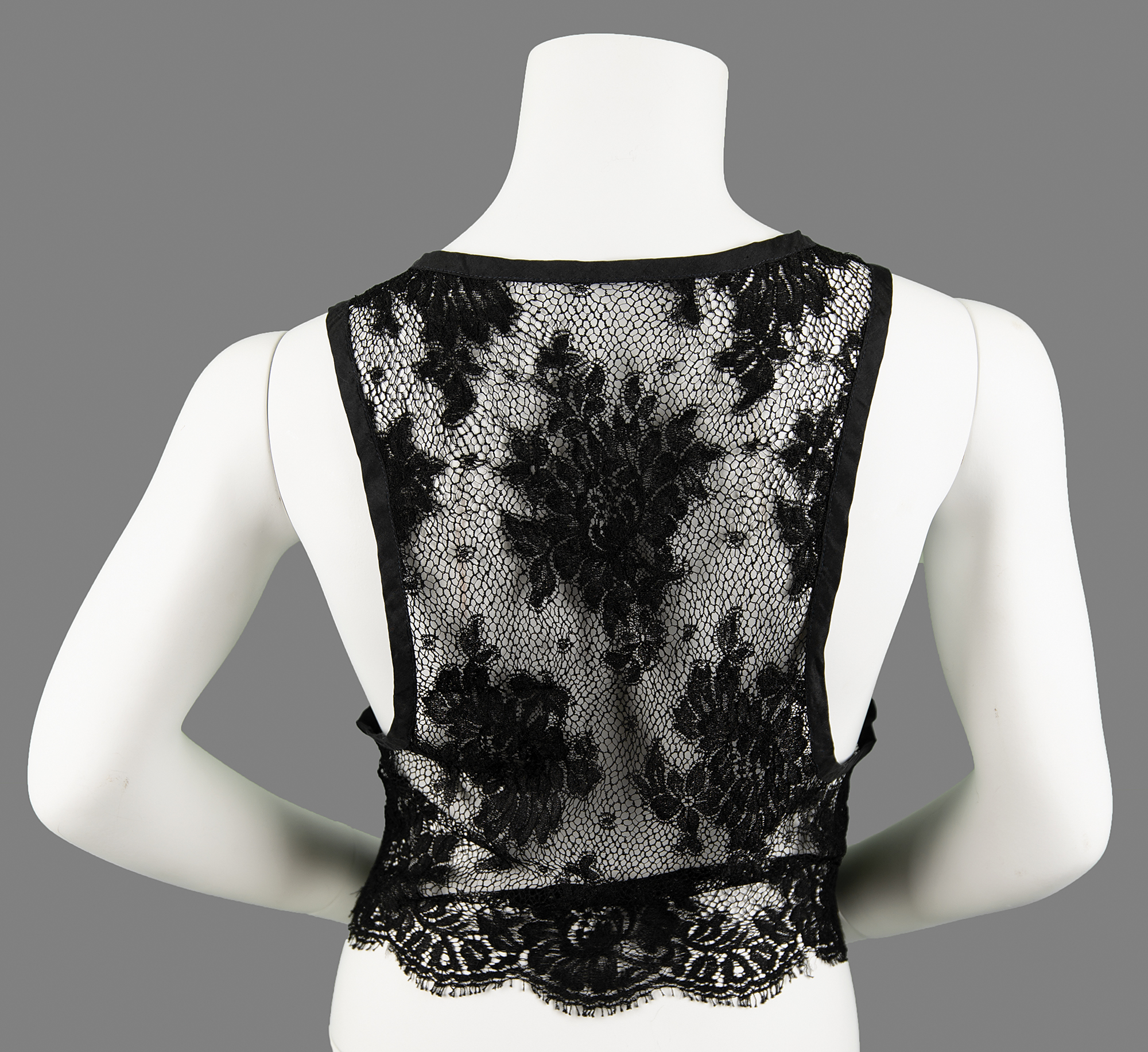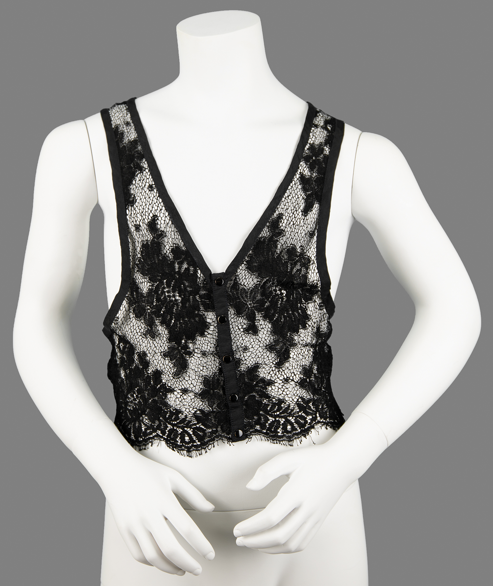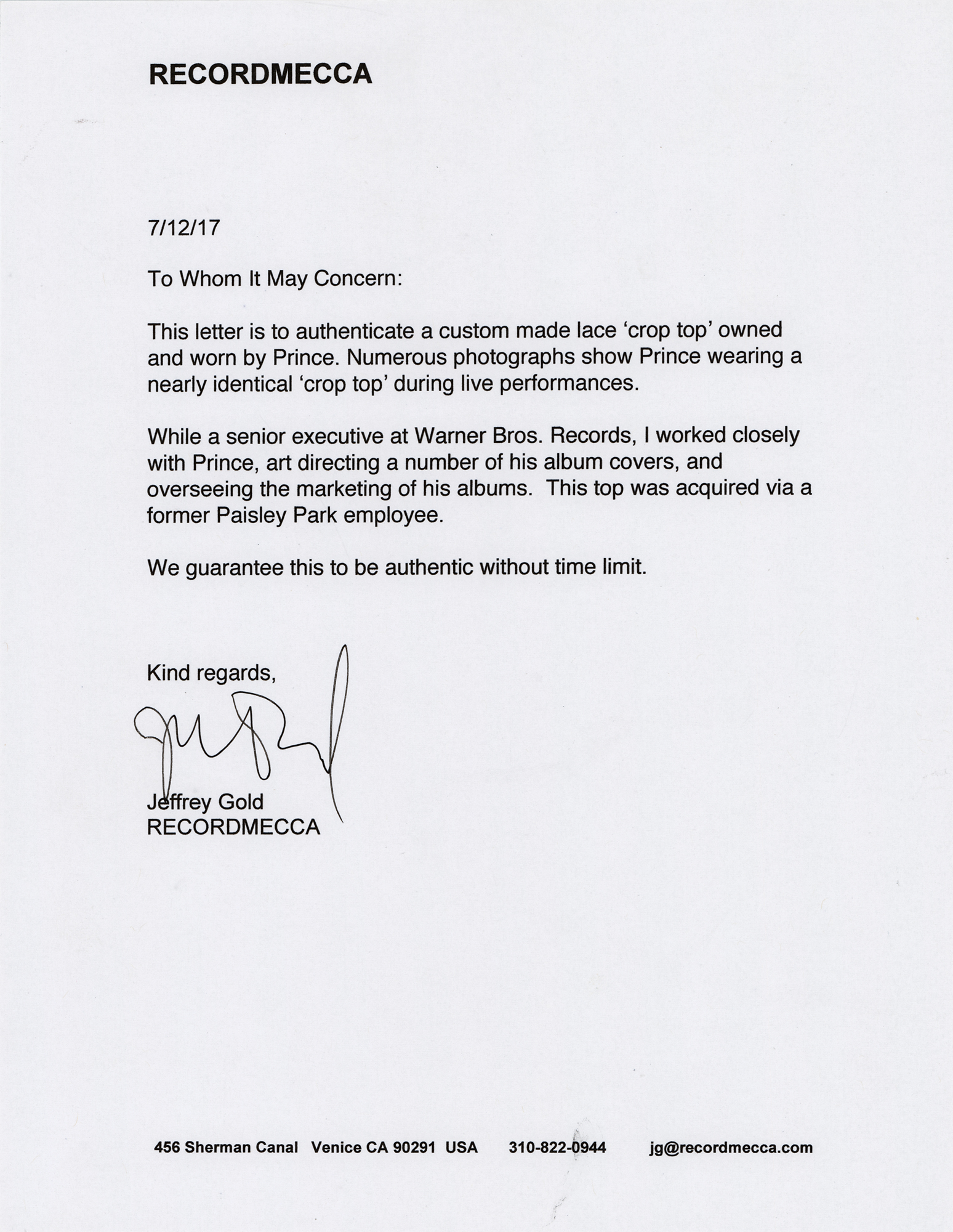 Prince's personally-owned and -worn black lace crop top vest with five snap buttons on the front, constructed of a thin black lace with floral designs. In fine condition. Prince regularly wore this type of lace vest from the mid-1980s through the early 90s, and is seen in numerous photos wearing nearly identical vests of the same cut and construction, but with the lace pattern appearing slightly different. Includes a letter of authenticity from Jeff Gold, the owner of Recordmecca and a former executive vice president/general manager of Warner Bros. Records, who worked closely with Prince during the 1990s, and art directed numerous album covers for him, including ‘Diamonds & Pearls,’ ’Love Symbol,’ and ‘The Hits/The B-Sides.’ He writes, in part: "This letter is to authenticate a custom made lace 'crop top' owned and worn by Prince. Numerous photographs show Prince wearing a nearly identical 'crop top' during live performances…This top was acquired via a former Paisley Park employee." A prime example of Prince's unique fashion sense.