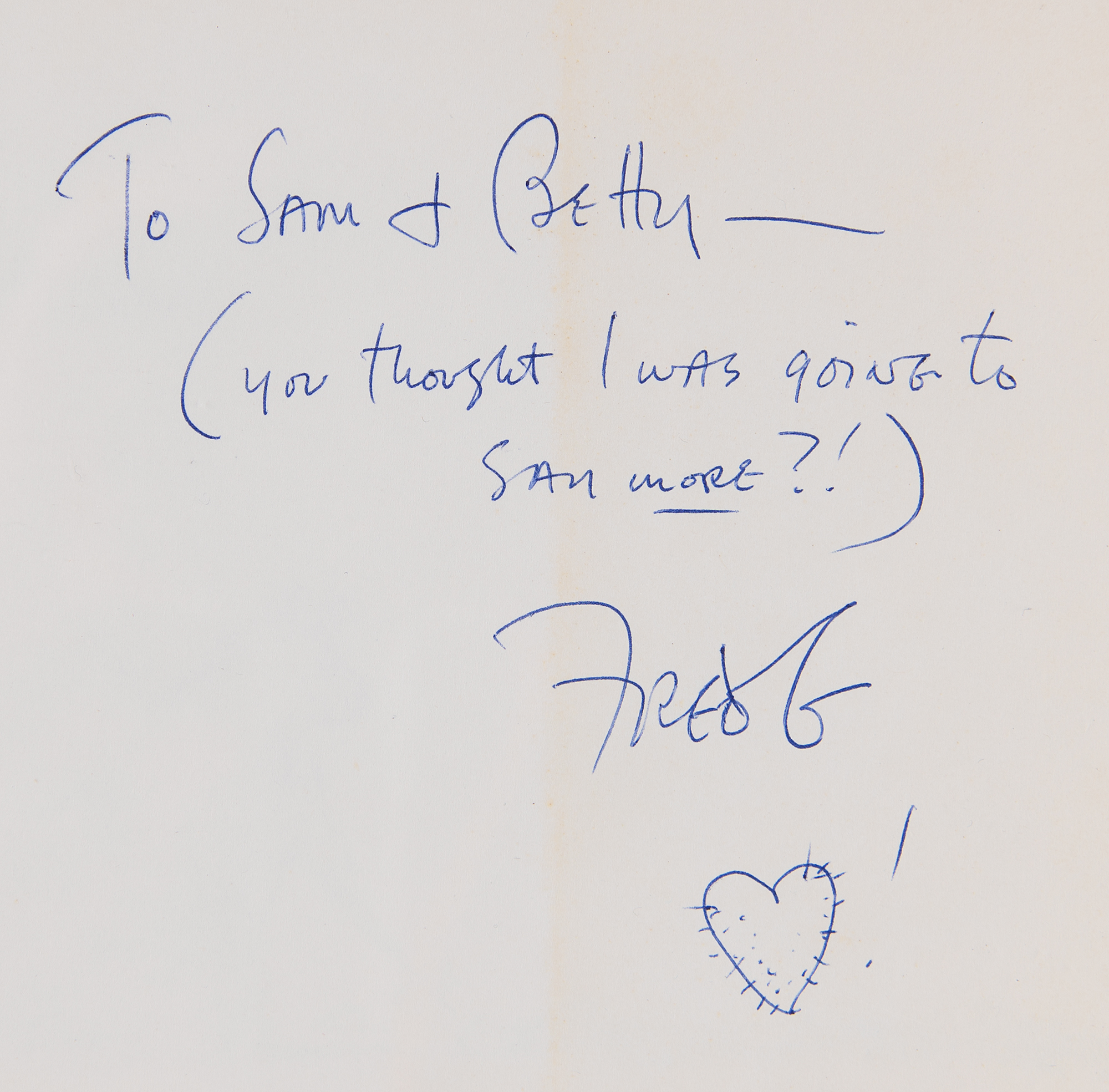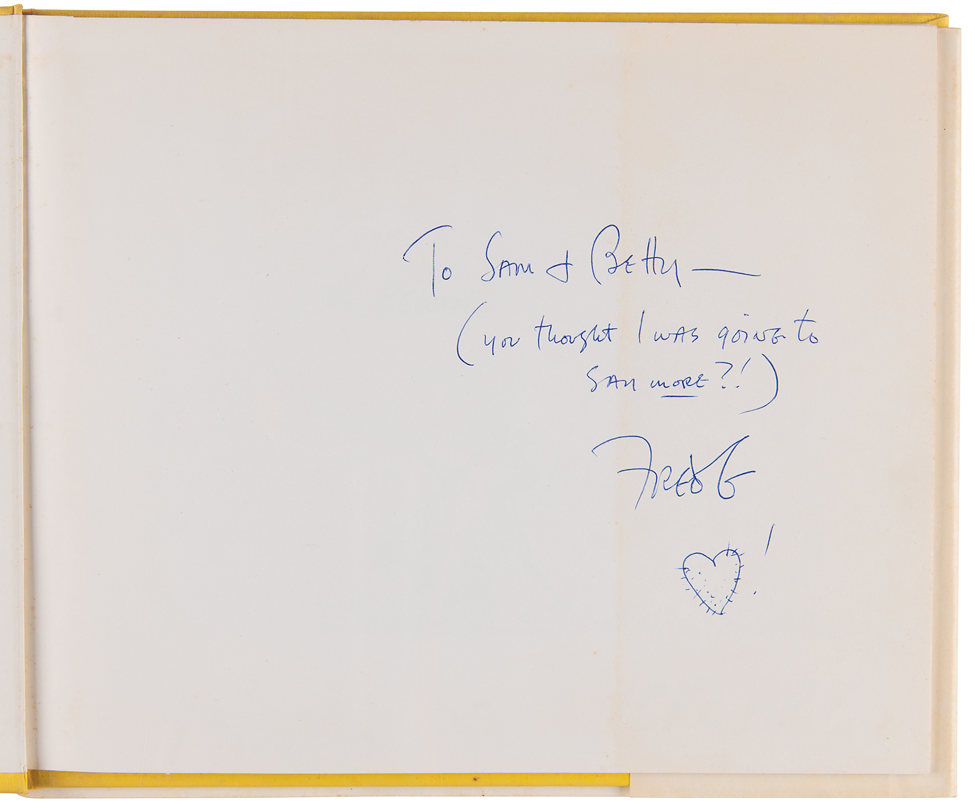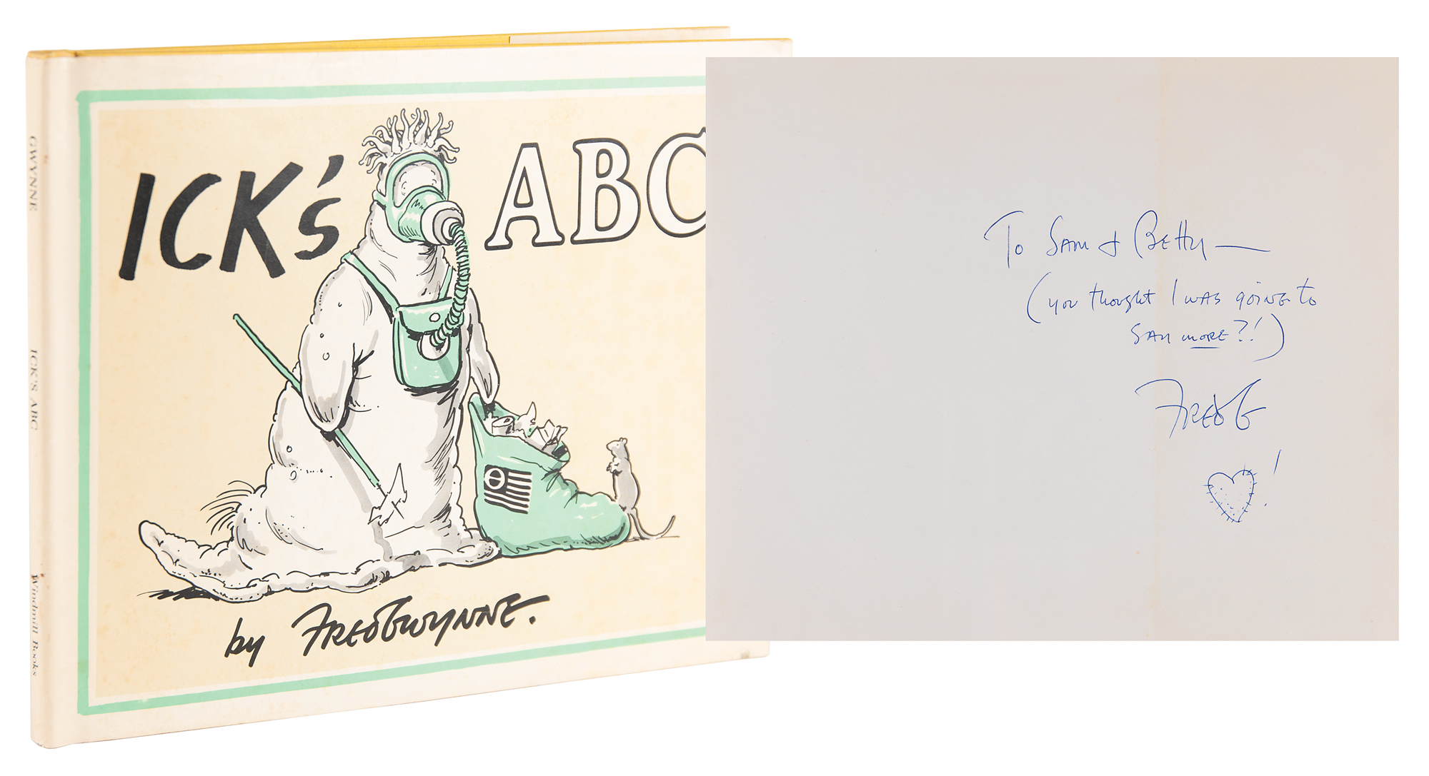 Signed book: Ick's ABC. First edition. NY: Windmill Books, 1971. Hardcover with dust jacket, 10.25 x 8.25, 32 pages. Signed and inscribed on the first free end page in blue ballpoint, "To Sam & Betty—(you thought I was going to say more?!), Fred G.," sketching a heart below. In very good to fine condition, with light foxing and staining to the dust jacket, and a subtle band of toning over part of the signed page. Consignor notes that Gwynne signed the book for a friend, the noted equestrian artist Sam Savitt.