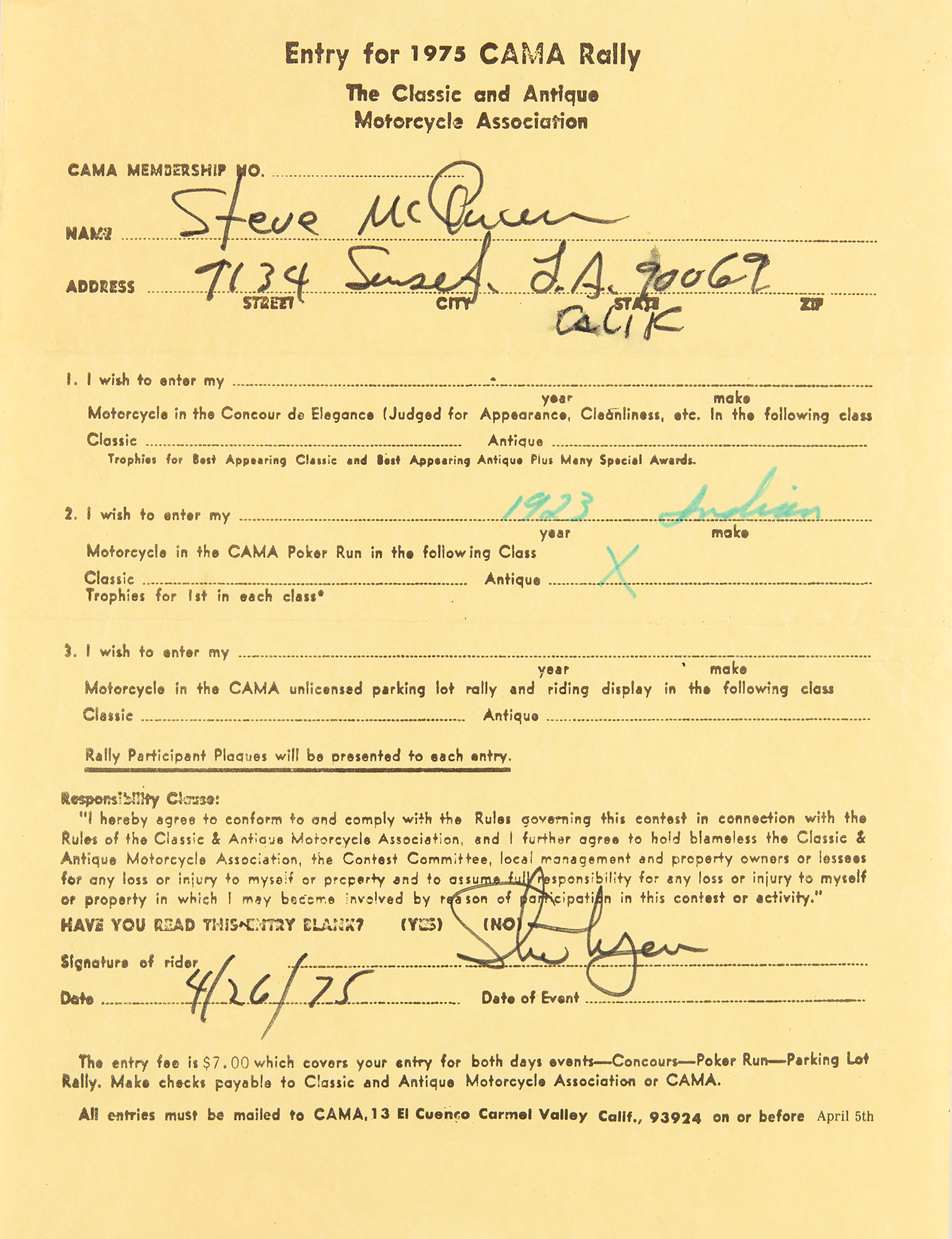Steve McQueen Twice-Signed Document - 1975 CAMA Rally Entry Form for His '1923 Indian' Motorcycle