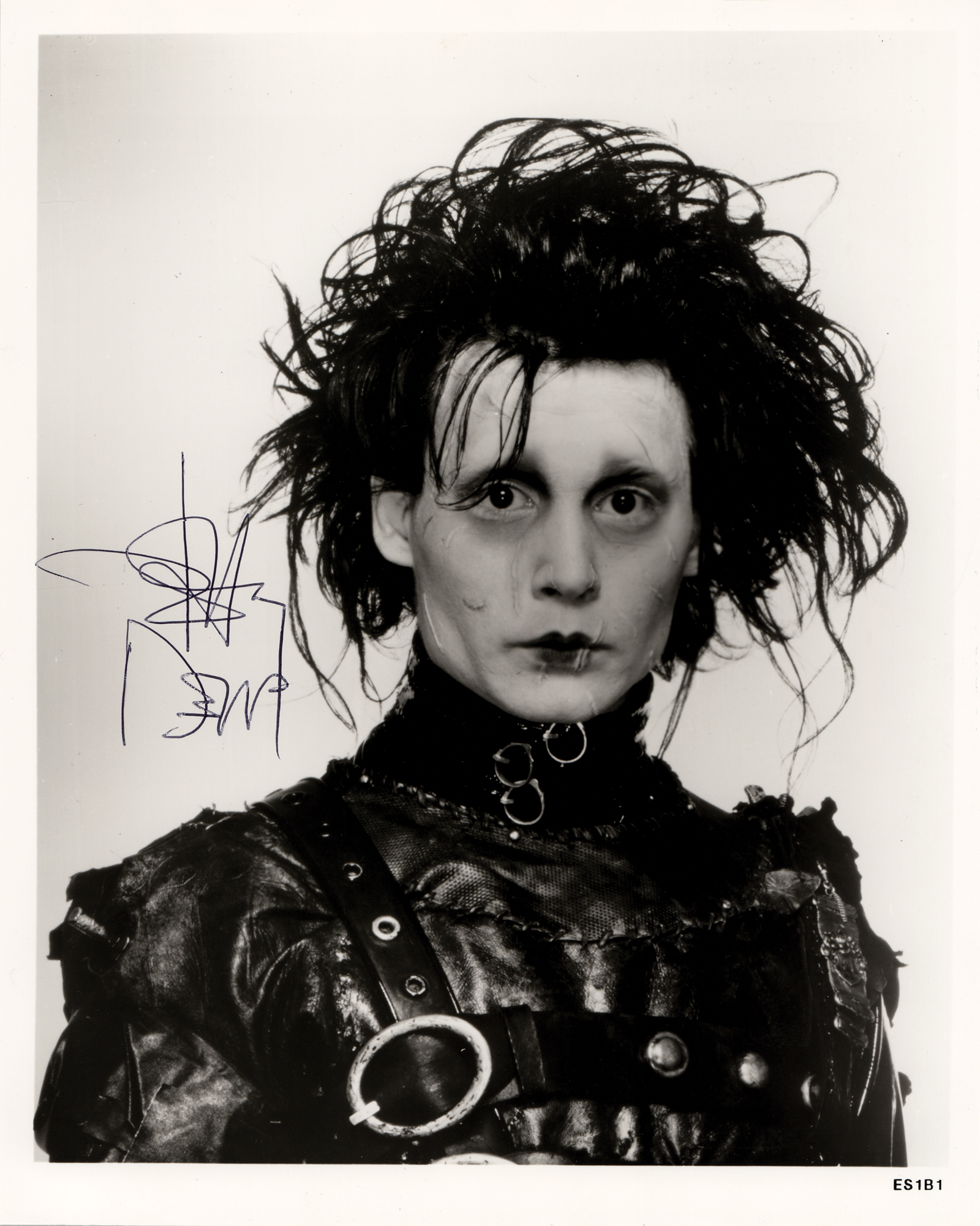 Glossy 8 x 10 photo of Johnny Depp as the title character in the 1990 film Edward Scissorhands, signed in black ballpoint. In fine condition, with a faint paperclip impression to the left edge.