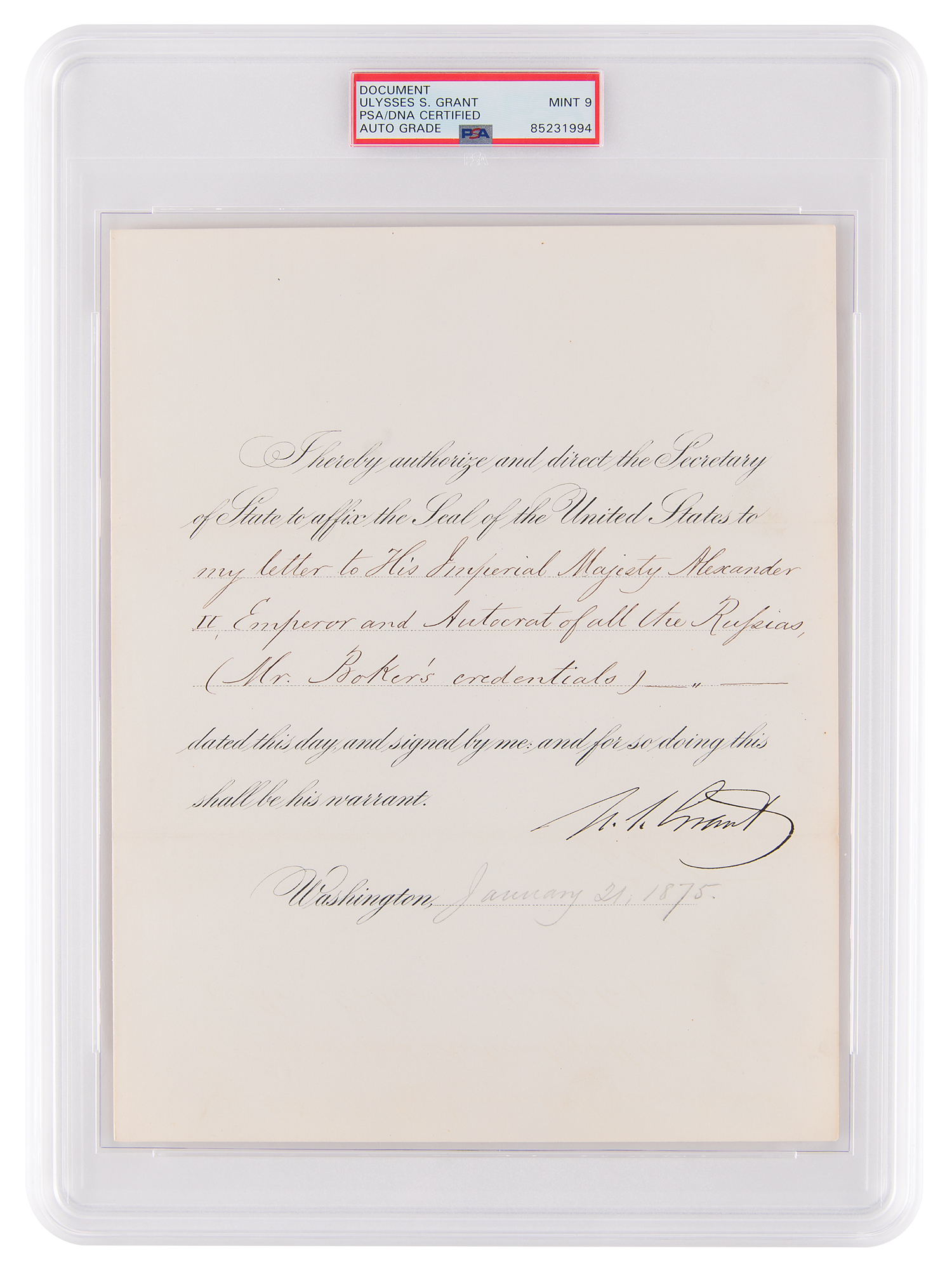 Partly-printed DS as president, one page, 7.75 x 10, January 21, 1875. President Grant directs the Secretary of State to “affix the Seal of the United States to my letter to His Imperial Majesty Alexander II, Emperor and Autocrat of all the Russias (Mr. Boker’s credentials).” Signed crisply at the conclusion by U. S. Grant. In very fine condition. Encapsulated and graded by PSA/DNA as "MINT 9."