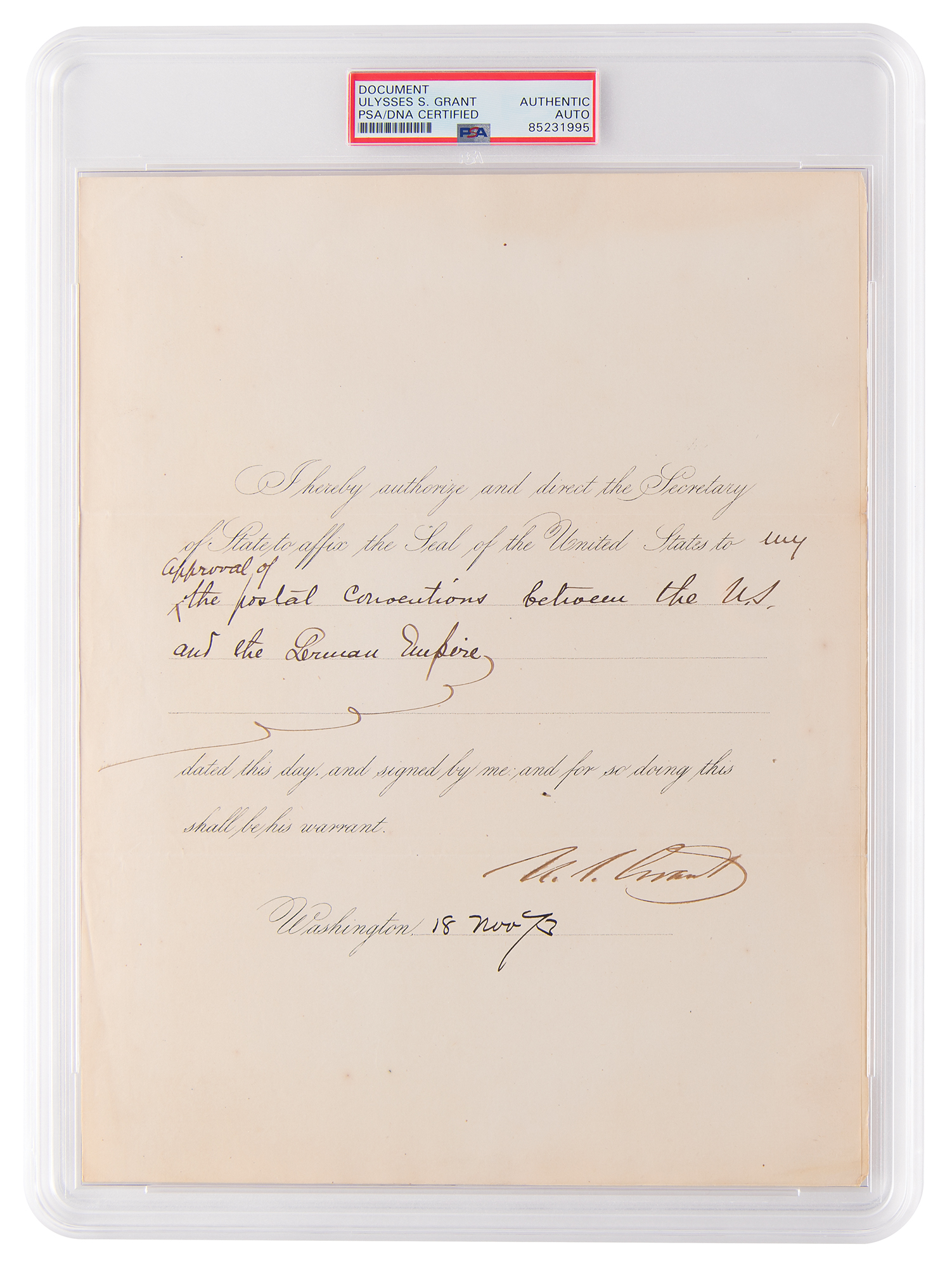 Partly-printed DS as president, one page, 8.5 x 11, November 18, 1873. President Grant directs the Secretary of State to “affix the Seal of the United States to my approval of the postal conventions between the U.S. and the German Empire.” Signed at the conclusion by U. S. Grant. In fine condition. Encapsulated in a PSA/DNA authentication holder.