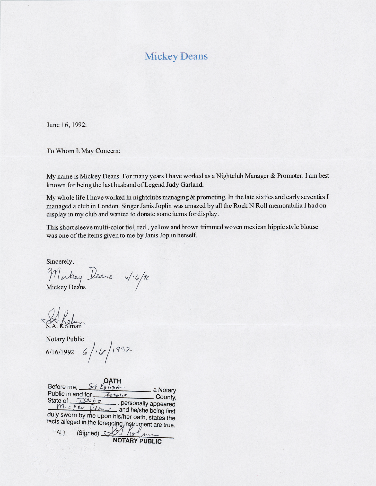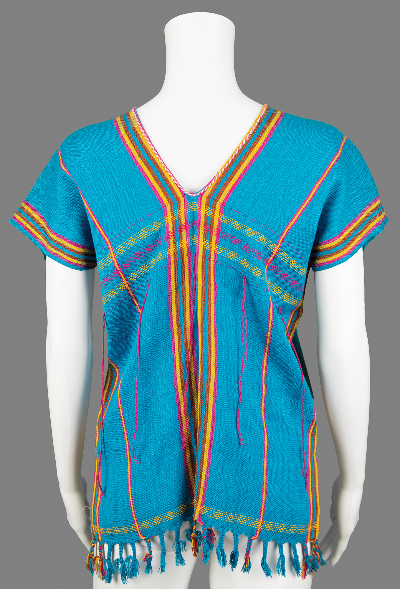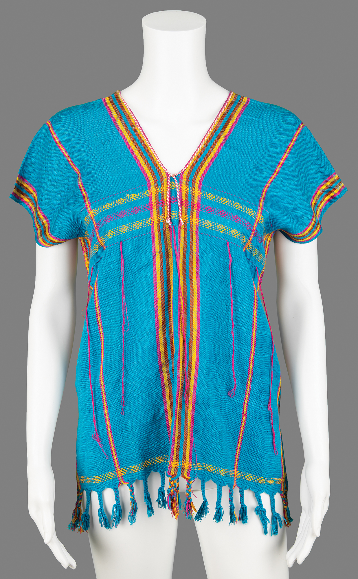 Janis Joplin's personally-owned loose-fitting hippie style woven top with a wide V-neck, featuring pink, brown, and yellow stripes, adorned with braided fringe along the bottom hem and long pink threads dangling at the chest area. In fine condition. Accompanied by a letter of provenance from musician, entrepreneur, and club owner Mickey Deans, in full: "My name is Mickey Deans. For many years I have worked as a Nightclub Manager & Promoter. I am best known for being the last husband of Legend Judy Garland. My whole life I have worked in nightclubs managing & promoting. In the late sixties and early seventies I managed a club in London. Singer Janis Joplin was amazed by all the Rock N Roll memorabilia I had on display in my club and wanted to donate some items for display. This short sleeve multi-color tiel, red, yellow and brown trimmed woven mexican hippie style blouse was one of the items given to me by Janis Joplin herself."