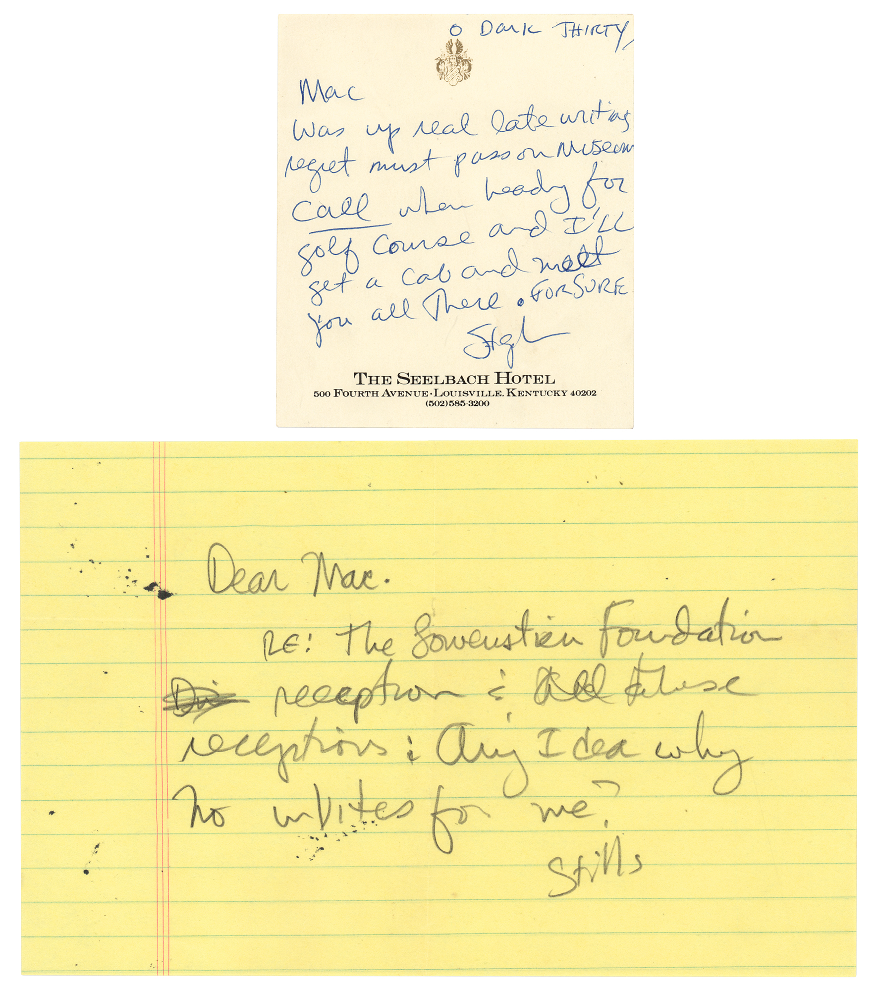 Two brief ALSs from Stephen Stills to Crosby, Stills, and Nash manager Mac Holbert, signed “Stephen” and “Stills,” undated but circa 1980s. The first letter, handwritten in blue ballpoint on a 3.5 x 4.25 sheet of Seelbach Hotel (Louisville, Kentucky) stationery, reads: “O Dark Thirty, Mac, Was up real late writing, regret must pass on museum, call when ready for golf course and I’ll get a cab and meet you all there. Fore sure.” The second letter, written in pencil on an 8.5 x 5 sheet of notebook paper, reads: “Dear Mac. RE: The Lowenstein Foundation reception & all these receptions: Any idea why no invites for me?” In overall fine condition. Accompanied by a certificate of authenticity from Tracks and by a signed certificate of authenticity from Holbert.
