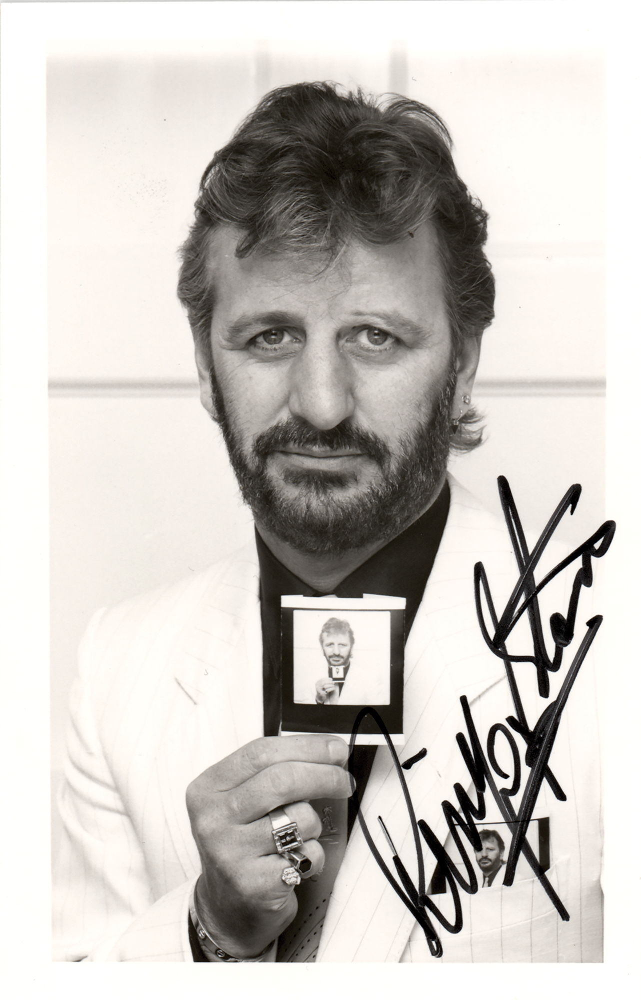 Semi-glossy 3.5 x 5.5 photo of Ringo Starr holding up a Polaroid photograph of himself, signed in black felt tip. In fine condition, with a light diagonal bend to the lower left. Accompanied by a certificate of authenticity from Tracks.