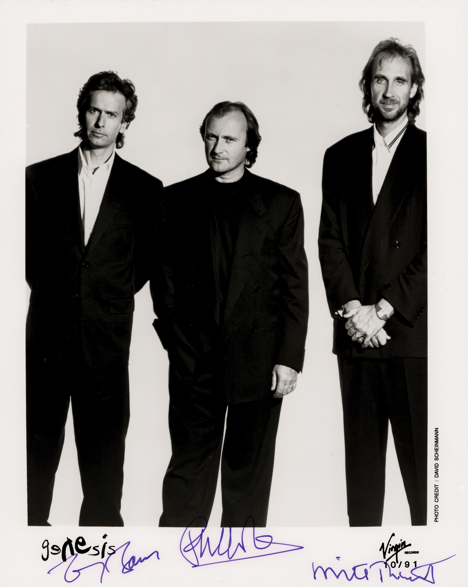 Circa 1991 satin-finish 8 x 10 Virgin Records publicity photo of Genesis wearing dark suits, signed in the lower border in purple felt tip by Tony Banks, Phil Collins, and Mike Rutherford. In fine condition. Accompanied by a certificate of authenticity from Tracks.