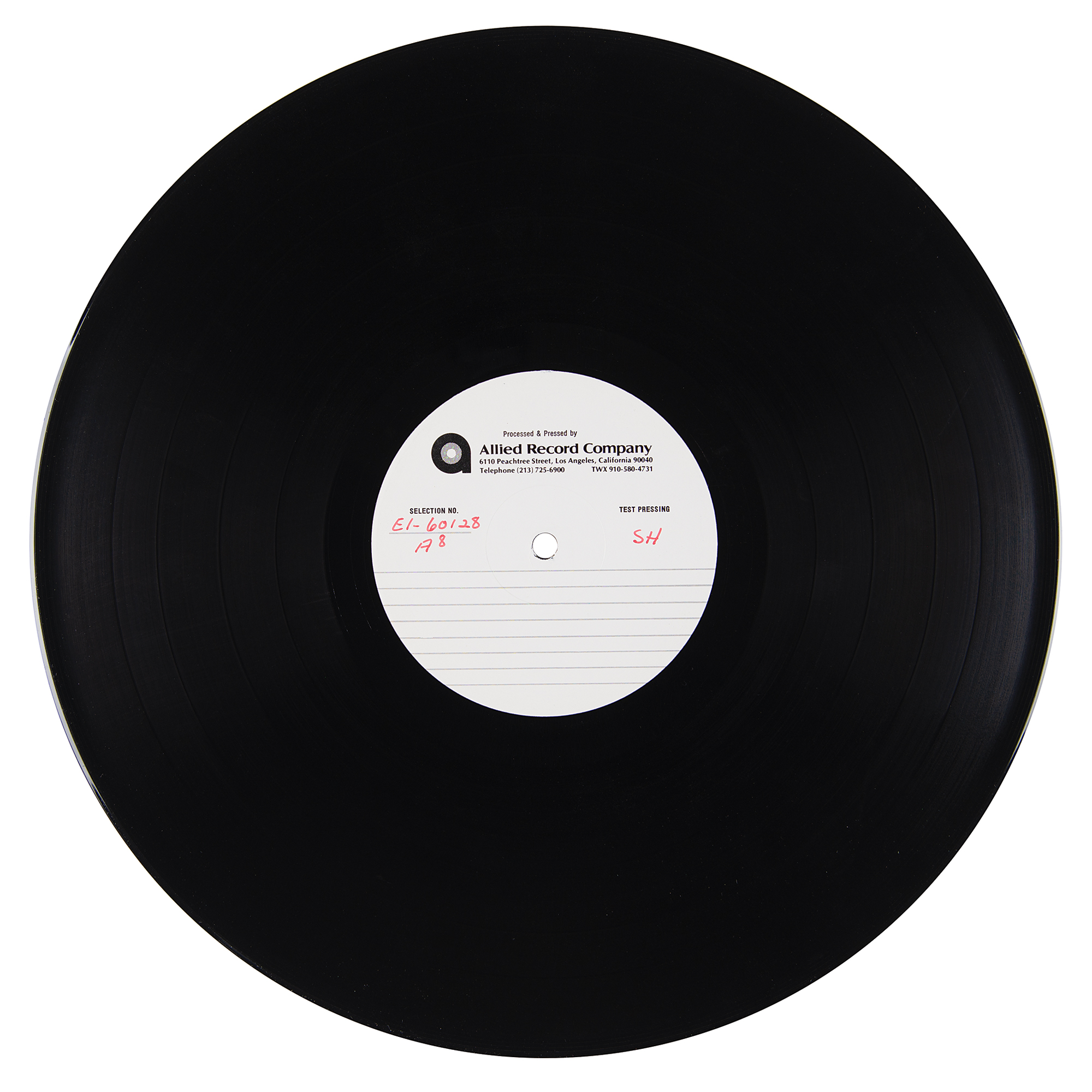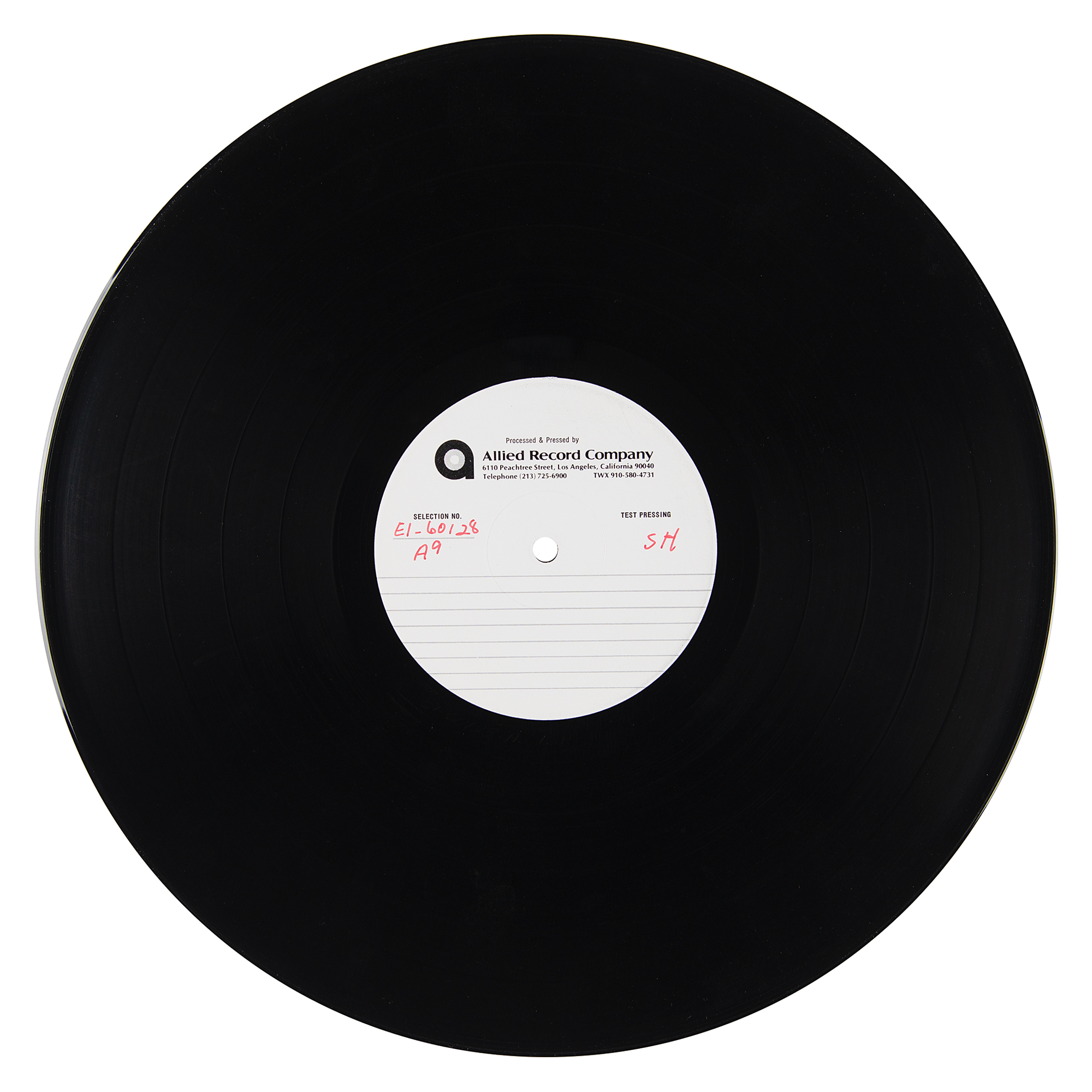Original double-sided 12-inch vinyl test pressing of the Queen album ‘Hot Space,’ with both sides bearing Allied Recording Company labels annotated in red felt tip, “E1-60128 A8, SH” and “E1-6128 A9, SH.” Both sides of the test pressing contain side one of the Hot Space album. Includes its original plain white inner sleeve. In fine condition. Accompanied by a certificate of authenticity from Tracks.