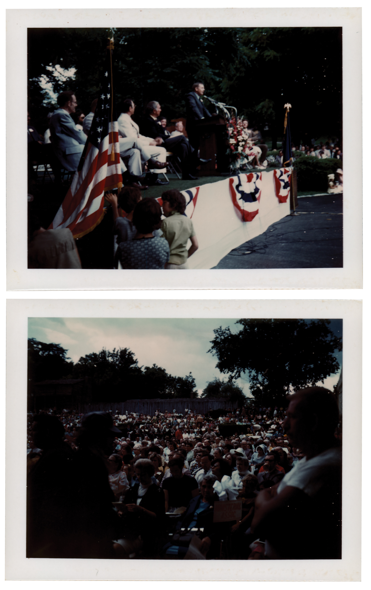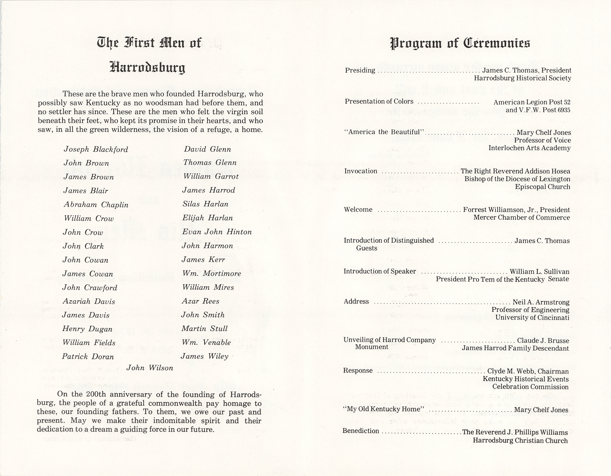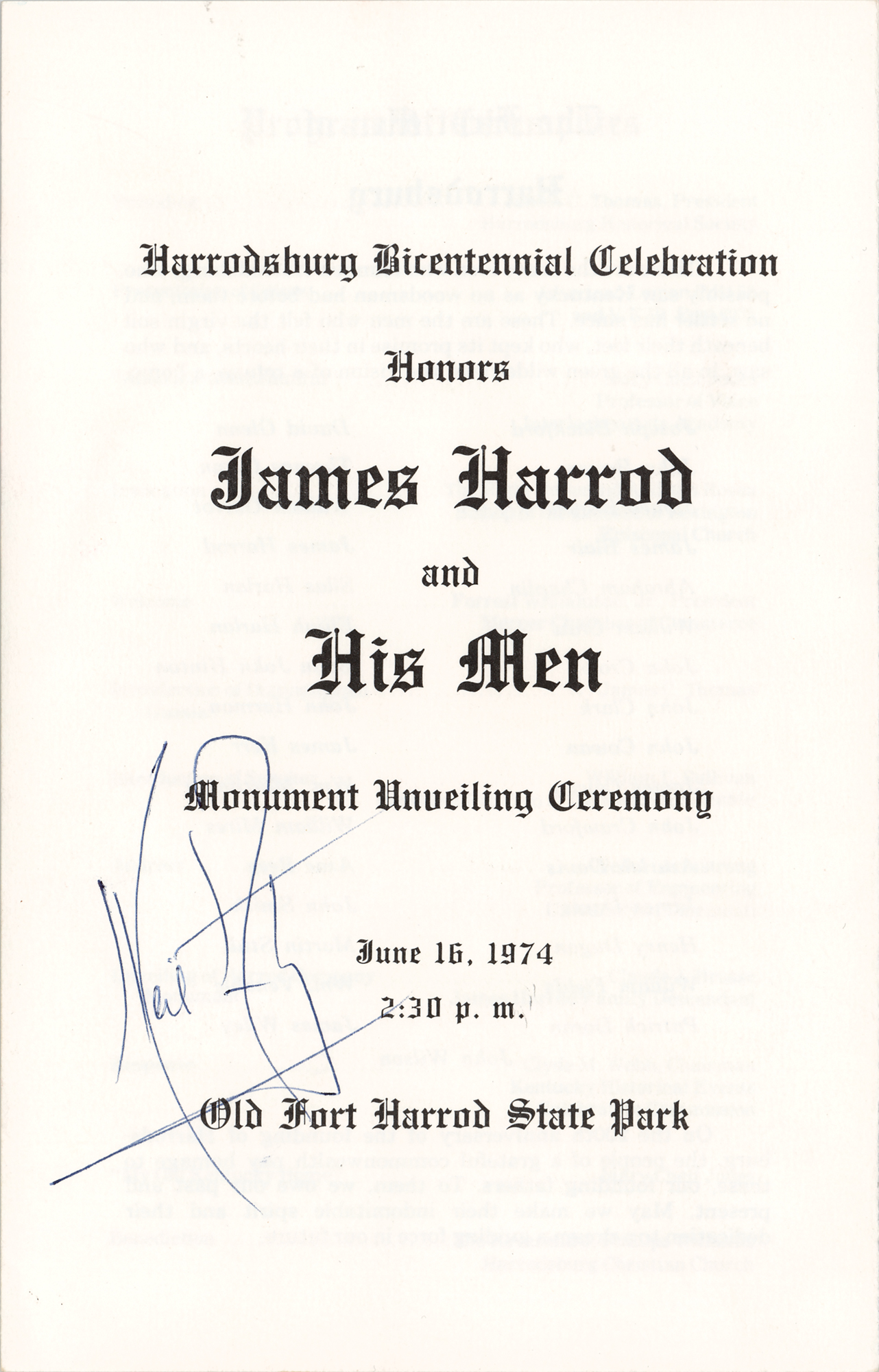 Desirable program for the "Harrodsburg Bicentennial Celebration," two pages, 5.5 x 8.5, held at Old Fort Harrod State Park in Harrodsburg, Kentucky, on June 16, 1974, signed on the front cover in blue ballpoint by Neil Armstrong. The text inside honors James Harrod and his men, who helped explore and settle the area west of the Allegheny Mountains, and lists Armstrong as a speaker in the program of ceremonies. In very fine condition. Accompanied by two original vintage color glossy candid photographs of the event, one showing Armstrong speaking at the podium.