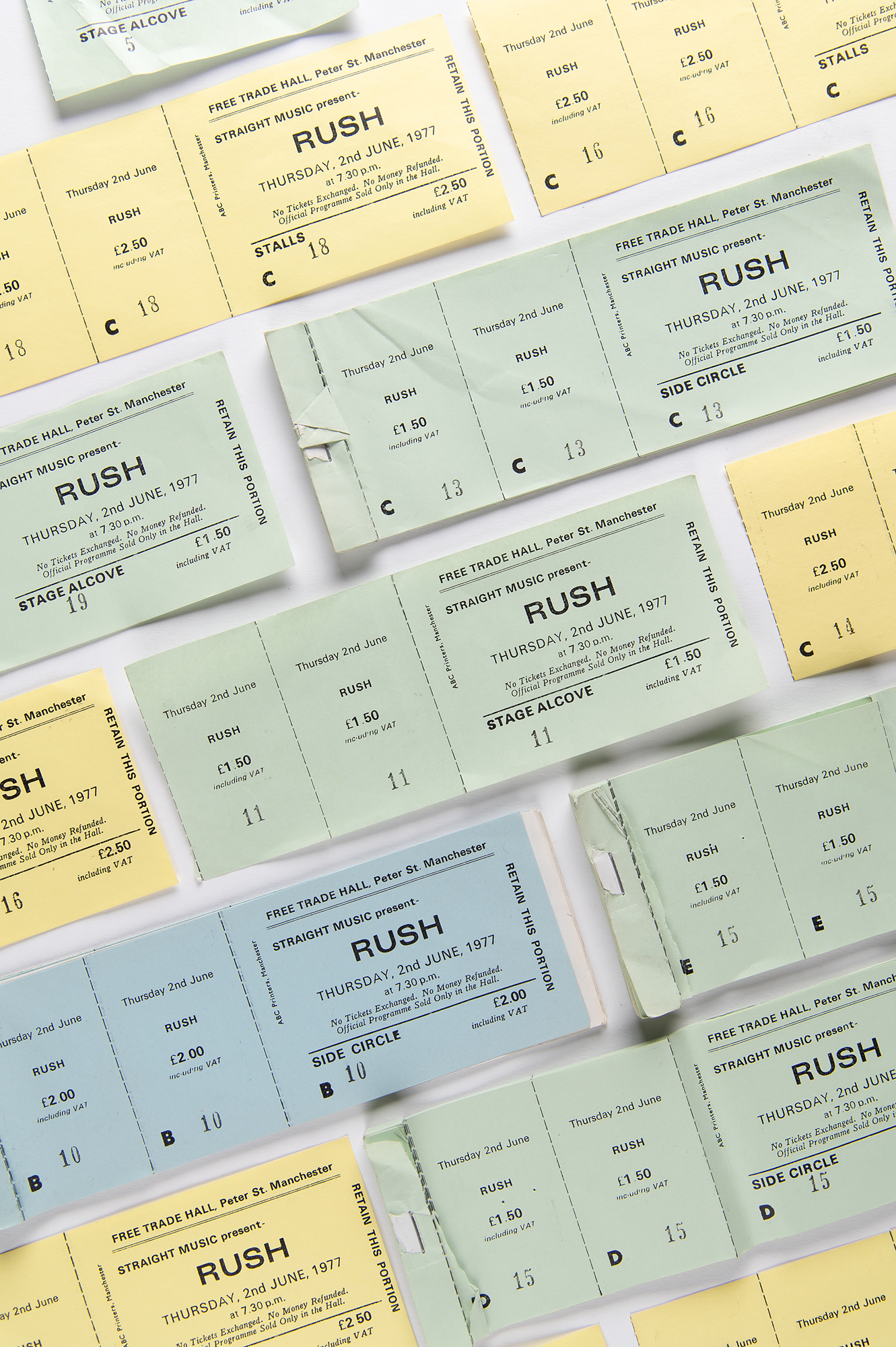 Fantastic collection of 51 tickets and ticket stubs for Rush's concert at the Free Trade Hall, Manchester, England on June 2, 1977, during their 'All the World's a Stage' tour. Includes yellow tickets for the "Stalls" (£2.50), blue tickets for the "Side Circle" (£2.00), and green tickets for the "Side Circle" and "Stage Alcove" (£1.50), most of which are full and intact, and many stapled together in their original, incomplete ticket booklets. In overall very good to fine condition, with some scattered creasing.