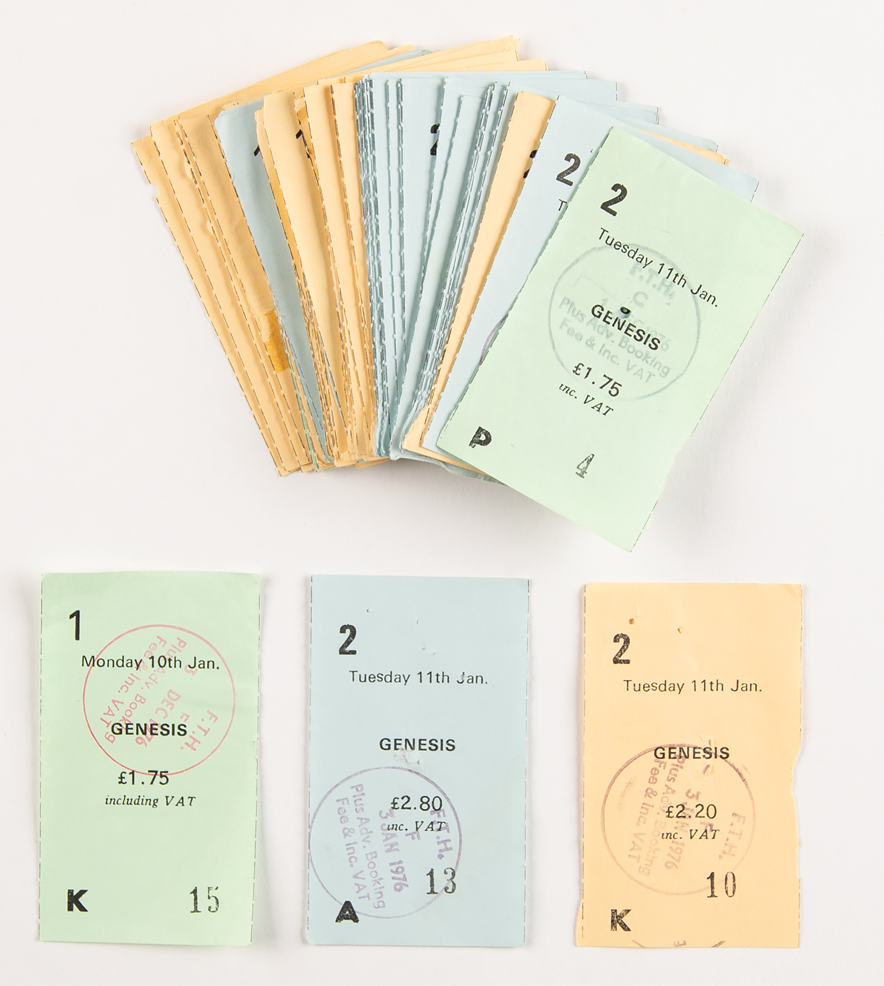 Huge collection of 102 ticket stubs for the Genesis concerts at the Free Trade Hall, Manchester, England on January 10 and 11, 1977, during the 'Wind & Wuthering Tour.' All are ticket-taker's stubs, in beige, blue, and green, with costs ranging from £1.75 to £2.80. In overall very good to fine condition, with scattered creasing and staple holes. In overall fine condition. Audiences at the Free Trade Hall were treated to a 17-song set, beginning with 'Squonk' and ending with 'The Lamb Lies Down on Broadway' and 'The Musical Box' as encores.