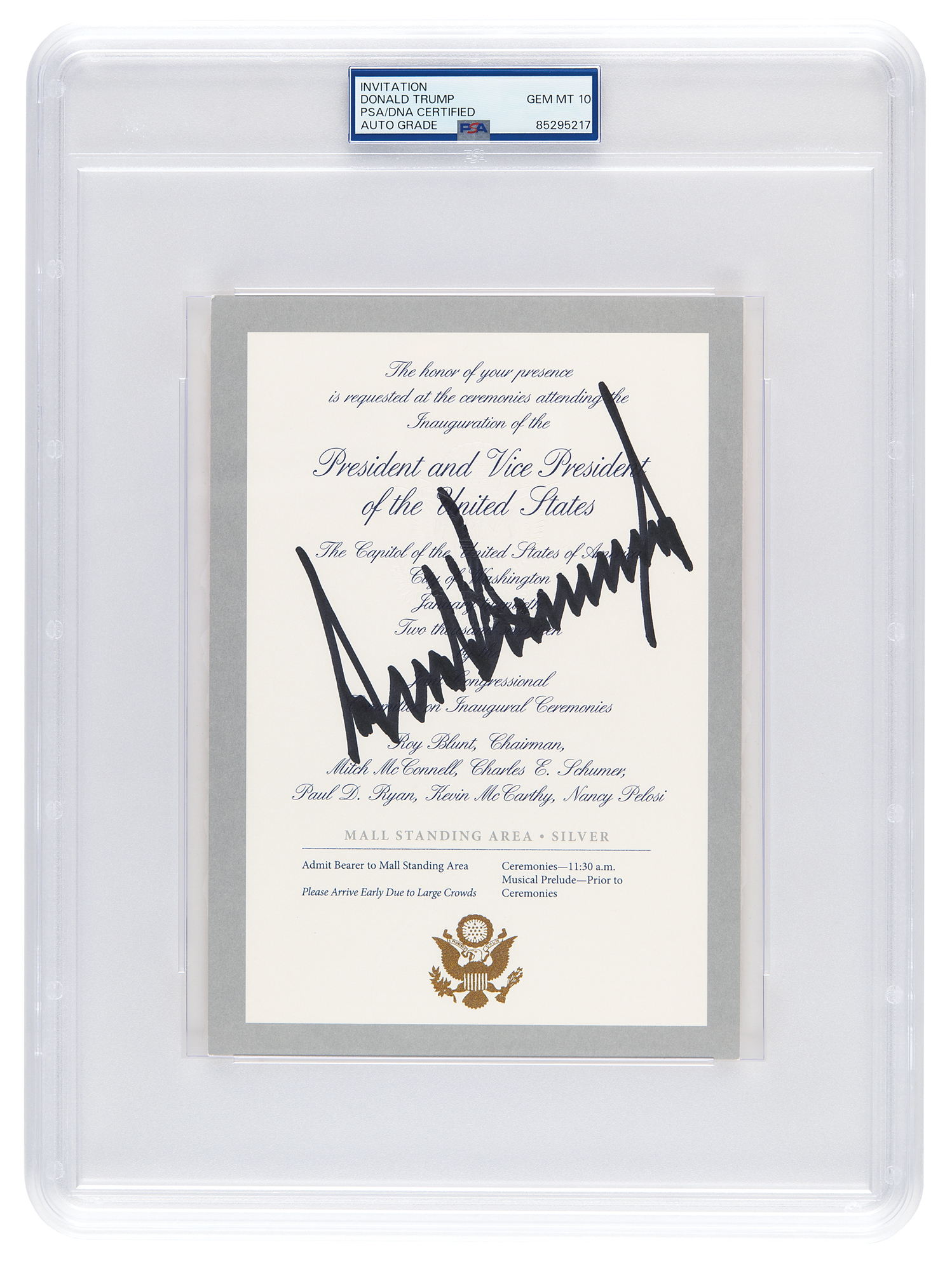 Official 5.75 x 8.25 silver invitation pass for the inauguration of President Donald Trump and Vice President Mike Pence on January 20, 2017, organized by the Joint Congressional Committee of Inaugural Ceremonies, signed prominently in thick black felt tip by Donald Trump. Issued for the ‘Mall Standing Area,’ the pass bears an embossed Great Seal of the United States and the reverse features a map of the United States Capitol and surrounding area. In very fine condition. Encapsulated and graded by PSA/DNA as "GEM MT 10."