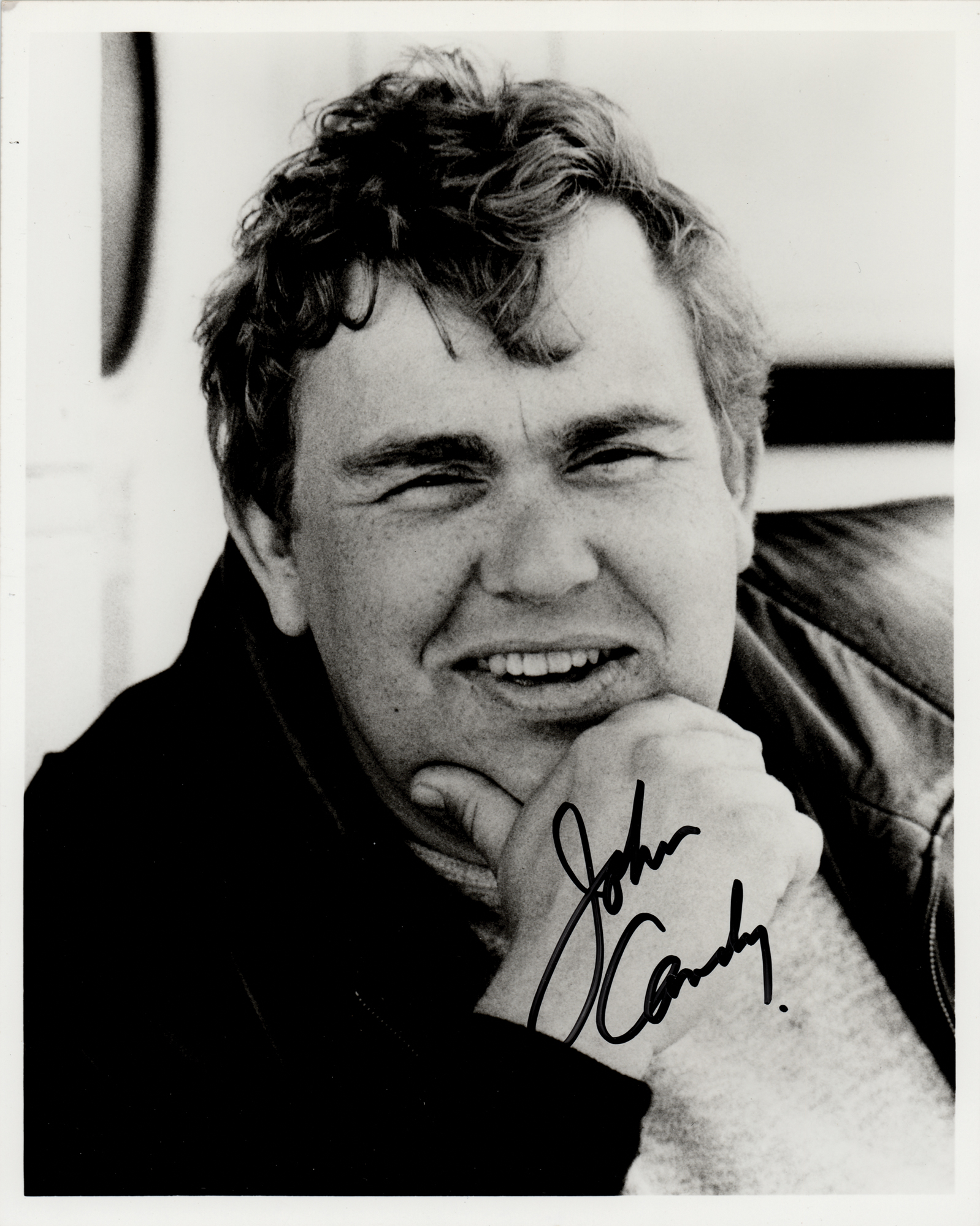 Glossy 8 x 10 photo of John Candy smiling for the camera, signed in black felt tip. In very fine condition.