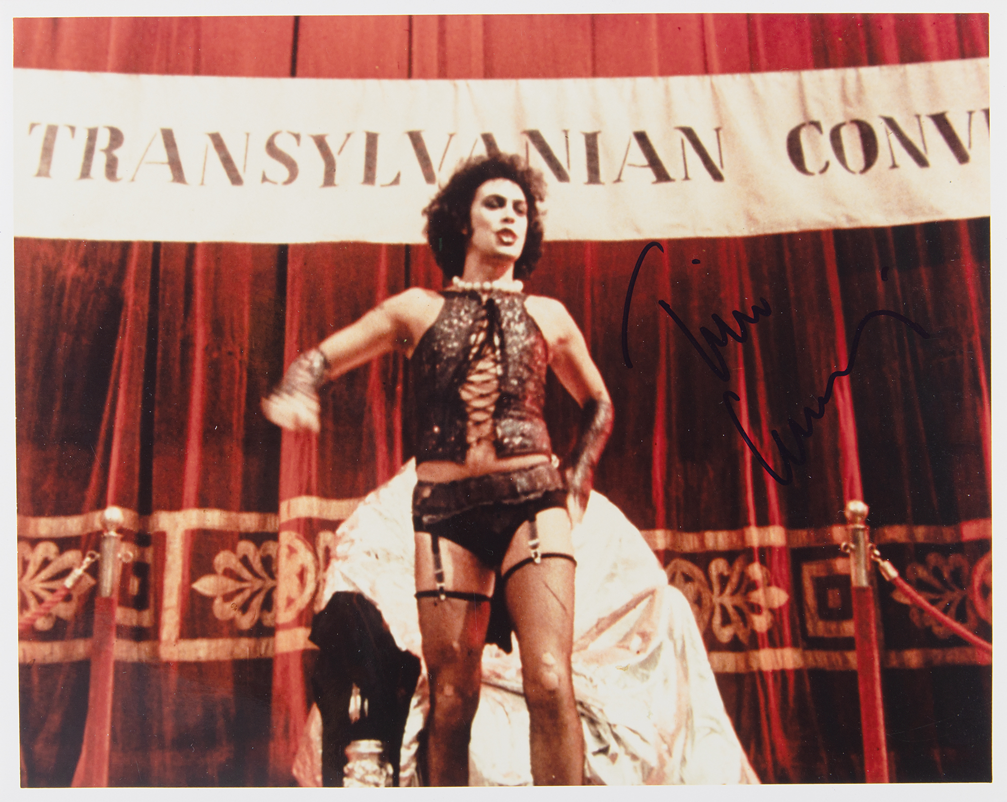 Color glossy 10 x 8 photo of Tim Curry as Dr. Frank-N-Furter in the 1975 musical comedy horror The Rocky Horror Picture Show, signed in felt tip. In very fine condition, with poor-to-moderate signature contrast.