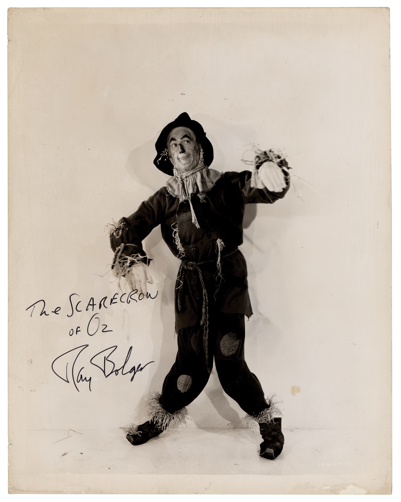 Vintage glossy 8 x 10 photo of Ray Bolger as the loose limbed scarecrow from the 1939 film The Wizard of Oz, signed in black felt tip, "The Scarecrow of Oz, Ray Bolger.” In very good condition, with overall thin surface crazing to the emulsion.