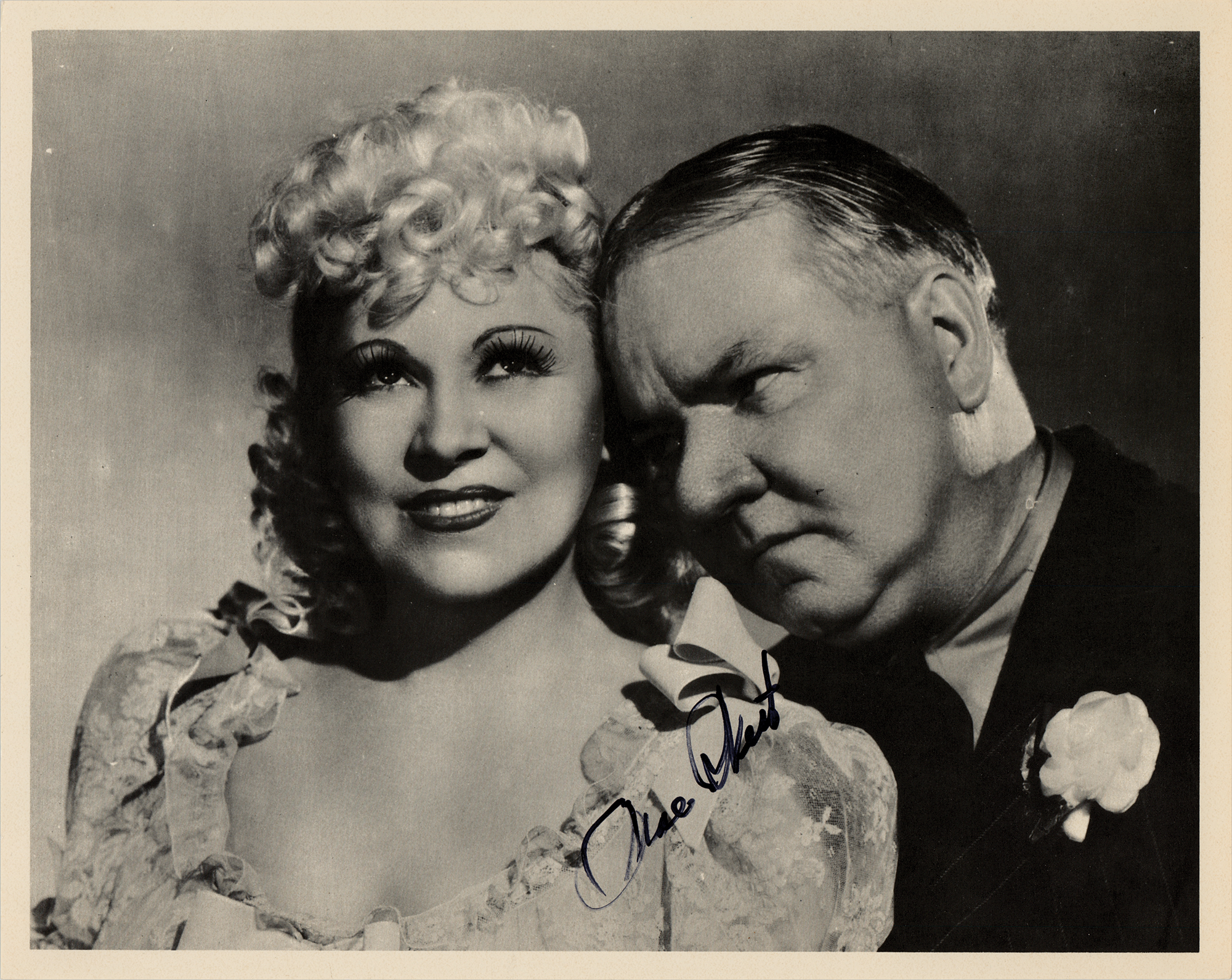 Heavy paperstock 10 x 8 photo of Mae West and W. C. Fields in the 1940 film My Little Chickadee, signed in black felt tip by West. In fine condition.