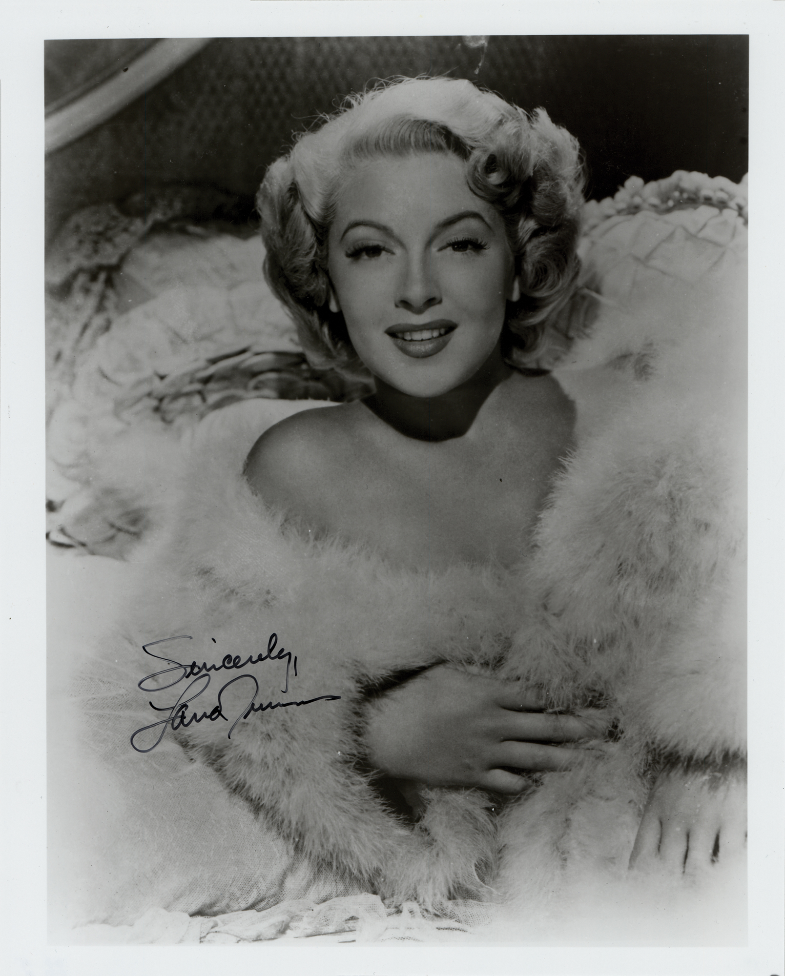 Glossy 8 x 9.75 photo of Lana Turner wearing a white fur coat, signed in black felt tip. In very fine condition.