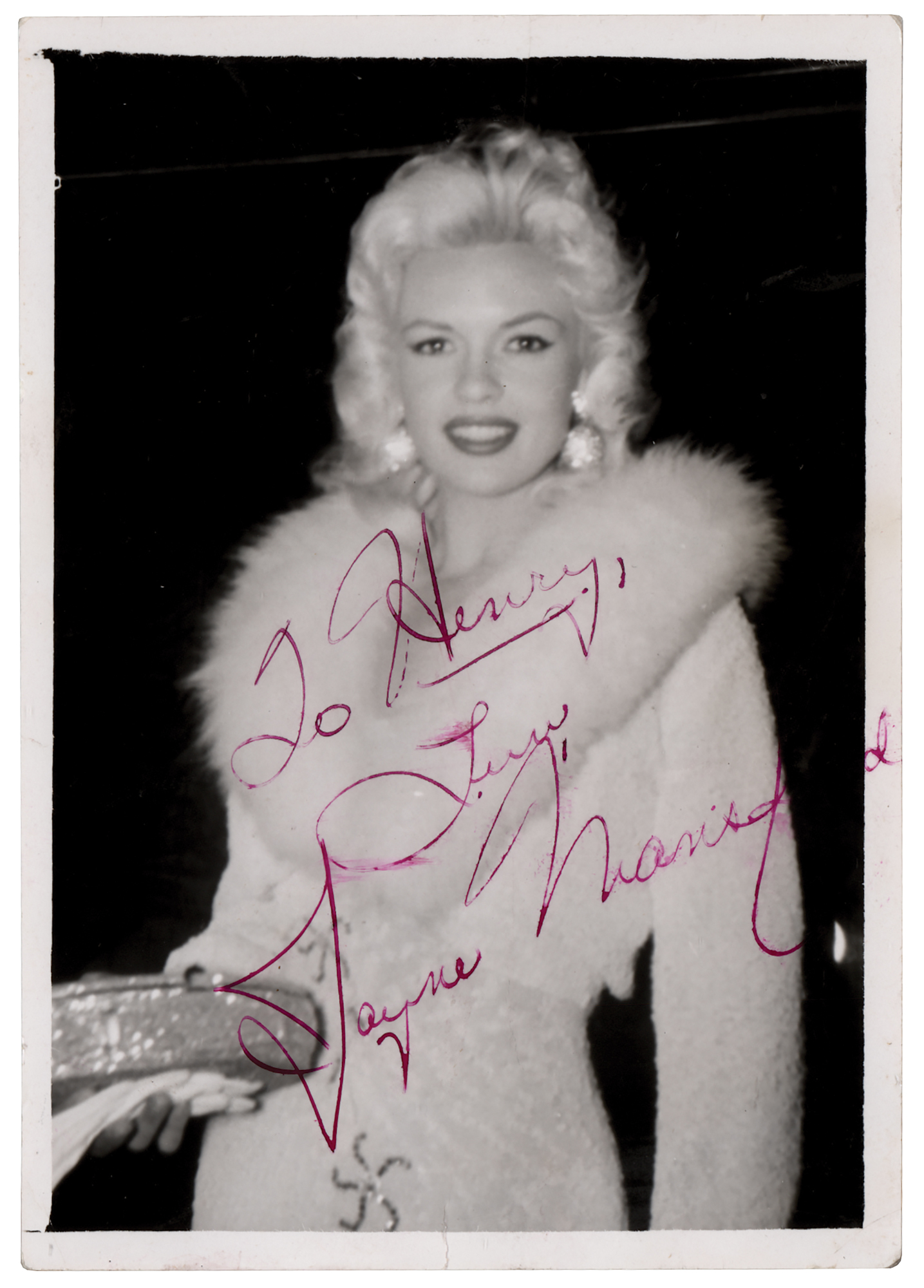 Vintage satin-finish candid 3.5 x 5 photo of actress Jayne Mansfield wearing a white fur-collared coat and holding an evening bag and gloves, signed and inscribed in purple ink, "To Henry, Love, Jayne Mansfield.” In very good to fine condition, with scattered light creasing and light edge wrinkling. Accompanied by a full letter of authenticity from PSA/DNA..