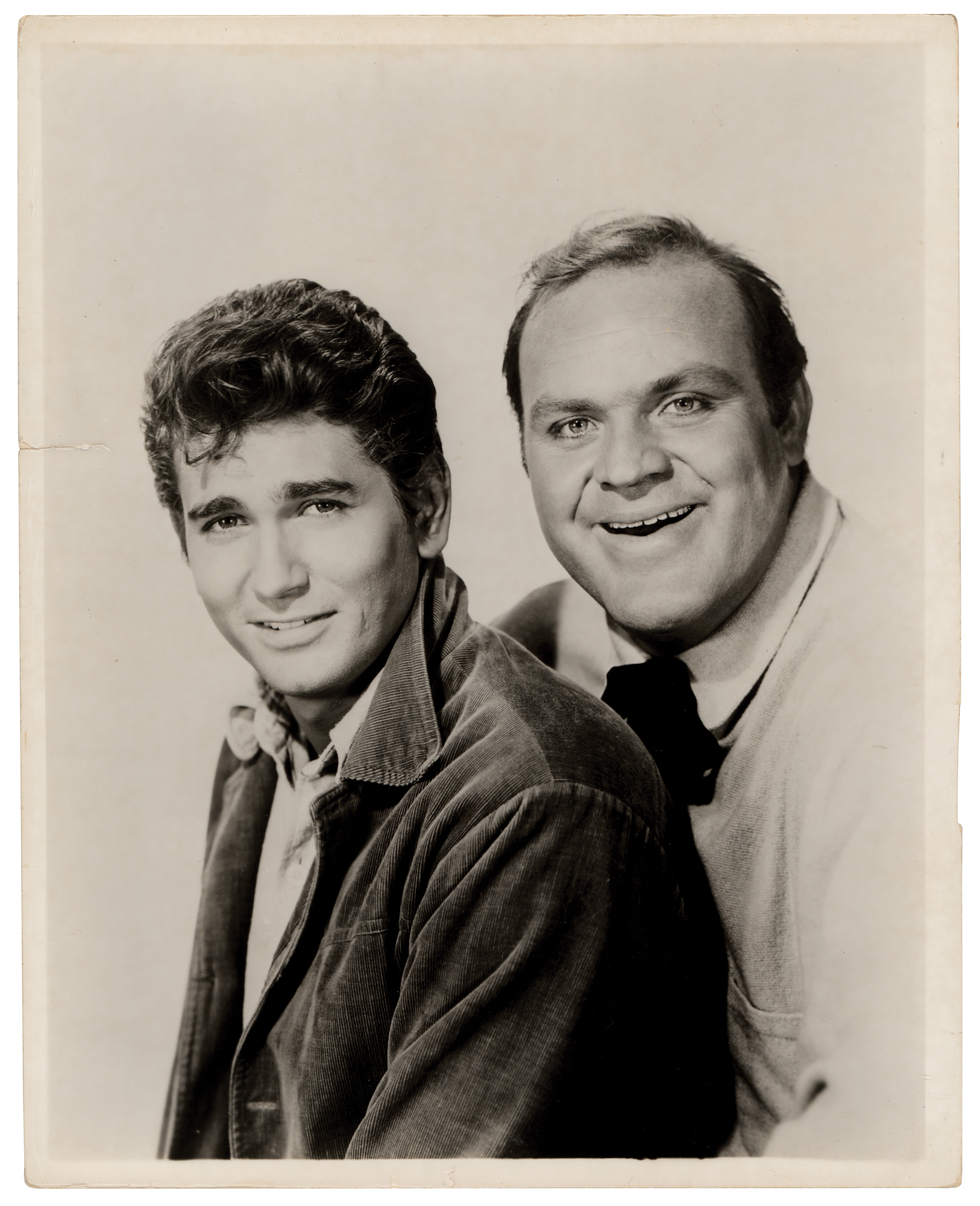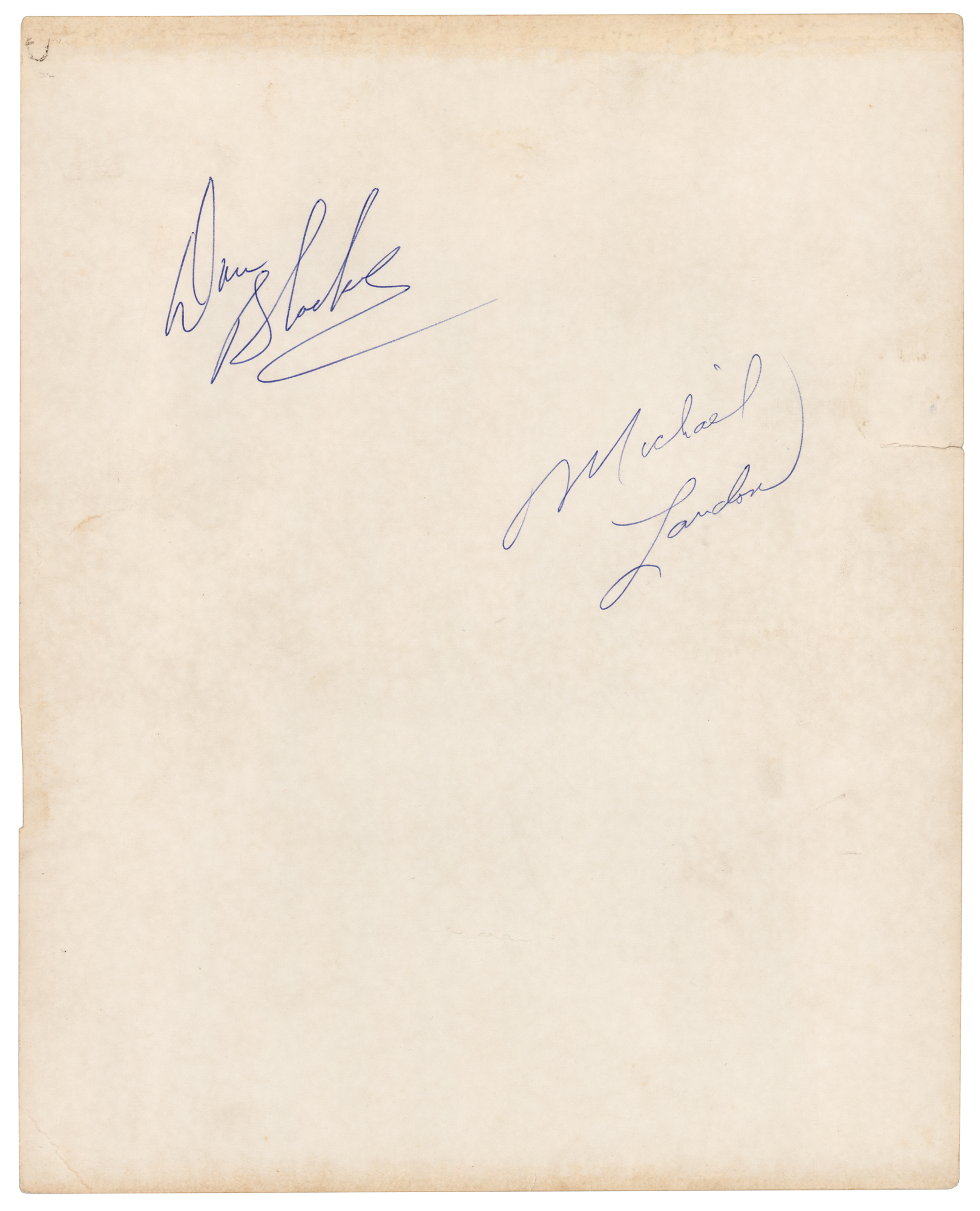 Vintage glossy 8 x 10 photo of Eric 'Hoss' and Joseph 'Little Joe' Cartwright from the television series Bonanza, signed on the reverse in blue ballpoint by Michael Landon and Dan Blocker. In very good to fine condition, with scattered light creasing, and an edge tear not affecting the signatures. Accompanied by a print of the photograph.