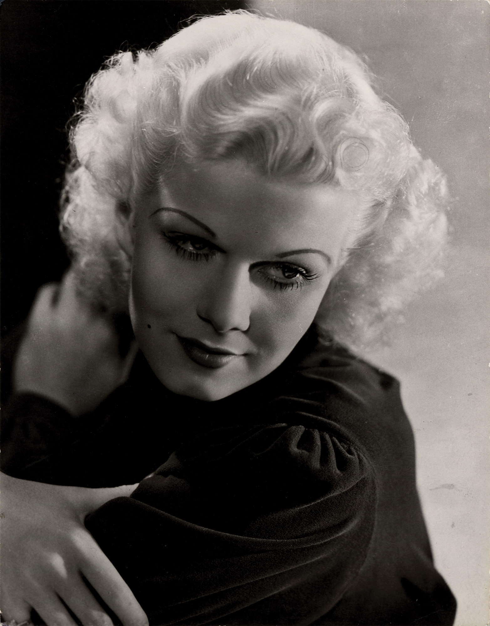 Lovely semi-glossy 11 x 14 silver gelatin photograph of Jean Harlow looking over her shoulder in a glamorous close-up pose. In fine condition, with light edgewear and a couple of small creases.