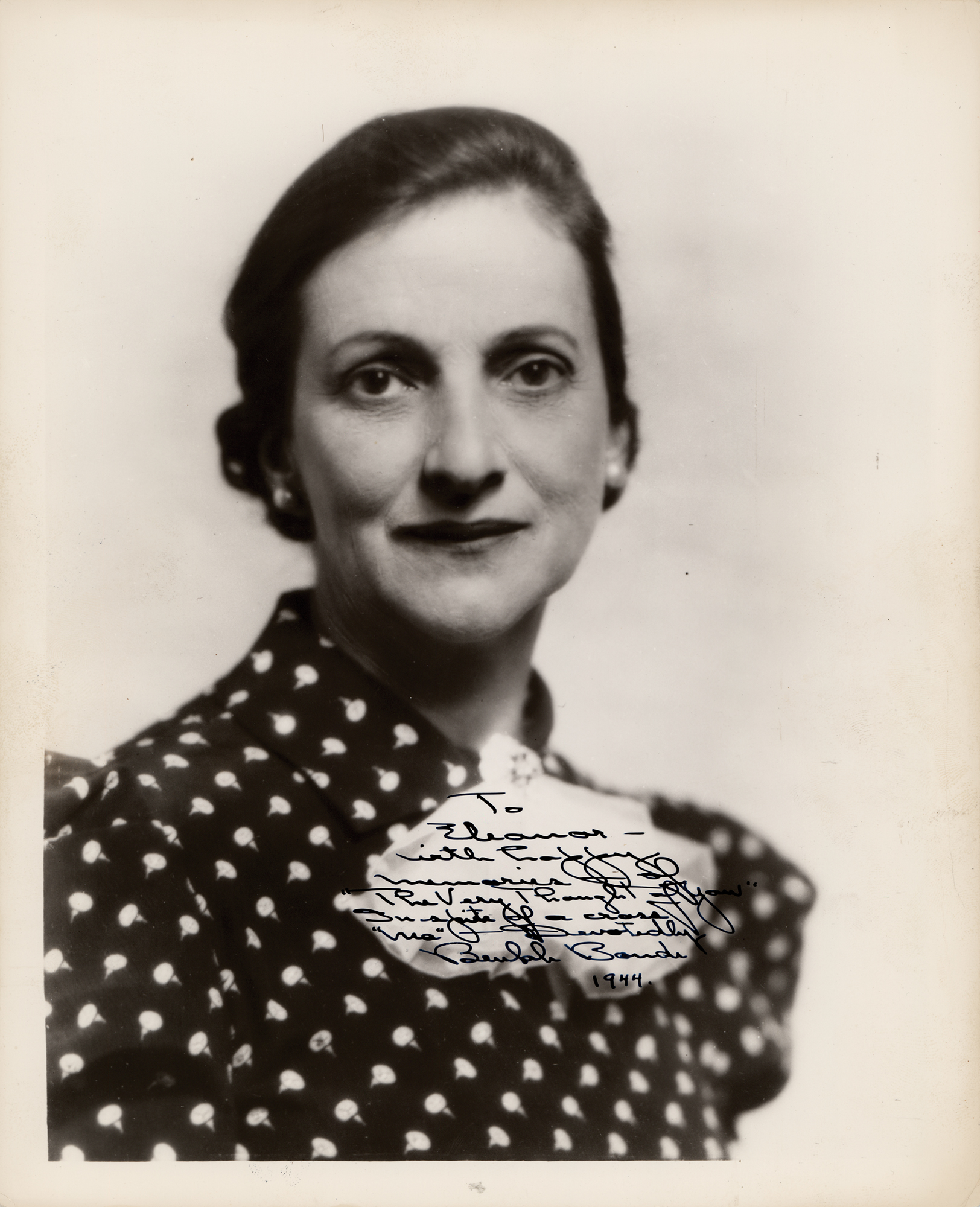 Vintage glossy 8 x 10 photo of Bondi in a head-and-shoulders pose, signed and inscribed in fountain pen to actress Eleanor Parker, "To Eleanor, with happy memories of 'The Very Thought of You' in spite of a cross 'ma' – Devotedly, Beulah Bondi, 1944.” In fine condition.