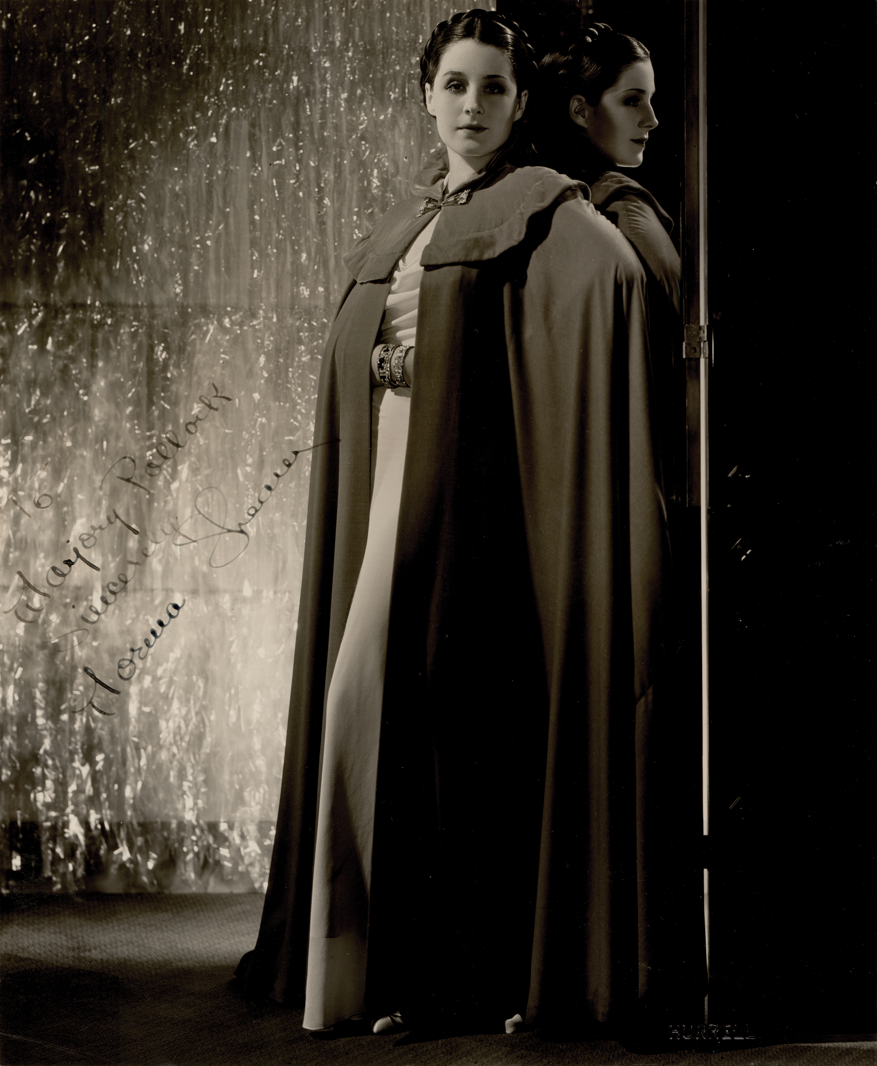 Vintage semi-glossy 8.5 x 10.5 full-length photo of Shearer wearing a cloak, signed and inscribed in fountain pen, "To Marjory Pollock, Sincerely, Norma Shearer.” Blindstamped in the lower right corner crediting the photograph to the great George Hurrell. In fine condition, with some light corner creases and a hint of faint silvering.