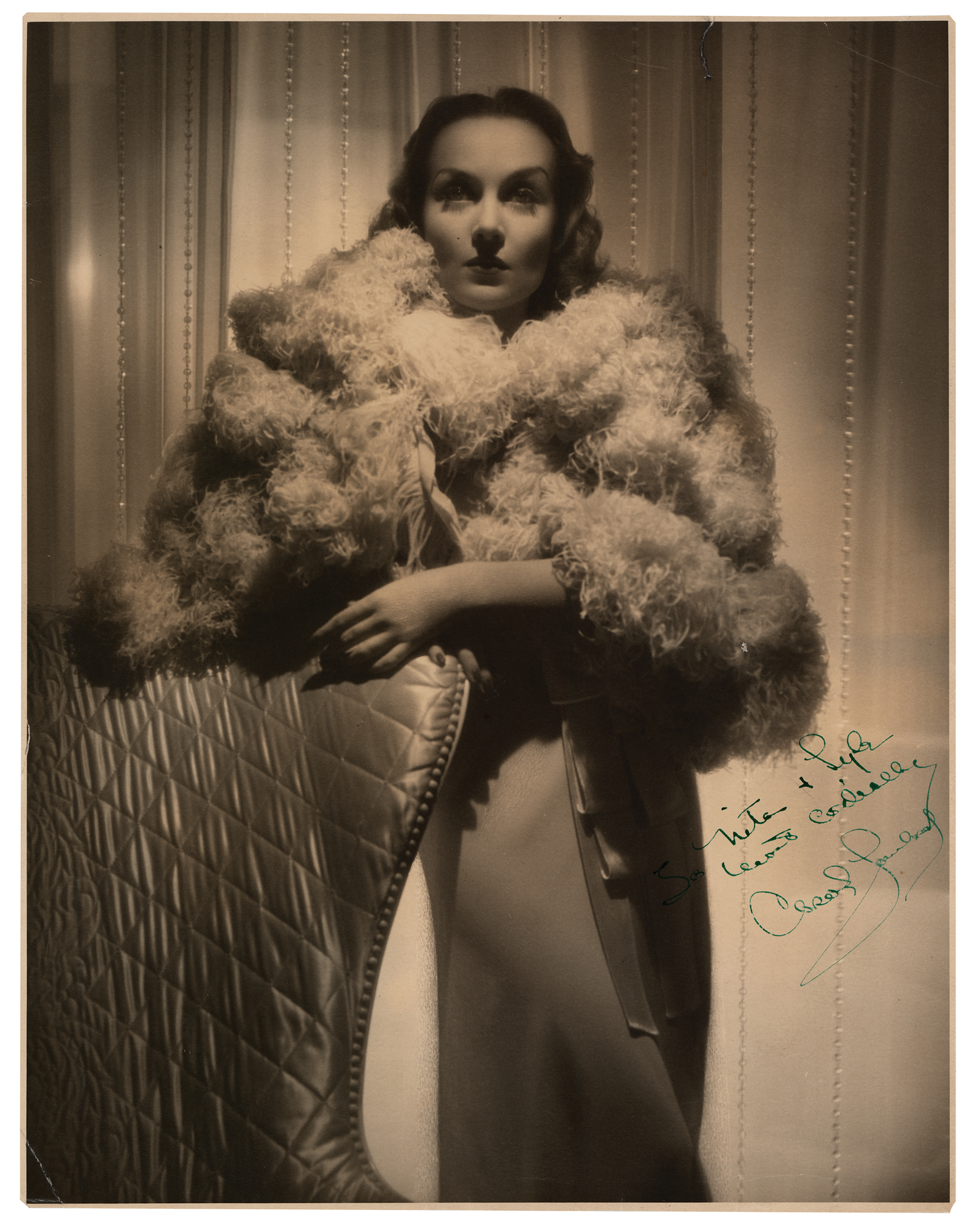 Vintage matte-finish 10.5 x 13.5 photo of Lombard posing next to a chair, signed and inscribed in fountain pen, "To Nita and Lyle, most cordially, Carole Lombard.” Reverse bears a stamp crediting the photo to William Walling, Jr. In fine condition, with some small corner creases and a short tear to the top edge.