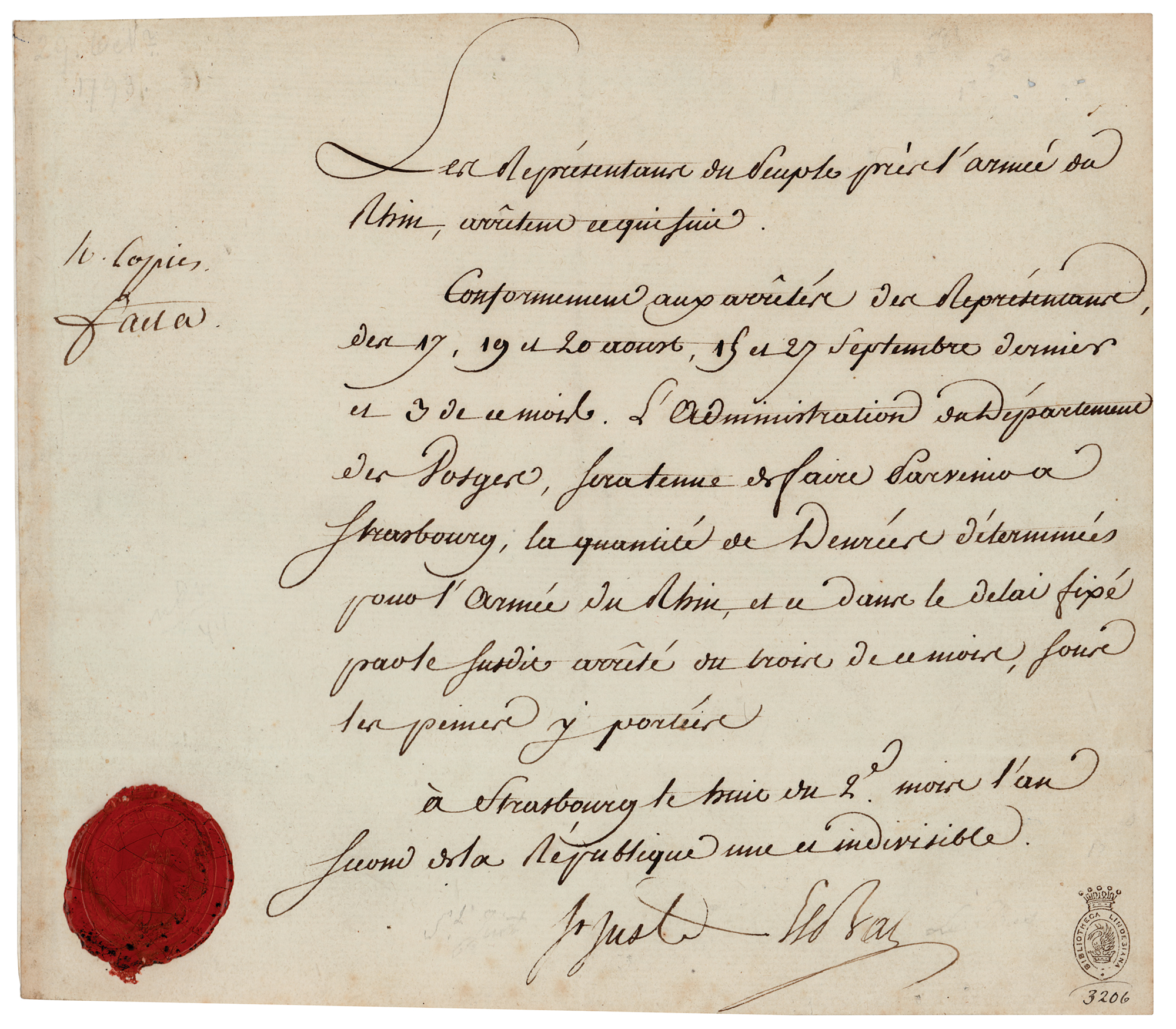 French revolutionary, political philosopher, and president of the French National Convention (1767–1794) who was a major figure of the French Revolution, serving as the trusted ally of Maximilien Robespierre during the Reign of Terror. Manuscript DS in French, signed “St. Just,” one page, 8.5 x 7.5, October 29, 1793. Untranslated military document concerning supplies to the Army of the Rhine, signed in Strasbourg by Louis Antoine de Saint-Just and his fellow revolutionary Philippe-François-Joseph Le Bas. The document bears an official red wax seal at the lower left, and a "Bibliotheca Lindesiana" stamp at the lower right. In fine condition.