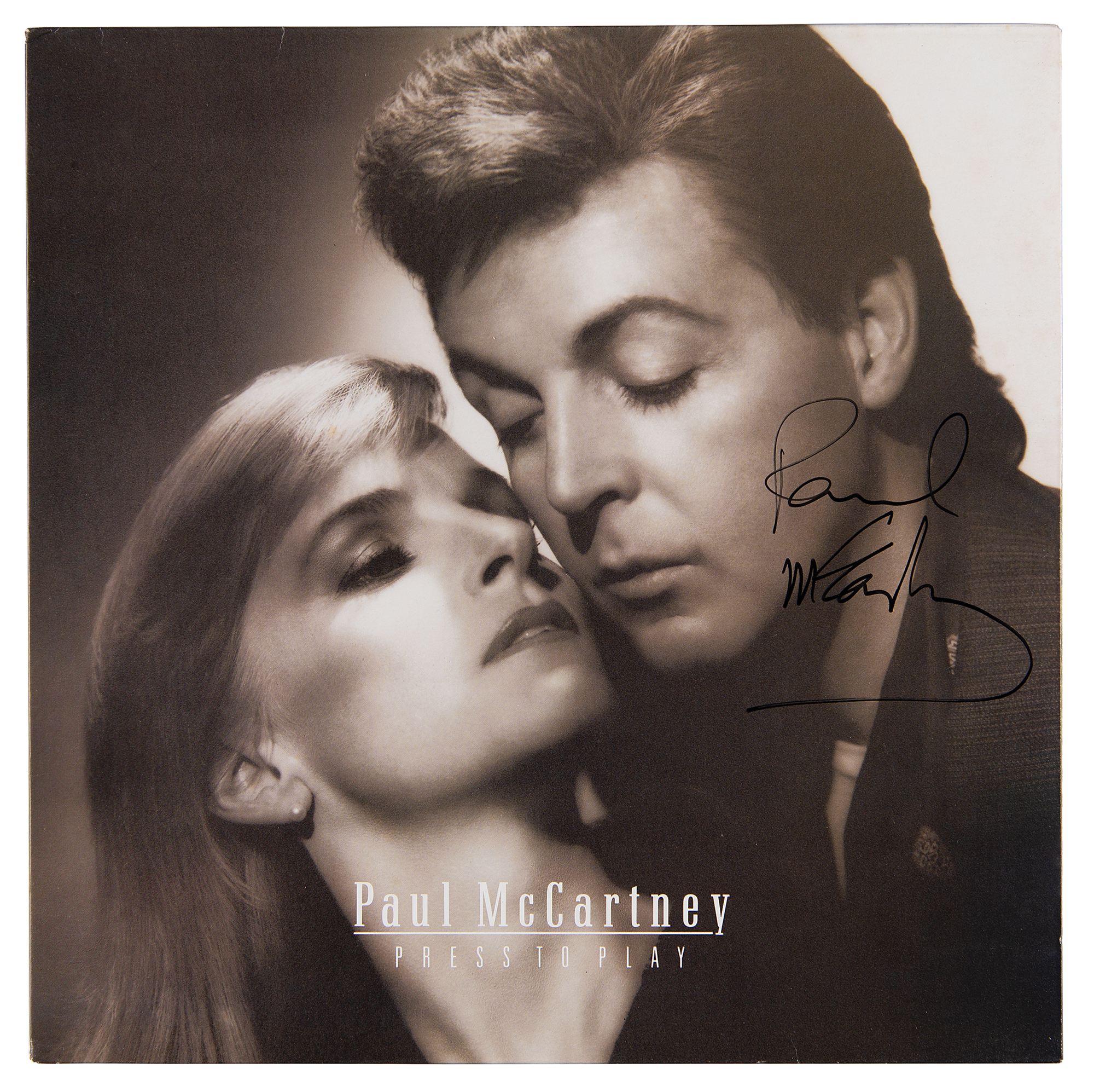 UK vinyl pressing of the 1986 album Press to Play by Paul McCartney, who has prominently signed on the front cover in black felt tip. The consignor notes that the autograph was obtained at BBC Television studios in Shepherd's Bush, London, England, on May 19, 1989, when McCartney was appearing on the television program Wogan. In fine condition. The record is included. Accompanied by a certificate of authenticity from Tracks.