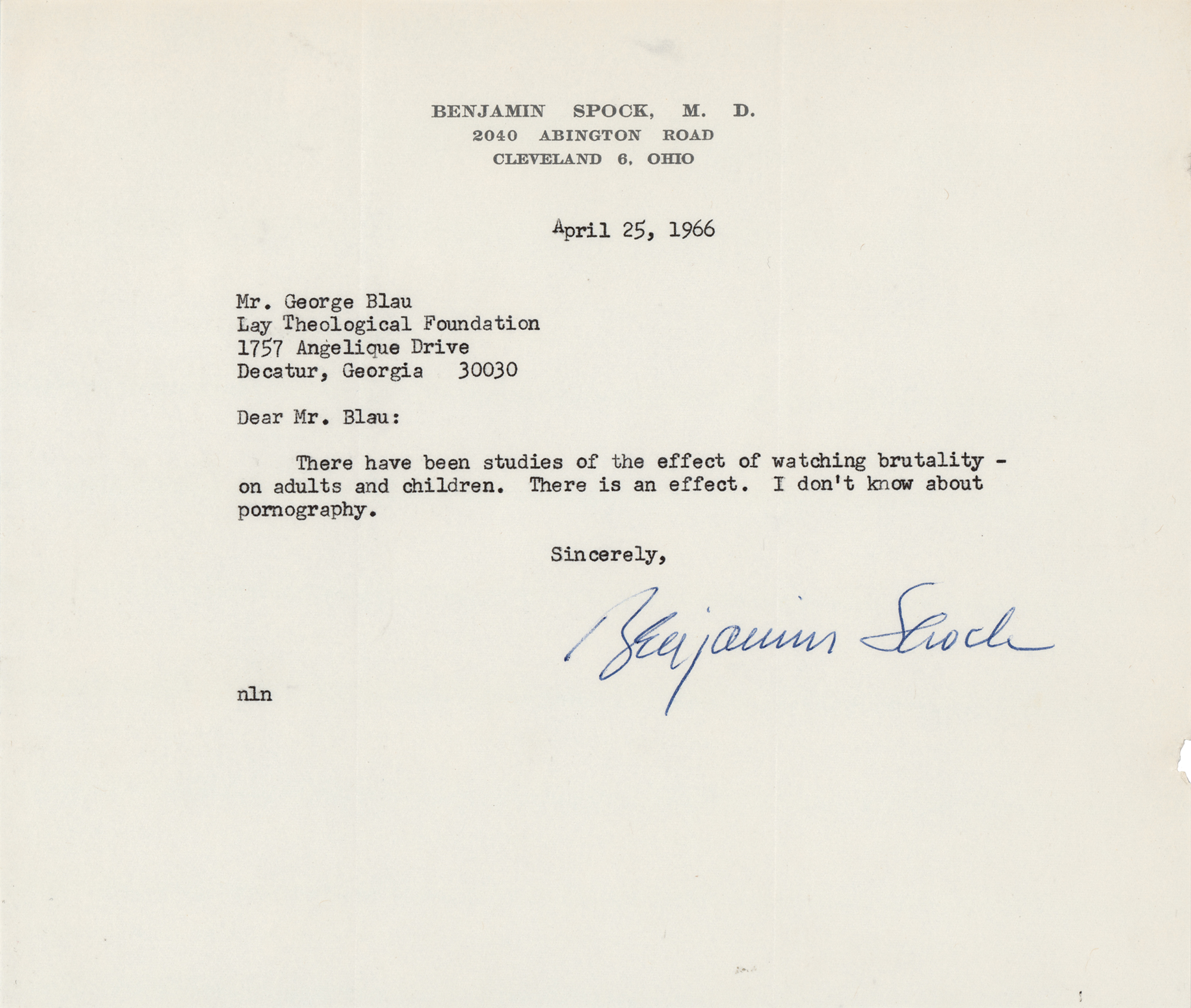 Baby doctor and best selling author (1903-1998) whose book Baby and Child Care, published in 1946, is one of the biggest bestsellers of all time. TLS, one page, 8.5 x 7.25, personal letterhead, April 25, 1966. Letter to George Blau of the Lay Theological Foundation, in full: "There have been studies of the effect of watching brutality—on adults and children. There is an effect. I don't know about pornography." In fine condition, with a small chip to the right edge.
