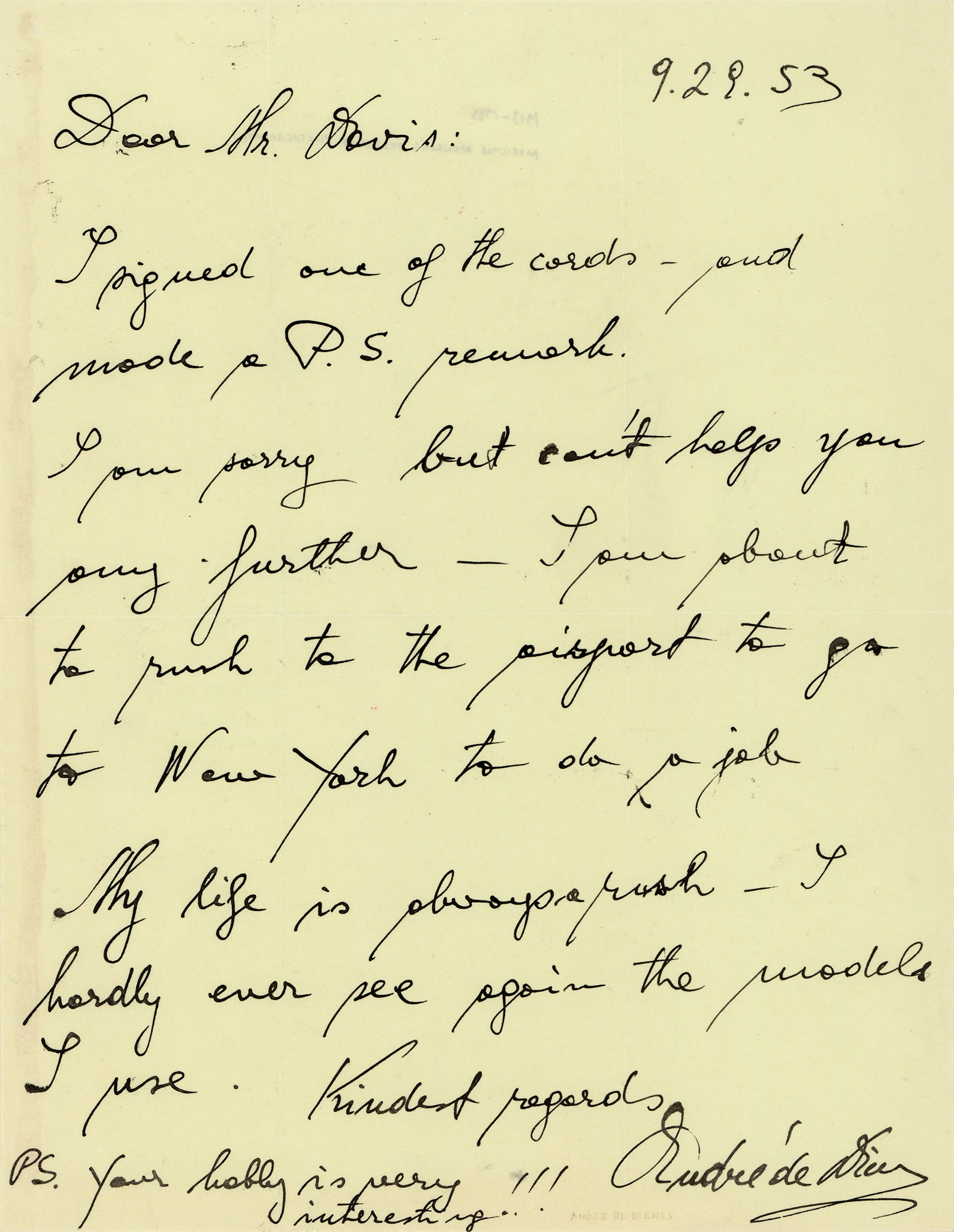 Fashion photographer (1913–1985) noted for his work with Marilyn Monroe and his nude photography. ALS, one page, 8.5 x 11, September 29, 1953. Handwritten letter to an autograph collector, in part: "I signed one of the cards—and made a P.S. remark. I am sorry but I can't help you any further—I am about to rush to the airport to go to New York to do a job. My life is always a rush—I hardly ever see again the models I use." In fine condition, with a thin stain along the left edge.
