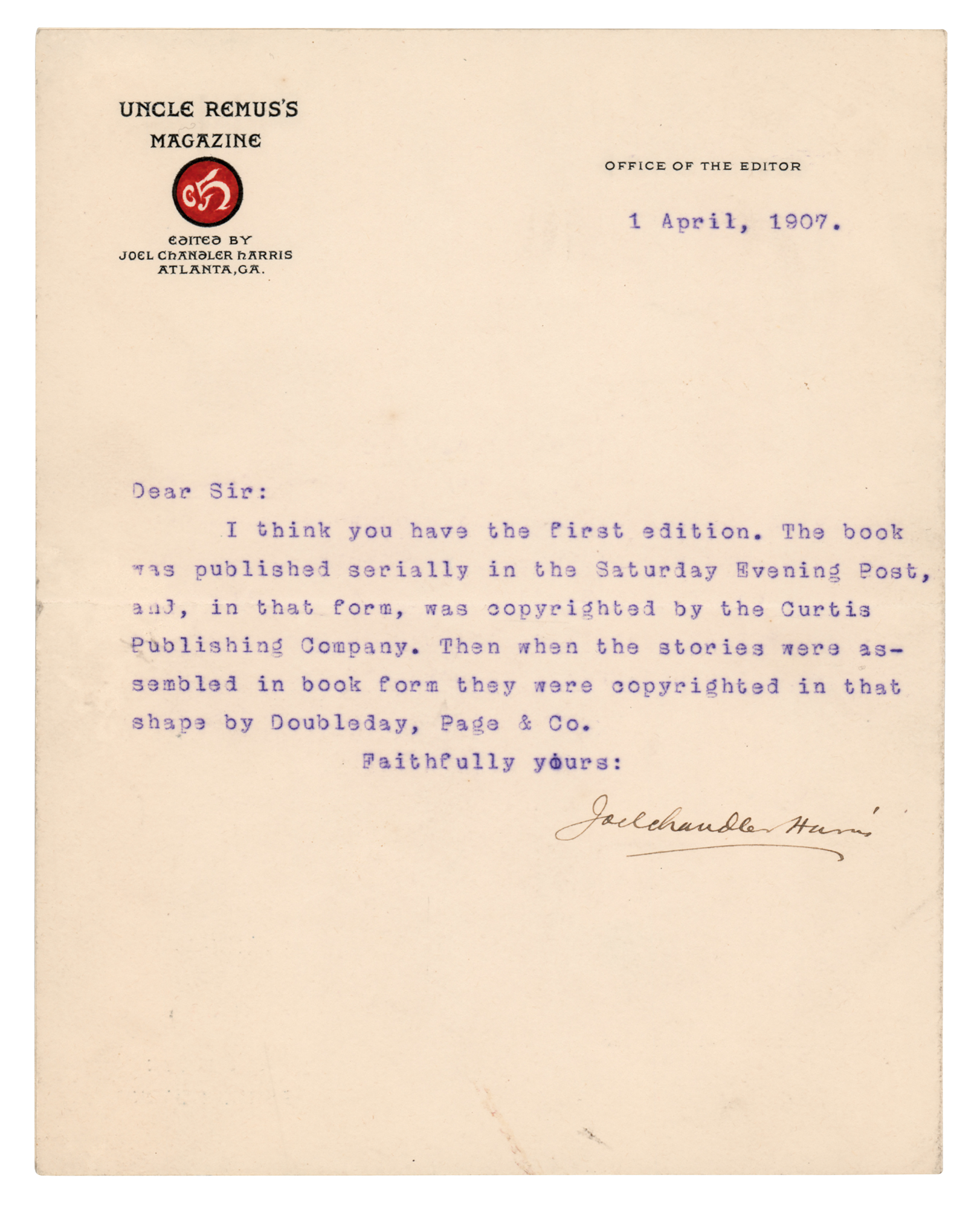 American author (1848-1908) best known for his 'Uncle Remus' stories. TLS, one page, 5.25 x 6.75, Uncle Remus's Magazine letterhead, April 1, 1907. Letter to a gentleman, in full: "I think you have the first edition. The book was published serially in the Saturday Evening Post, and, in that form, was copyrighted by the Curtis Publishing Company. Then when the stories were assembled in book form they were copyrighted in that shape by Doubleday, Page & Co." In fine condition.