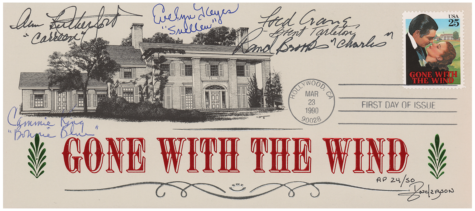 Large limited edition Gone With the Wind FDC, 9.5 x 4.25, numbered AP 24/50, bearing an engraved cachet depicting the family home of Scarlett O'Hara, signed in black and blue ink by five cast members from the film: "Ann Rutherford 'Carreen O'Hara,'" "Rand Brooks, 'Charles,'" "Fred Crane, Brent Tarleton," "Evelyn Keyes, 'Suellen,'" and "Cammie King, 'Bonnie Blue.'" In very fine condition.
