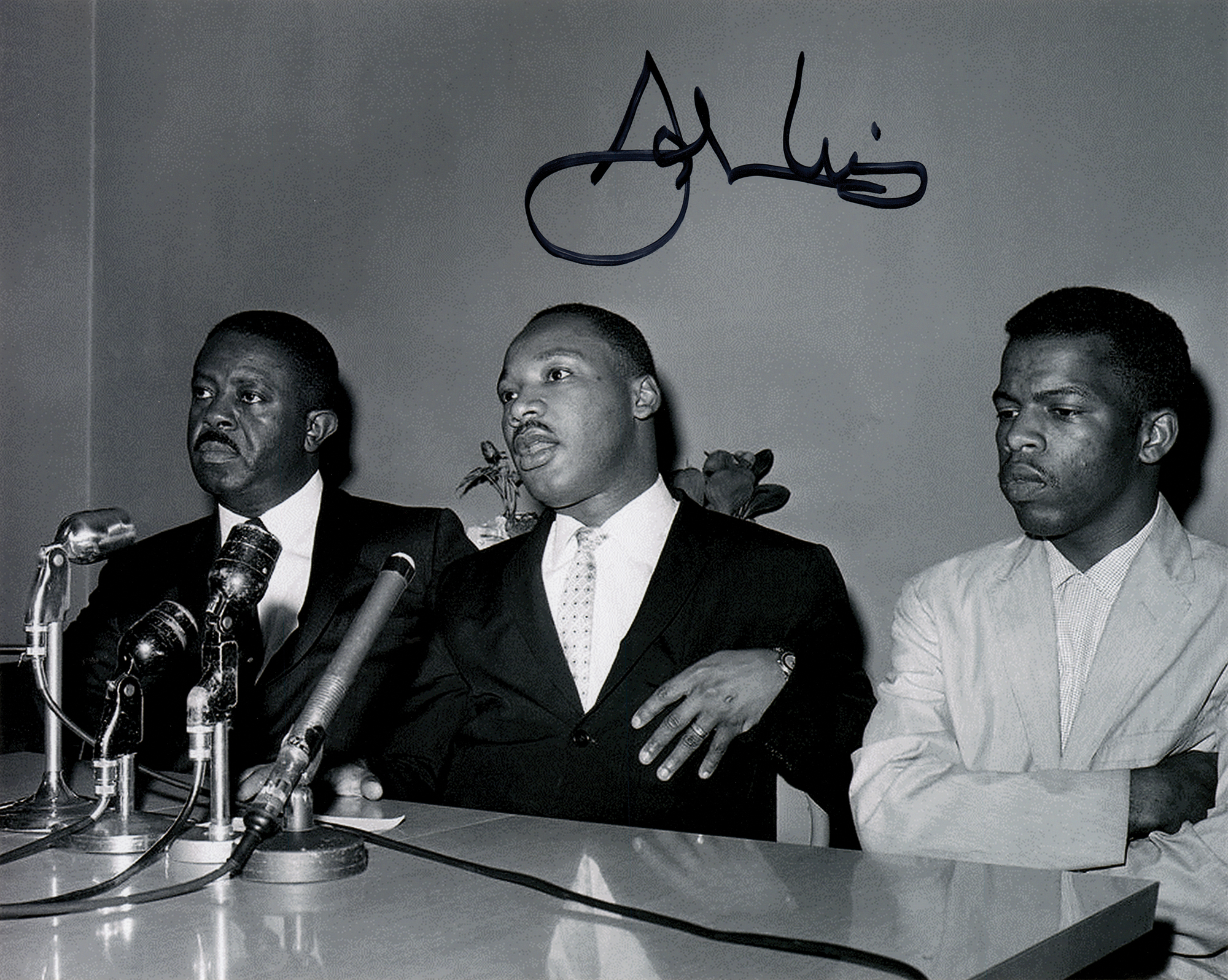 American politician and civil rights leader (1940–2020) who as Chairman of the SNCC was one of the 'Big Six' leaders who organized the 1963 March on Washington, and who led the famed march across the Edmund Pettus Bridge from Selma to Montgomery (now known as 'Bloody Sunday'), which sped up the passage of 1965’s Voting Rights Act. Satin-finish 10 x 8 photo of John Lewis beside Martin Luther King, Jr., signed in black felt tip by Lewis. In very fine condition.