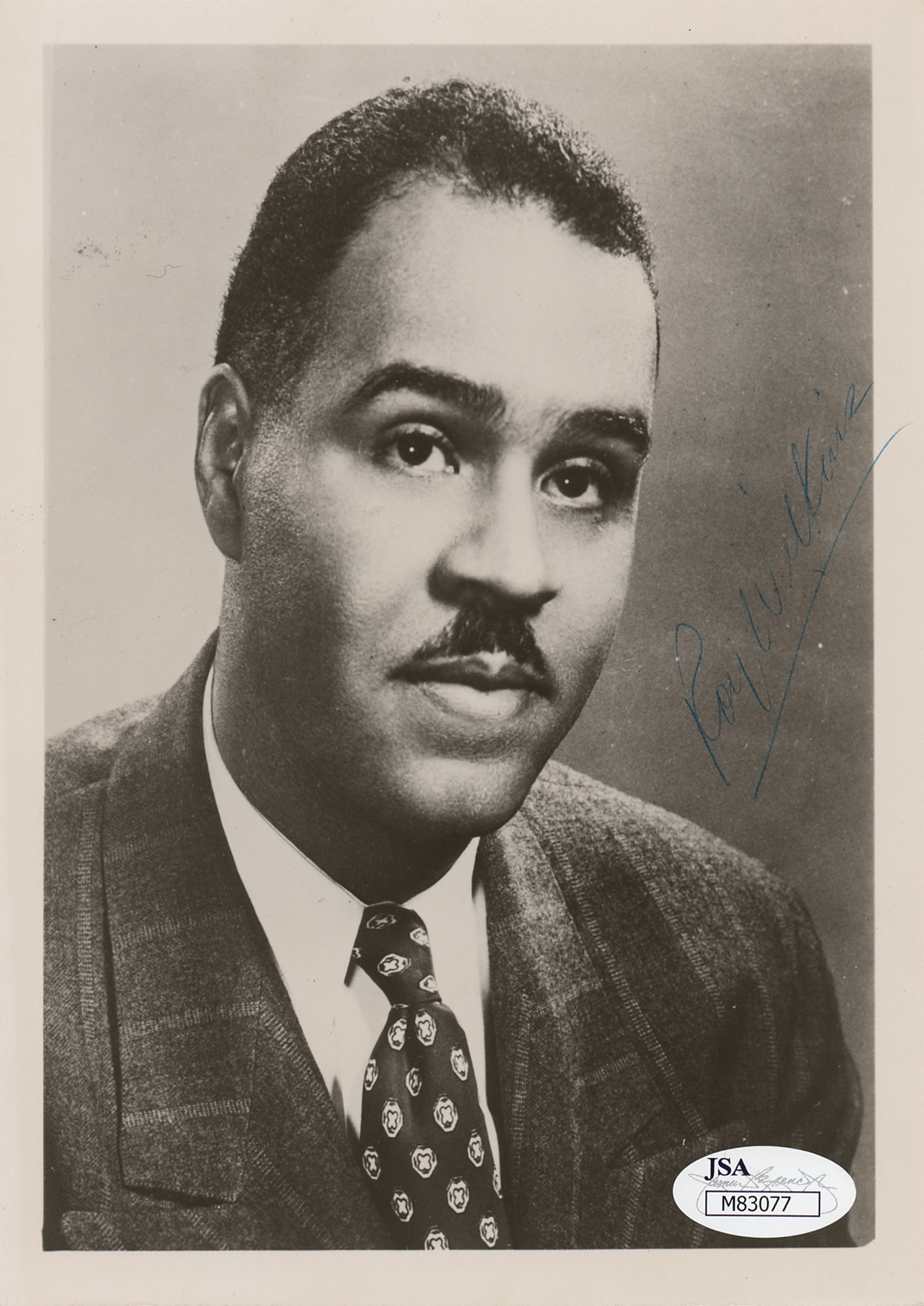 American leader of the Civil Rights Movement (1901-1981) who was active in the NAACP. Glossy 5 x 7 head-and-shoulders photo of Roy Wilkins in a suit and tie, signed in blue ballpoint. In fine condition, with a JSA label affixed to the lower corner (certificate of authenticity not present).