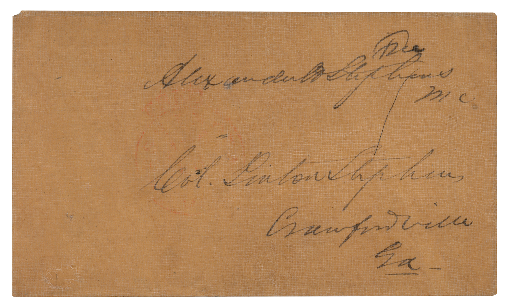 Vice president of the Confederacy under Jefferson Davis (1812-1883). Free franked mailing envelope, 5.75 x 3.25, addressed by Stephens to his brother, "Col. Linton Stephens, Crawfordville, Ga.," and franked in the upper right, "Free, Alexander H. Stephens, M.C." In fine condition, with complete overall silking.