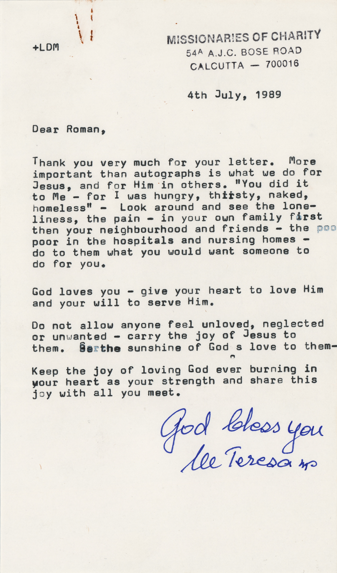 TLS signed “God bless you, M Teresa mc,” one page, 5 x 8.5, stamped Missionaries of Charity letterhead, July 4, 1989. Letter to an autograph collector, in part: "More important than autographs is what we do for Jesus, and for Him in others. 'You did it to Me—for I was hungry, thirsty, naked, homeless'—Look around and see the loneliness, the pain—in your own family first then your neighbourhood and friends—the poor in the hospitals and nursing homes—do to them what you would want someone to do for you. God loves you—give your heart to love Him and your will to serve Him. Do not allow anyone to feel unloved, neglected or unwanted—carry the joy of Jesus to them…Keep the joy of loving God ever burning in your heart as your strength and share this joy with all you meet." In fine condition, with a rusty paperclip impression to the top edge.