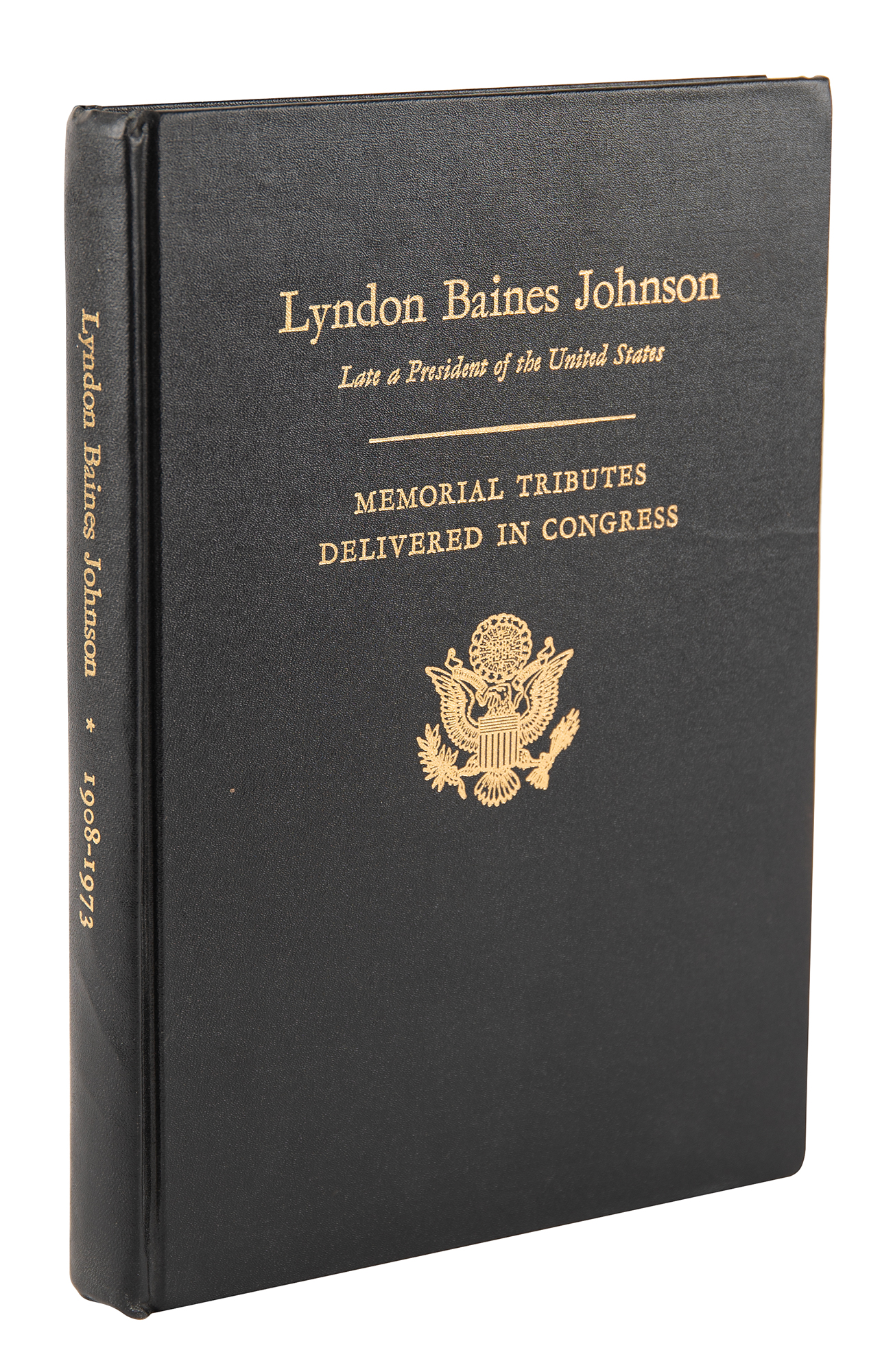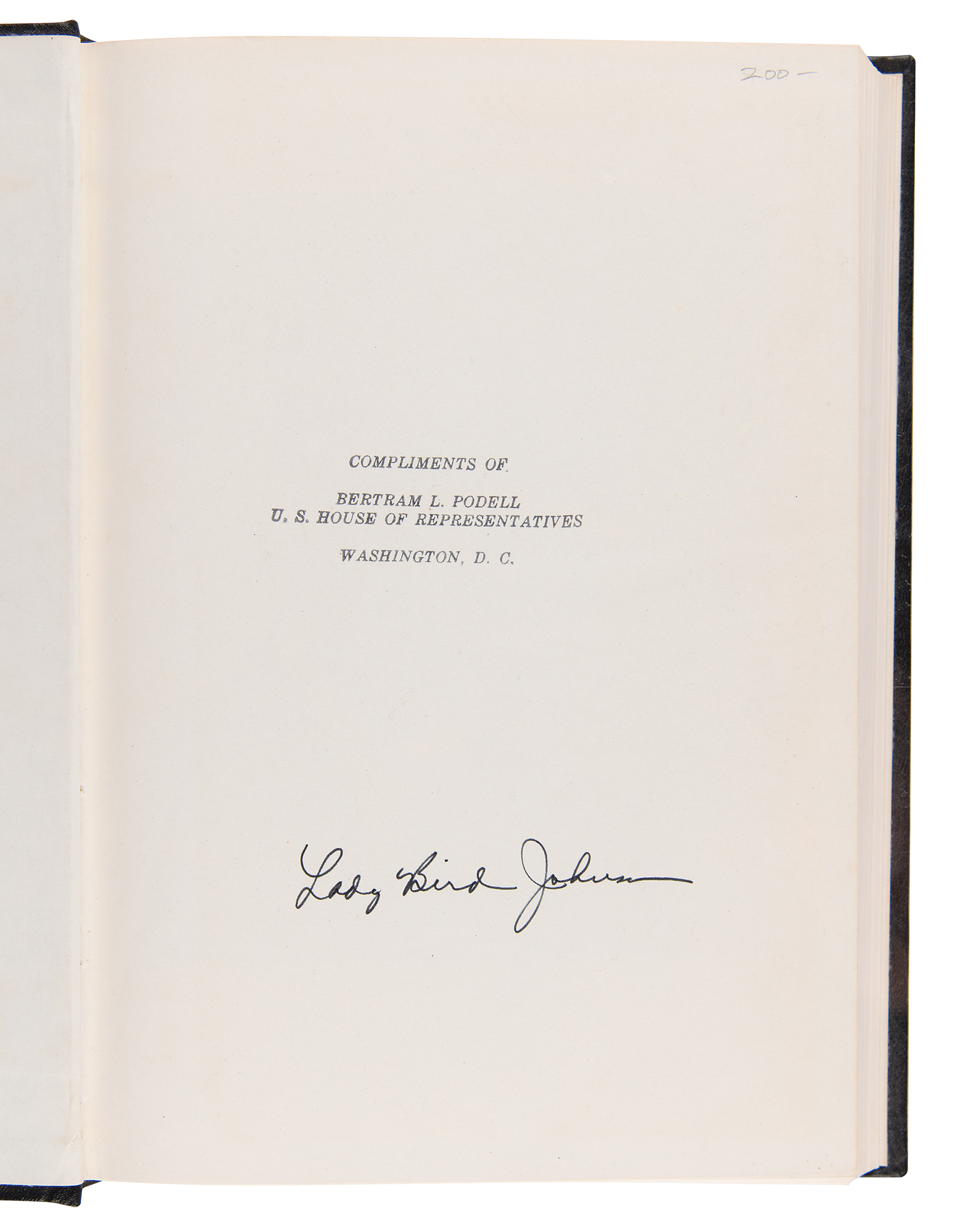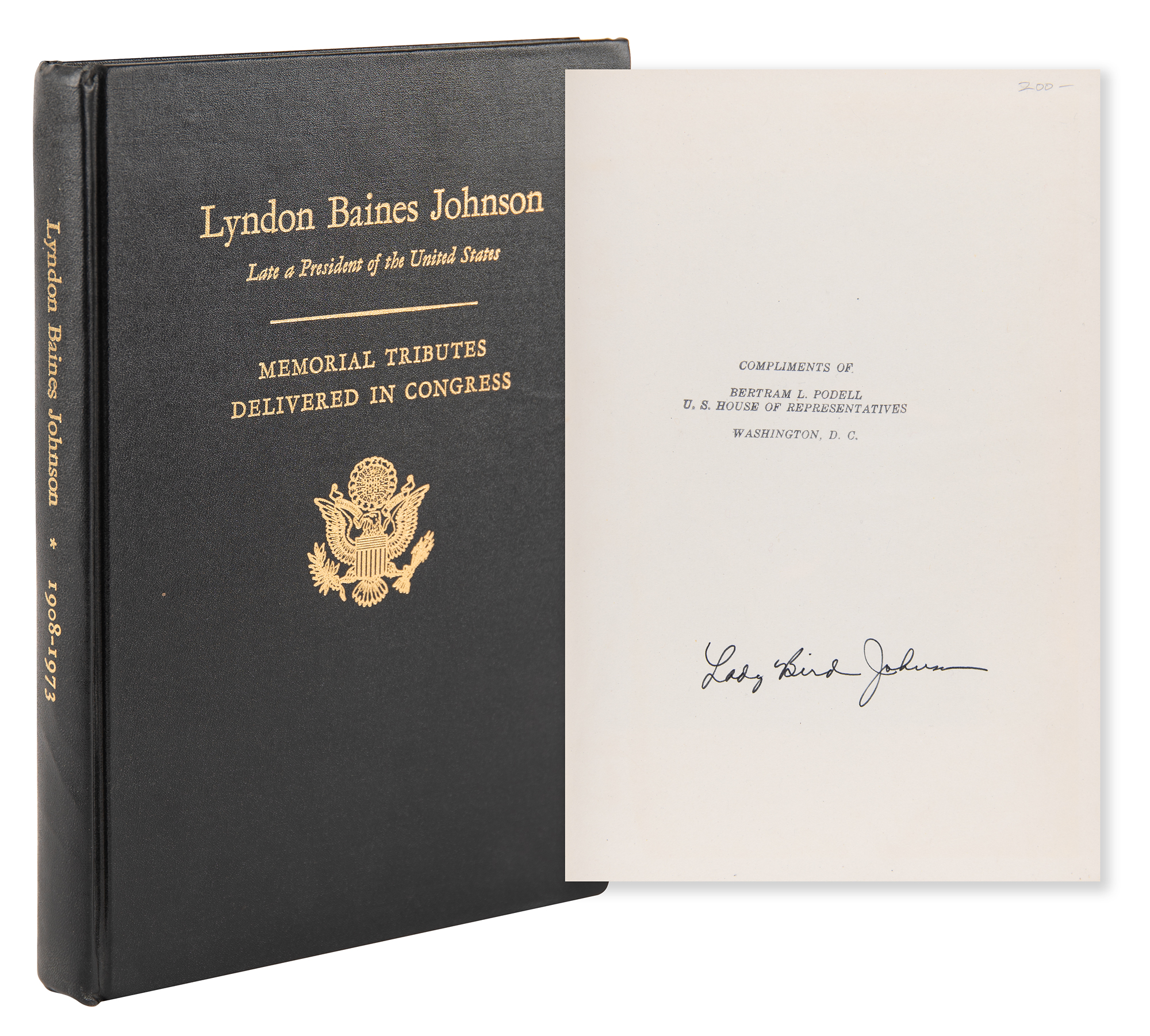 Signed book: Memorial Services in the Congress of the United States and Tributes in Eulogy of Lyndon Baines Johnson. First edition. Washington, DC: Government Printing Office, 1973. Hardcover, 7.5 x 10.5, 285 pages. Signed on the first free end page in black felt tip, "Lady Bird Johnson," below an ink stamp: "Compliments of Bertram L. Podell, U.S. House of Representatives, Washington, D.C." In fine condition, with some light creasing at the bottom of the spine.
