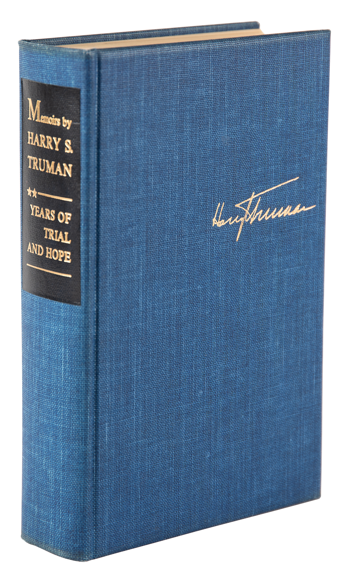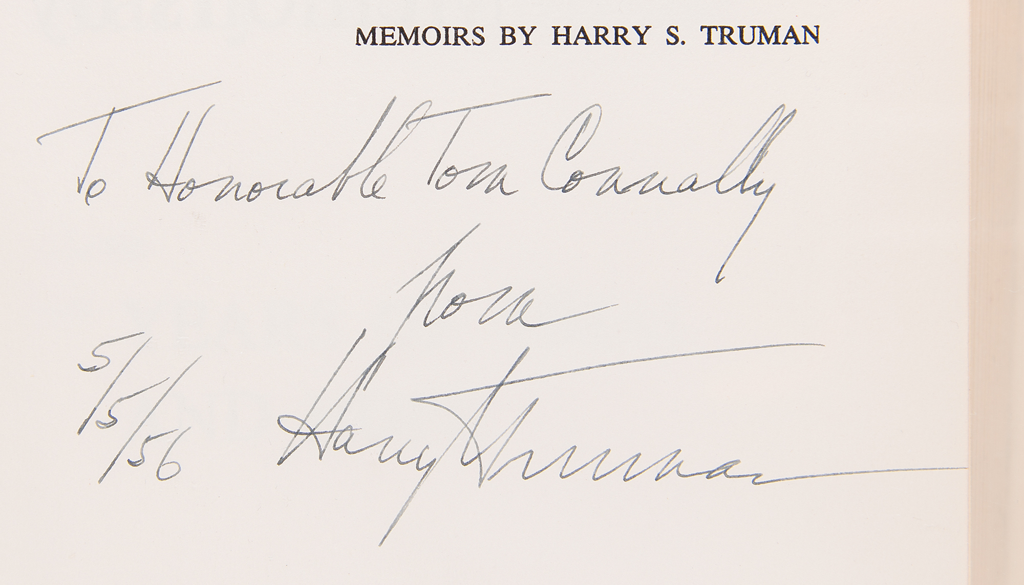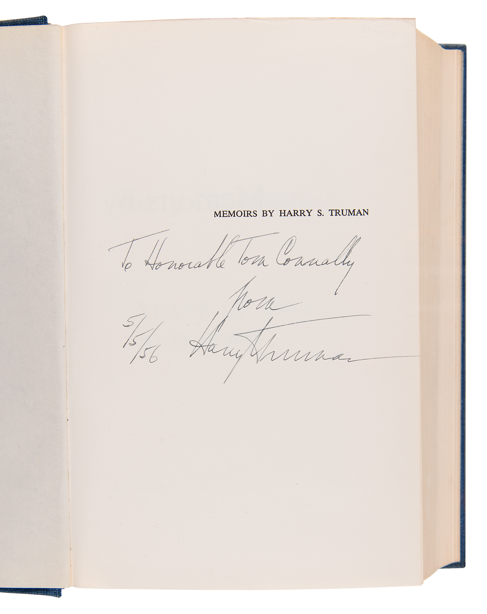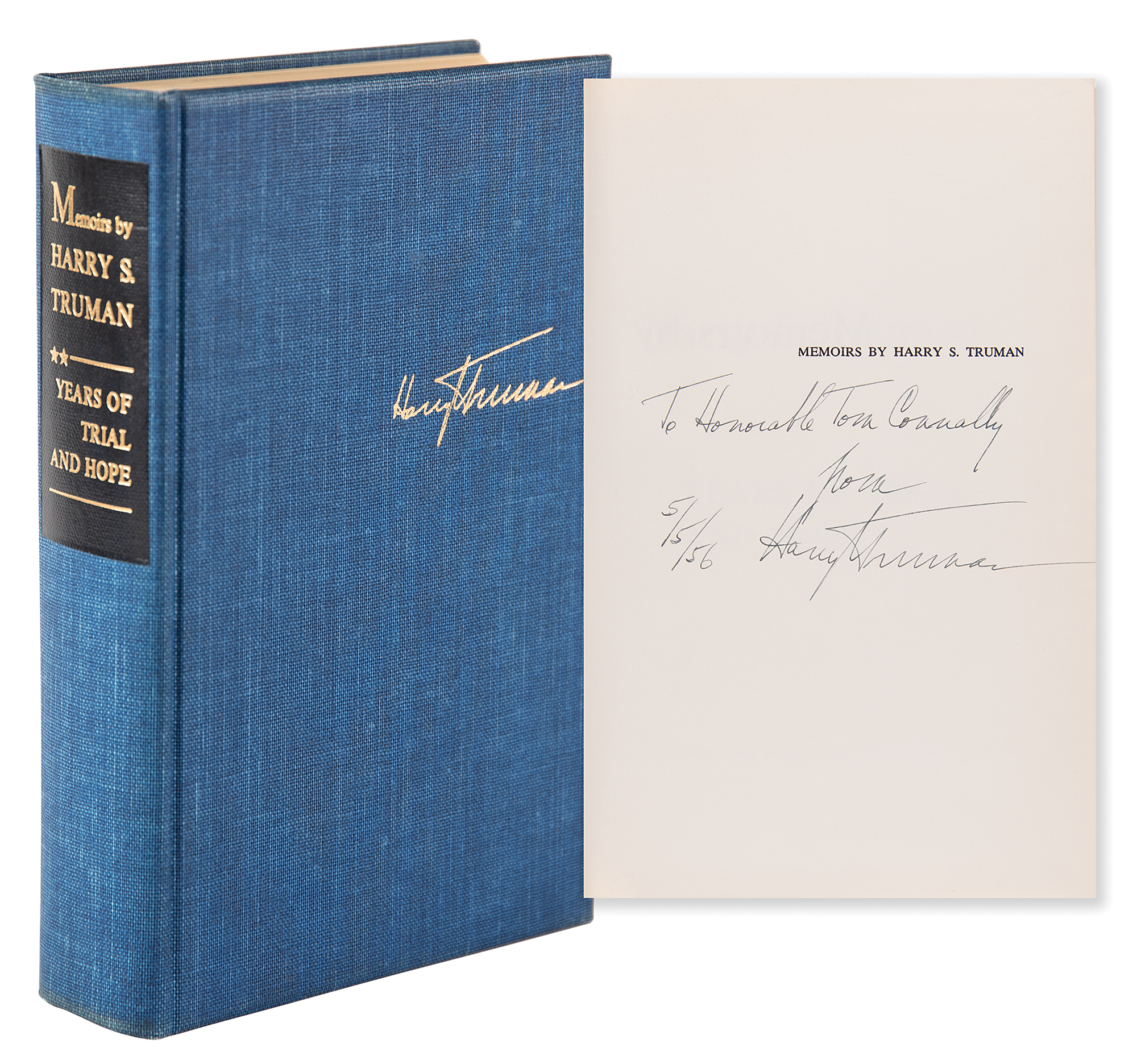 Signed book: Memoirs by Harry S. Truman, Volume Two: Years of Trial and Hope. Special deluxe limited edition of 500 unnumbered copies, bound in blue cloth with top edge gilt. Garden City, NY: Doubleday & Company, 1956. Hardcover with acetate jacket, 6.25 x 9.5, 594 pages. Signed and inscribed on the half-title page in fountain pen, "To Honorable Tom Connally, from Harry S. Truman, 5/5/56." In fine condition.