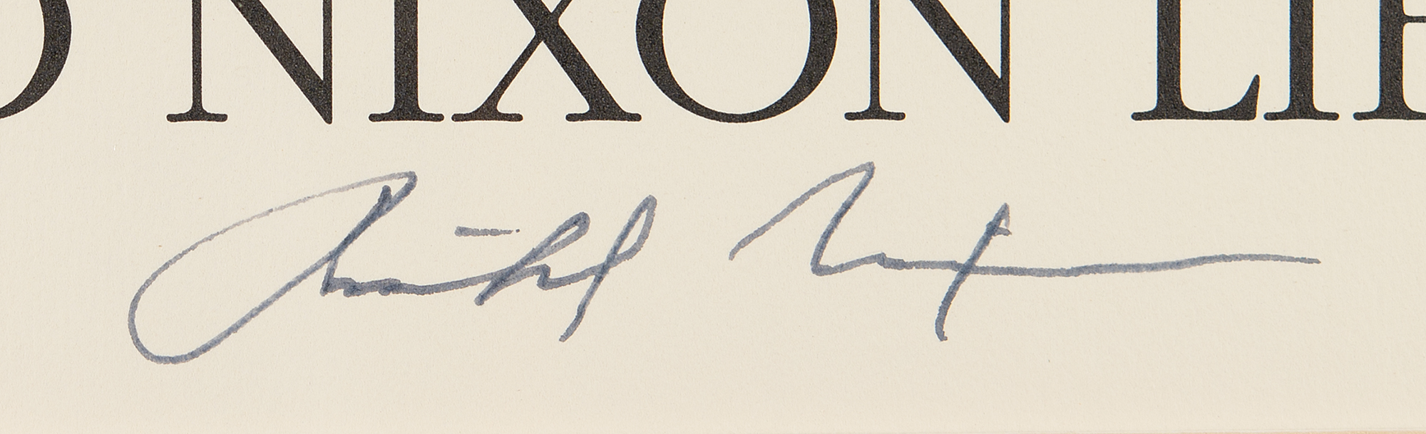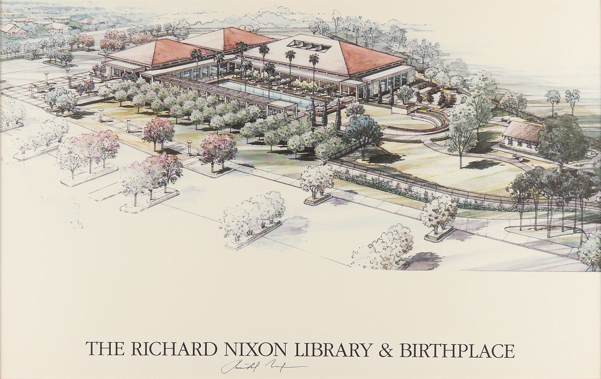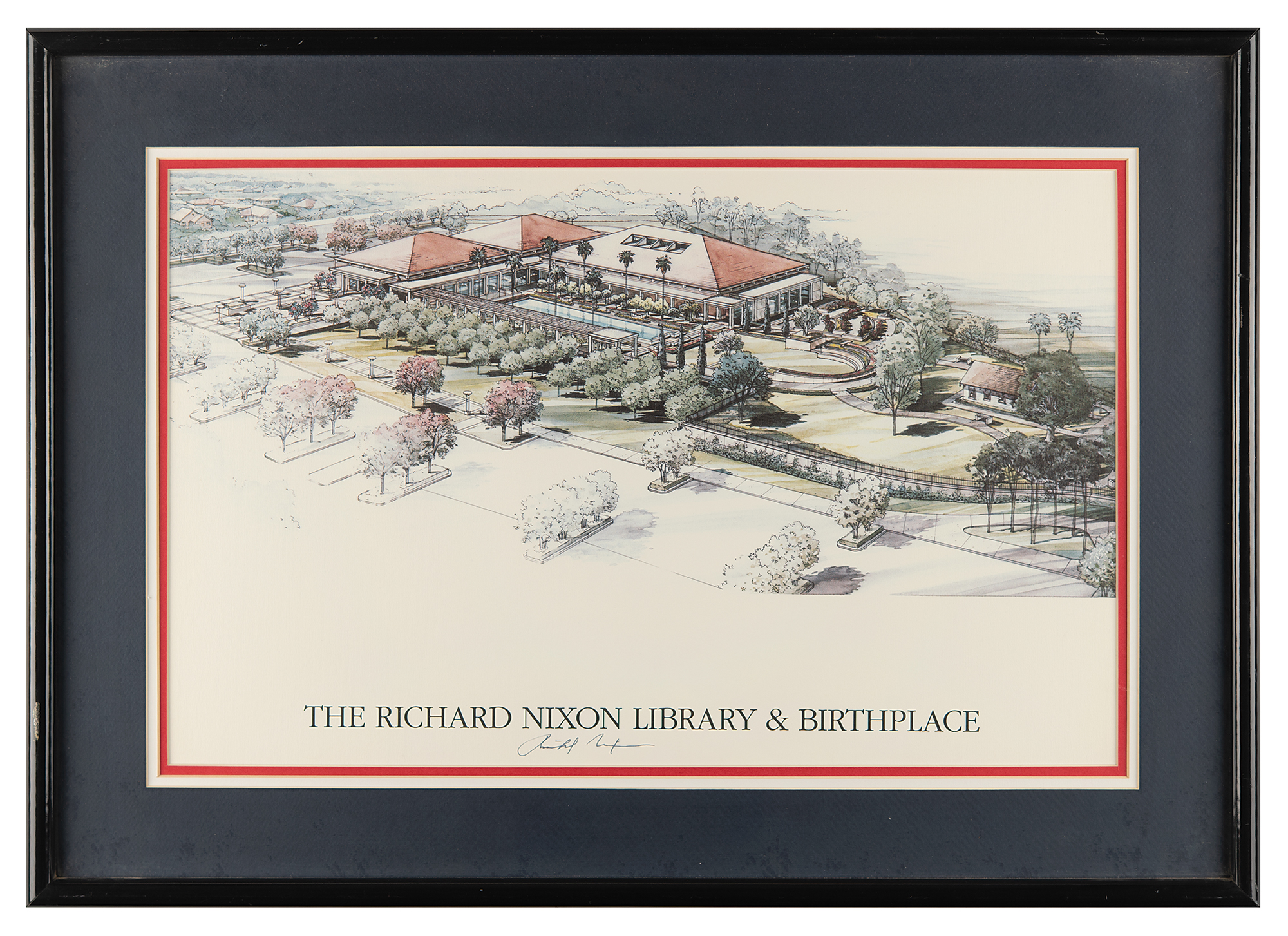 Color 21.5 x 13.5 print of concept artwork showing the Richard Nixon Library & Birthplace in Yorba Linda, California, signed in black felt tip by Richard Nixon. Nicely triple-matted and framed to an overall size of 28 x 20. In fine condition.