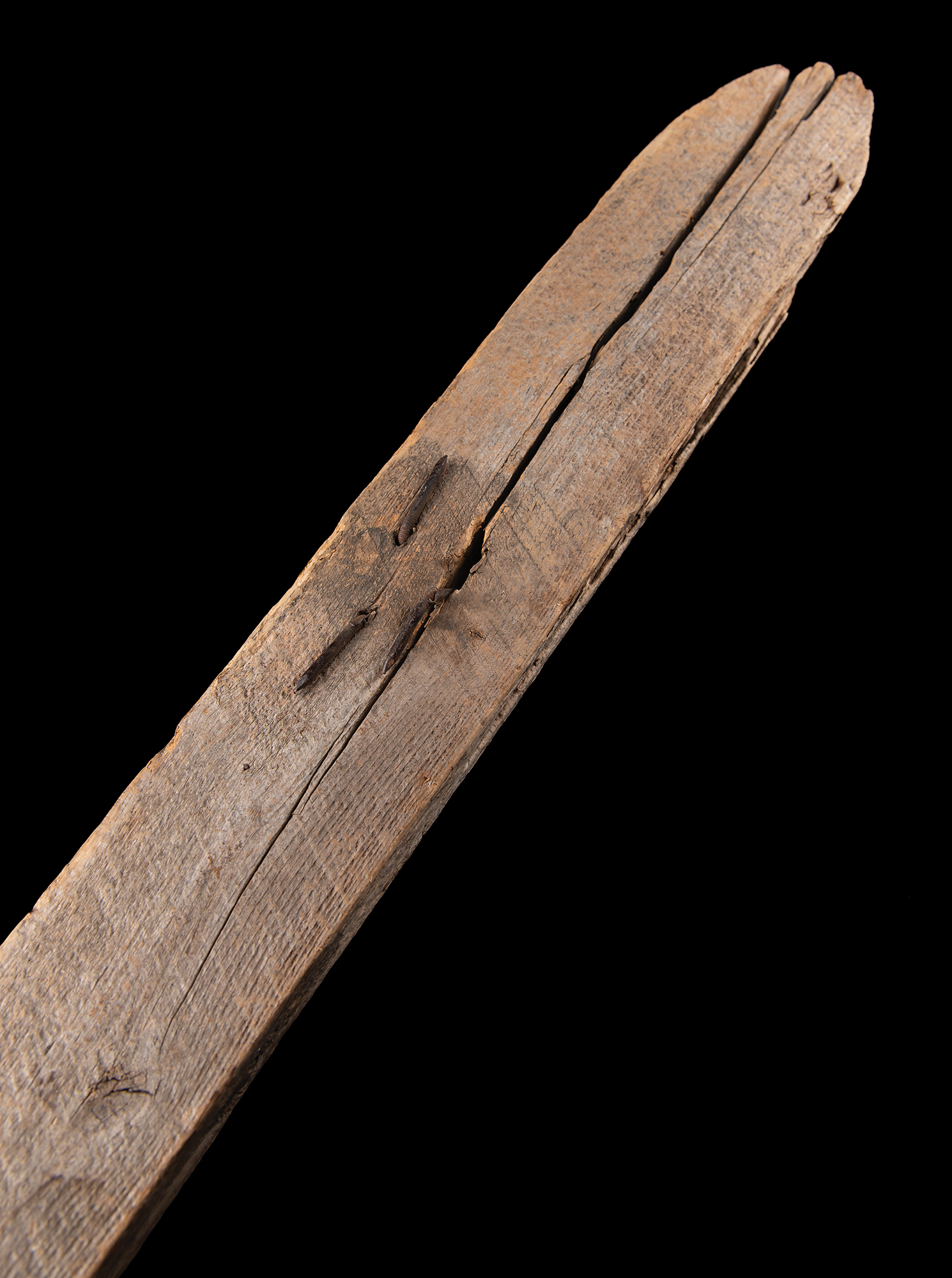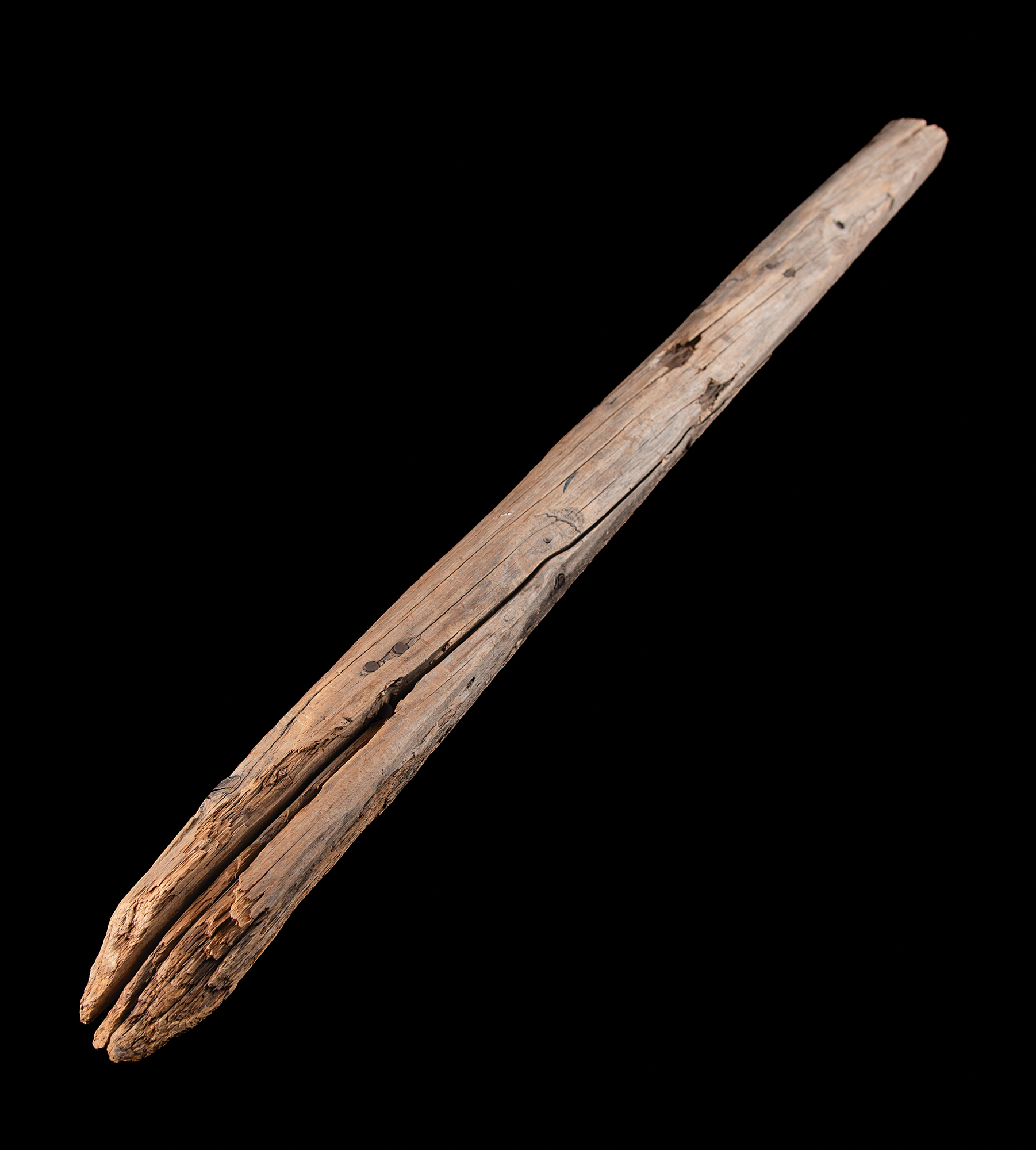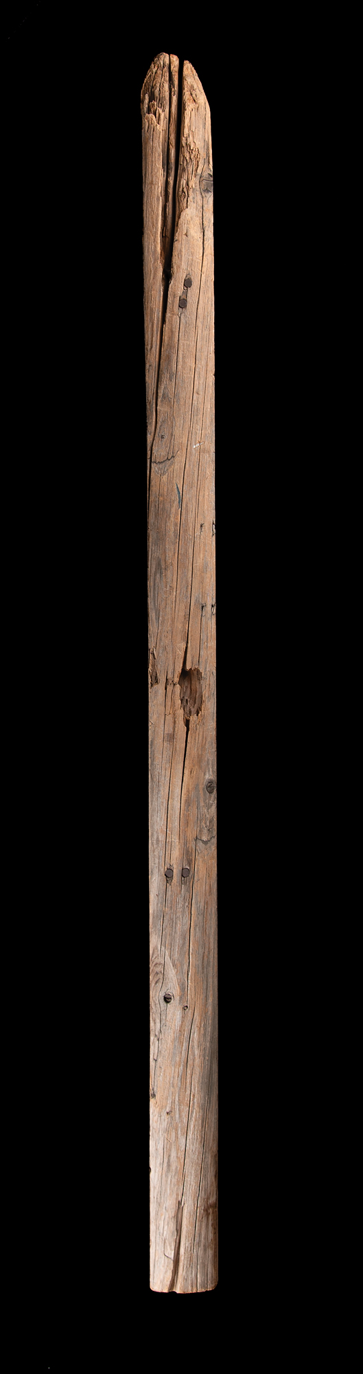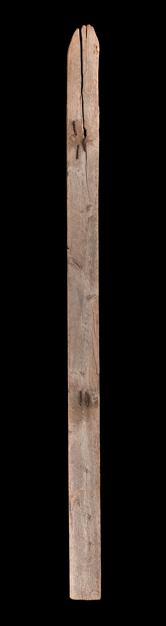Wooden fence picket from the infamous 'grassy knoll' at Dealey Plaza in Dallas, which separated the plaza from the Missouri, Kansas, and Texas Railroad yards, overlooked the route of Kennedy's motorcade, and figures prominently in many assassination conspiracy theories. The post measures 44˝ in length and 2.5˝ across and features a total of five nails to upper and middle sections. In very good to fine condition, with expected overall wear, and a sawed-off bottom section. This fence picket is indisputably from the grassy knoll. Over the years many of the original fence’s individual wooden pickets were removed by souvenir hunters and later replaced. This example boasts rusted nails of the correct vintage and traces of white paint with appropriate surface wear.